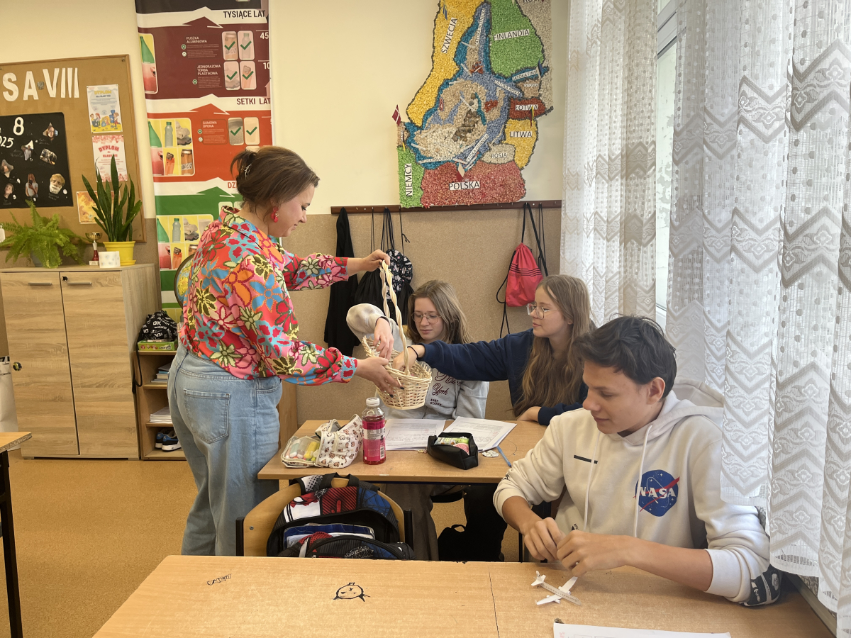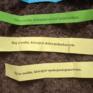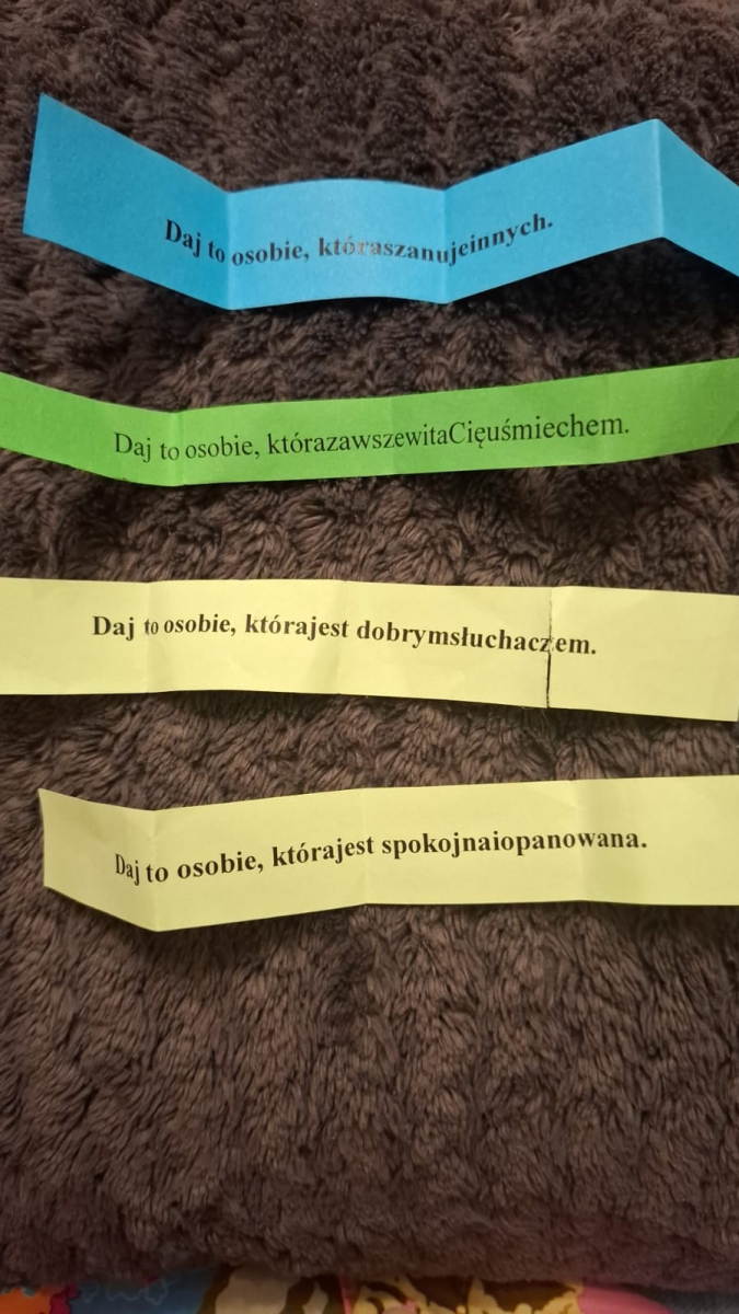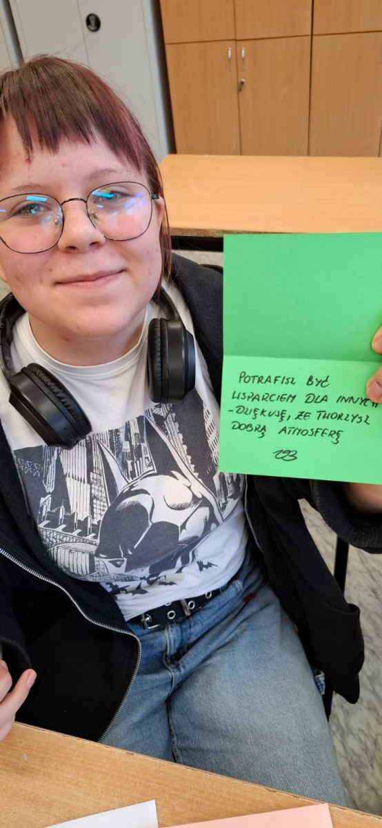 Podczas przerw uczniowie brali udział w krótkich aktywnościach opartych na hasłach „Daj to osobie, która…” oraz „Miłe słowa – miłe gesty”, dzięki którym mogli okazywać sobie sympatię i budować pozytywne relacje.