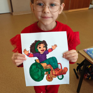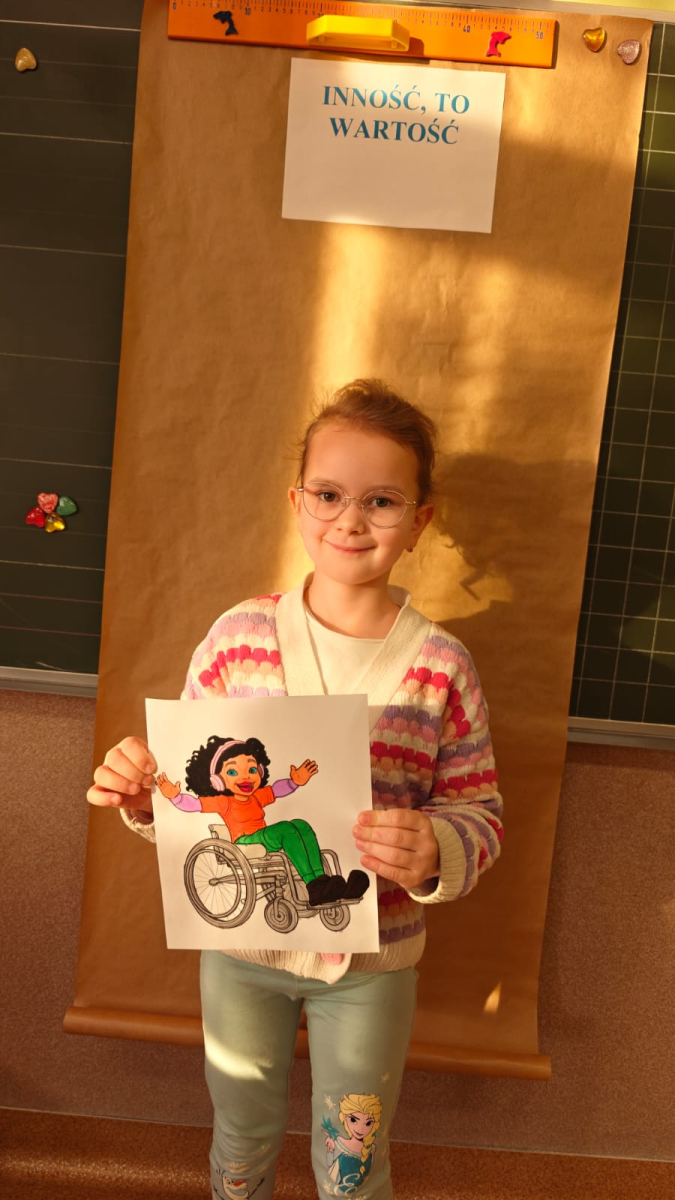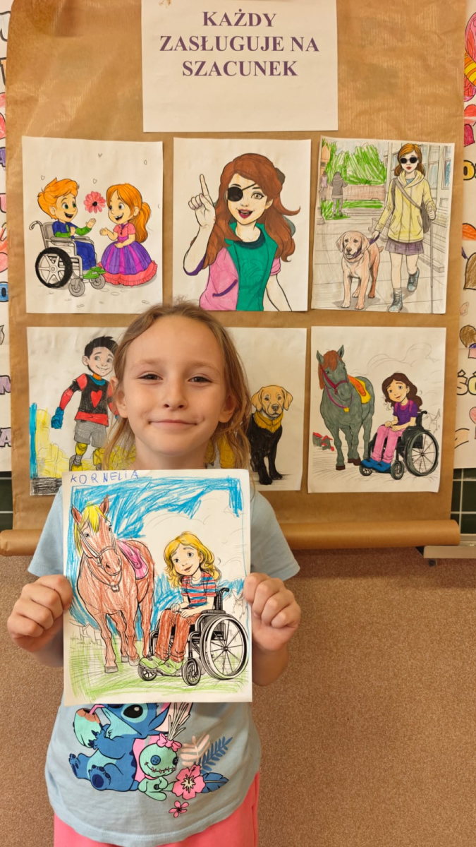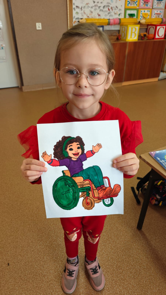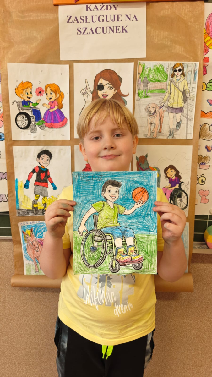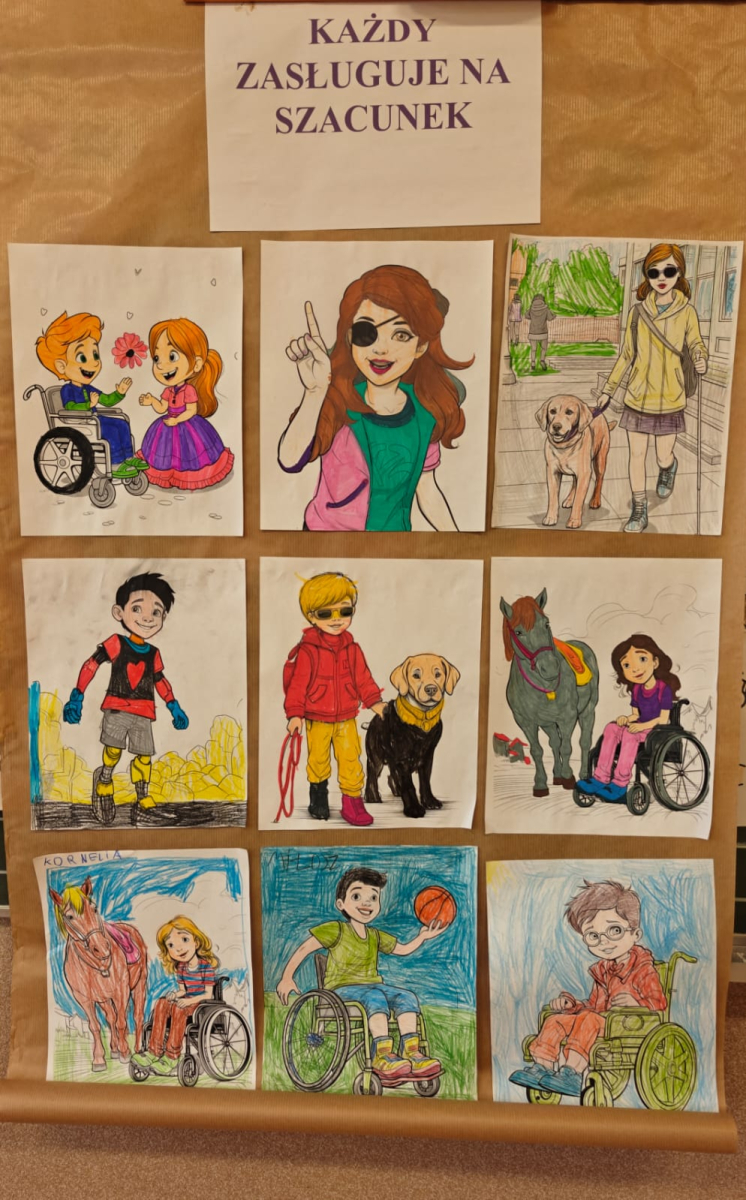 Z tej okazji uczniowie klas I–III przygotowali kolorowanki przedstawiające różnorodne osoby, m.in. ludzi poruszających się na wózku inwalidzkim, niewidzących czy wymagających różnego rodzaju wsparcia.