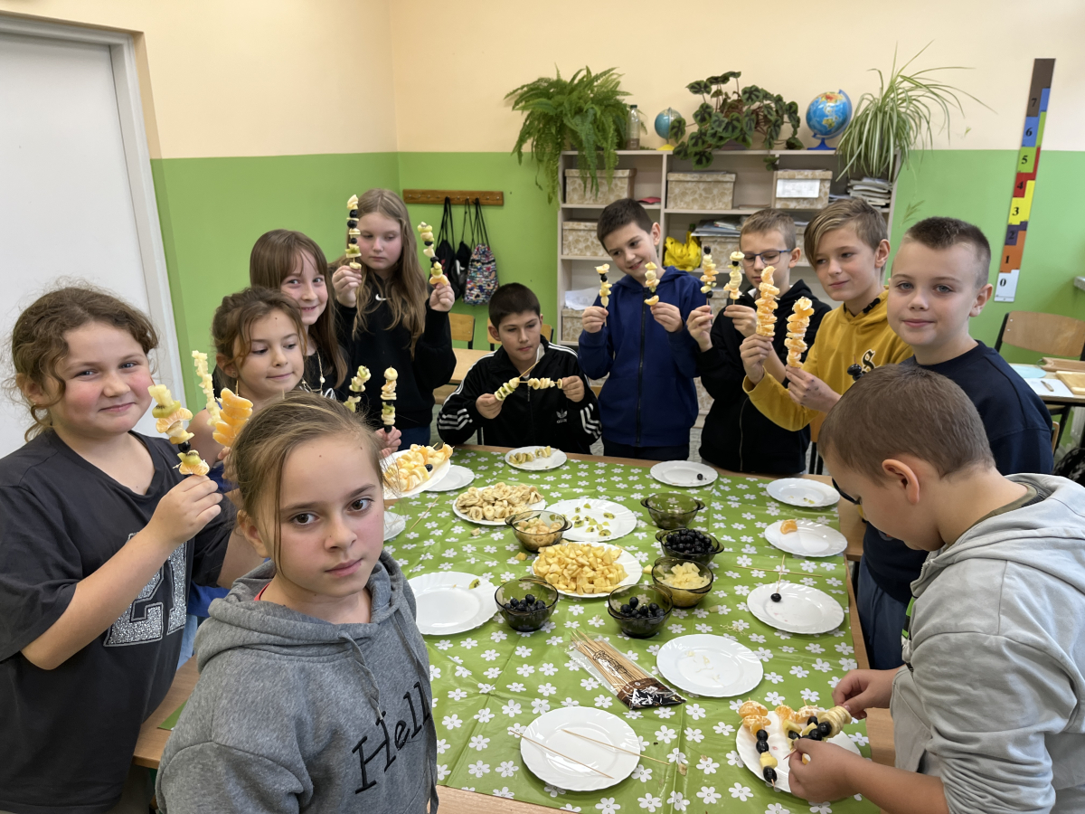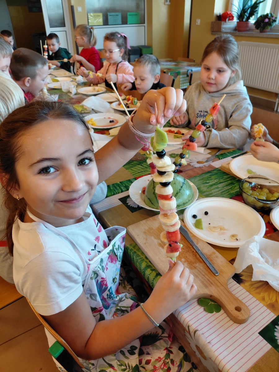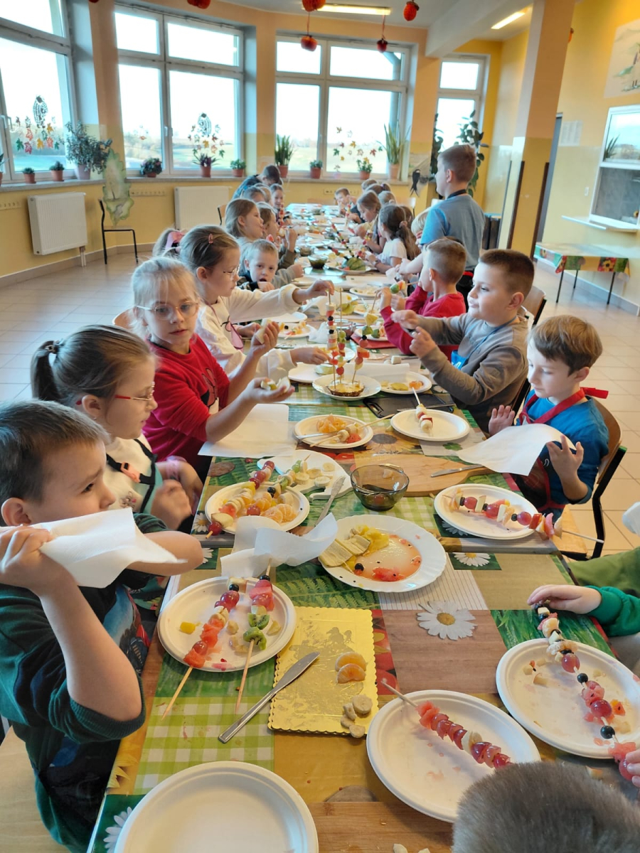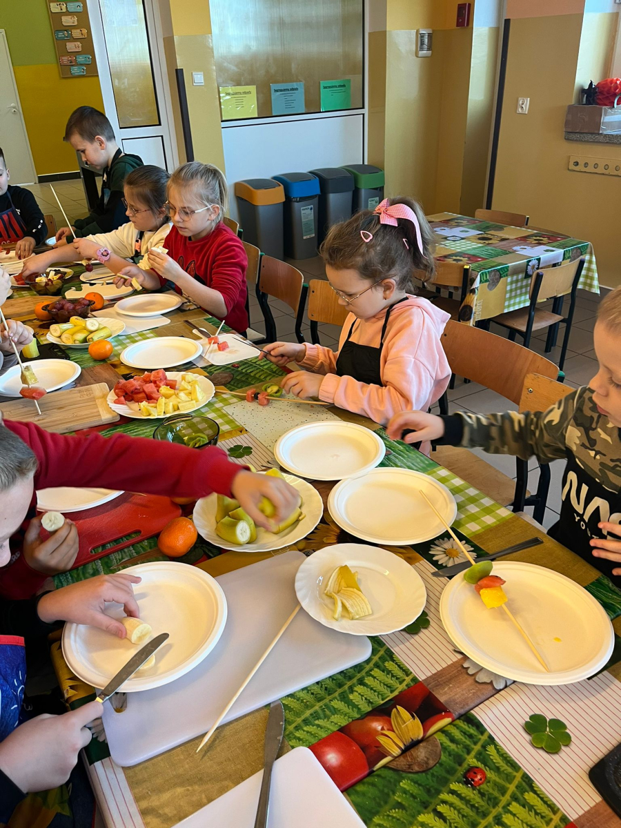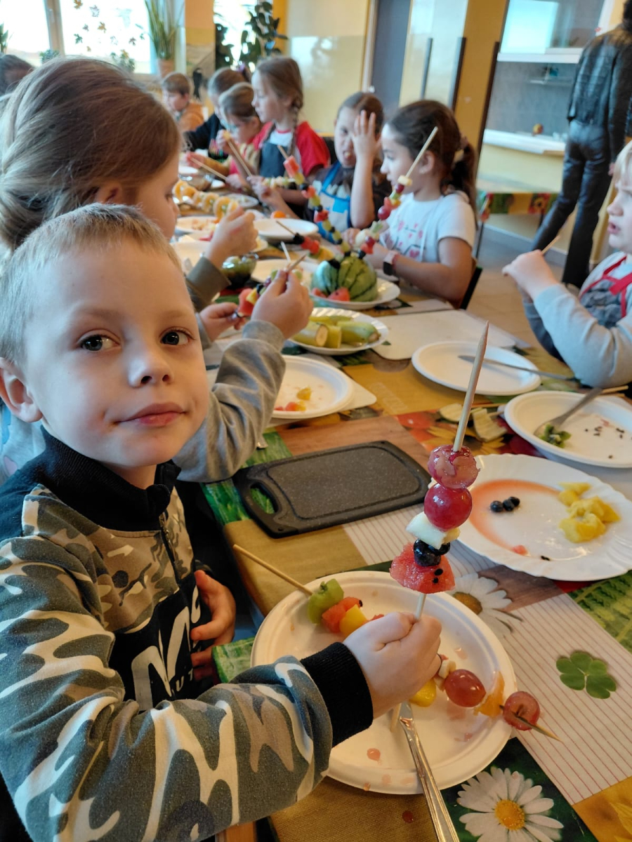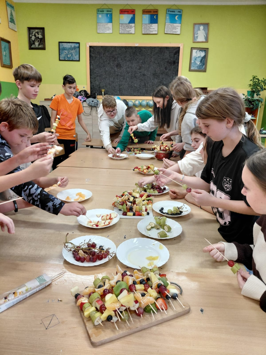 Dzisiaj świętowaliśmy Dzień Zdrowego Odżywiania i… było przepysznie! Przedszkolaki robiły zdrowe kanapki, w klasach zaś dzieci przygotowywały kolorowe, smaczne i zdrowe przekąski – szaszłyki owocowe i warzywne, które znikały szybciej niż zdążyliśmy je fotografować.