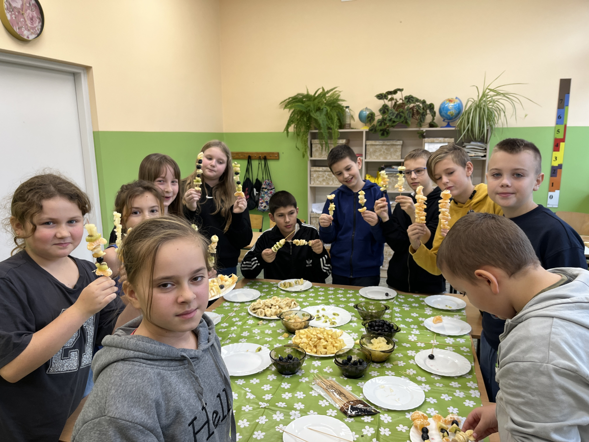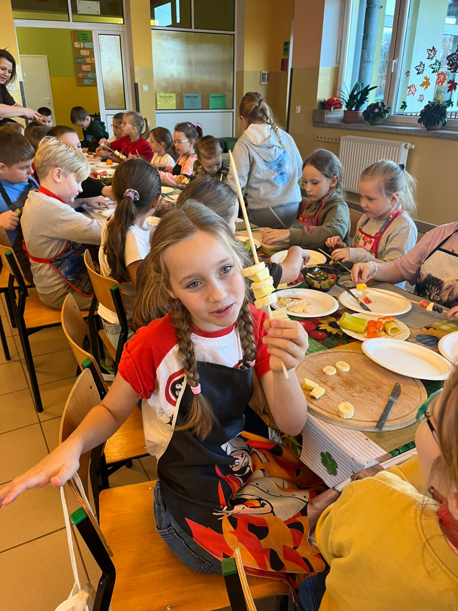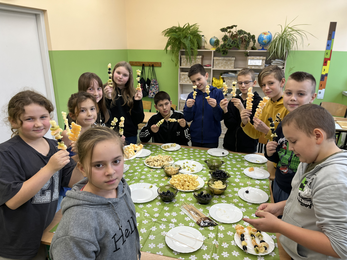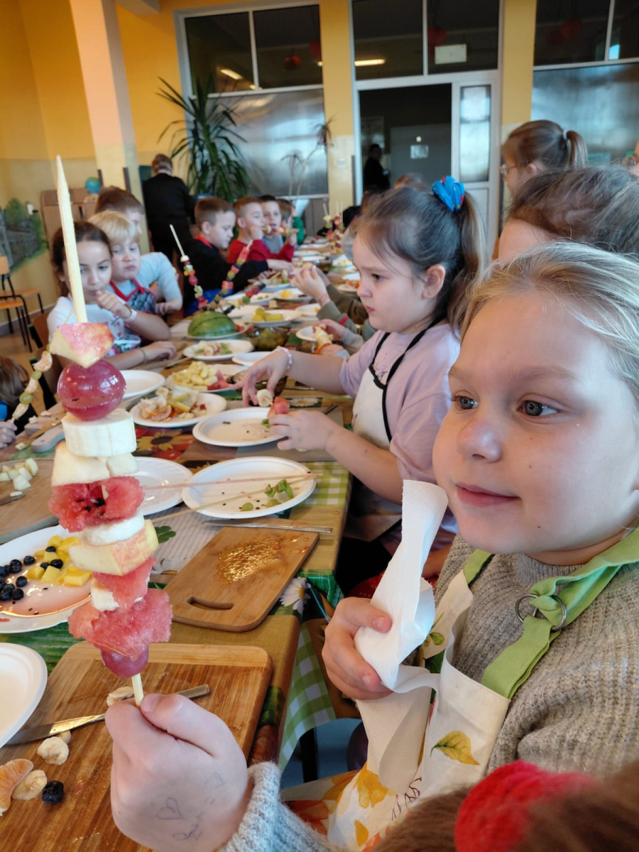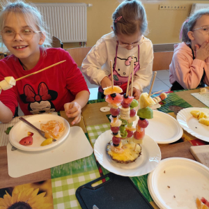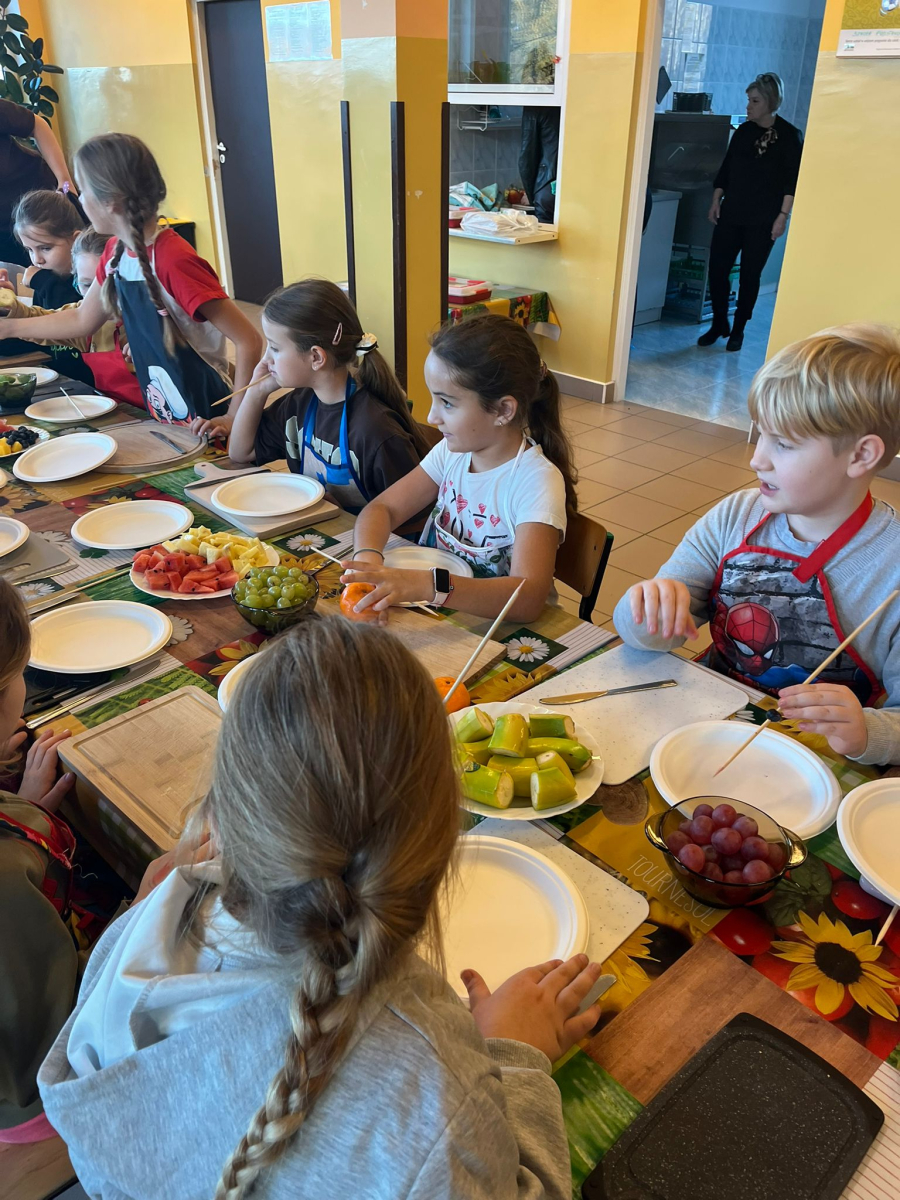 Dzisiaj świętowaliśmy Dzień Zdrowego Odżywiania i… było przepysznie! Przedszkolaki robiły zdrowe kanapki, w klasach zaś dzieci przygotowywały kolorowe, smaczne i zdrowe przekąski – szaszłyki owocowe i warzywne, które znikały szybciej niż zdążyliśmy je fotografować.