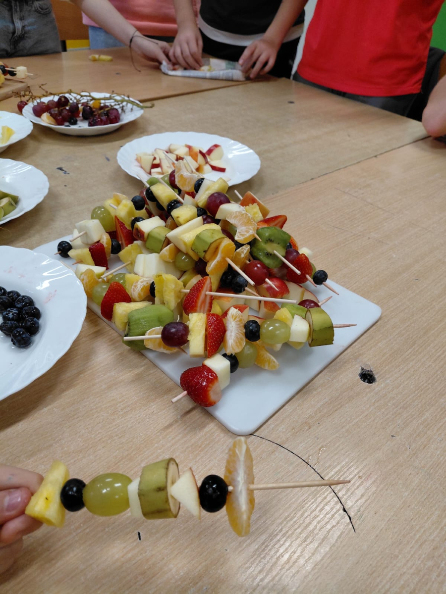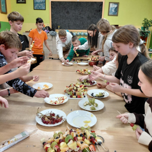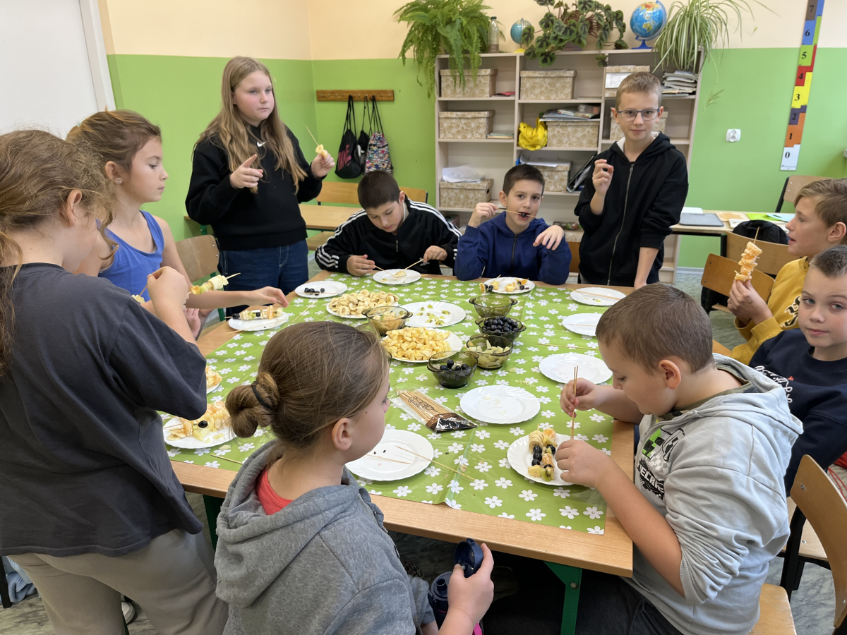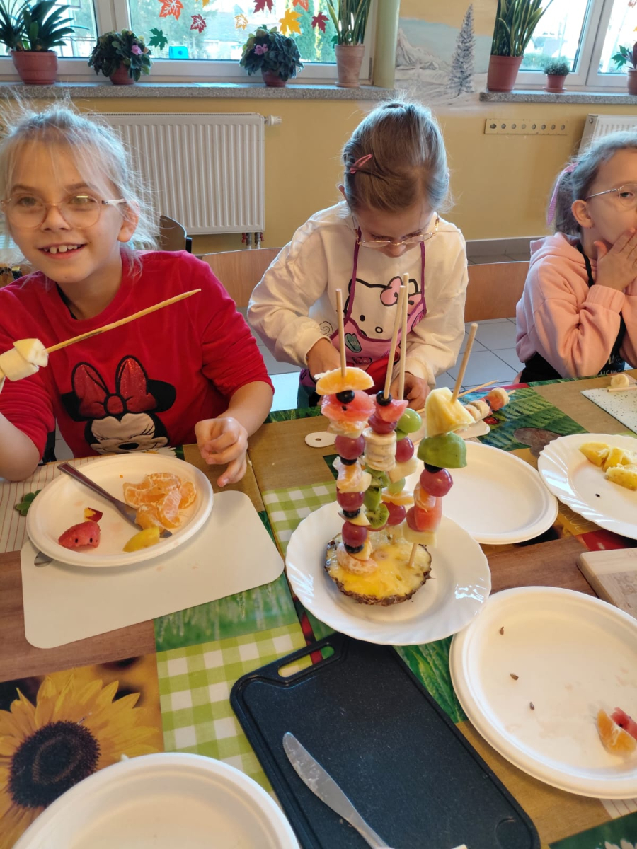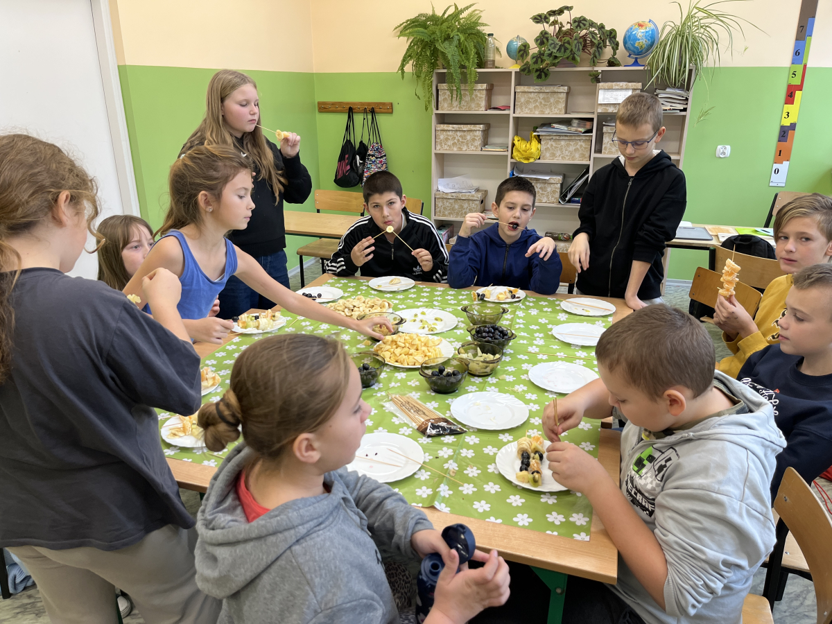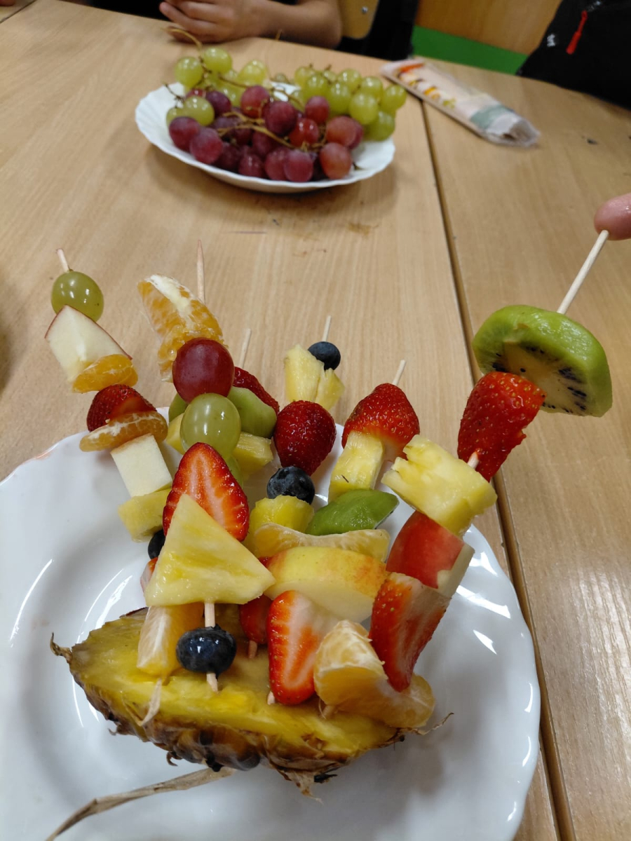 Dzisiaj świętowaliśmy Dzień Zdrowego Odżywiania i… było przepysznie! Przedszkolaki robiły zdrowe kanapki, w klasach zaś dzieci przygotowywały kolorowe, smaczne i zdrowe przekąski – szaszłyki owocowe i warzywne, które znikały szybciej niż zdążyliśmy je fotografować.