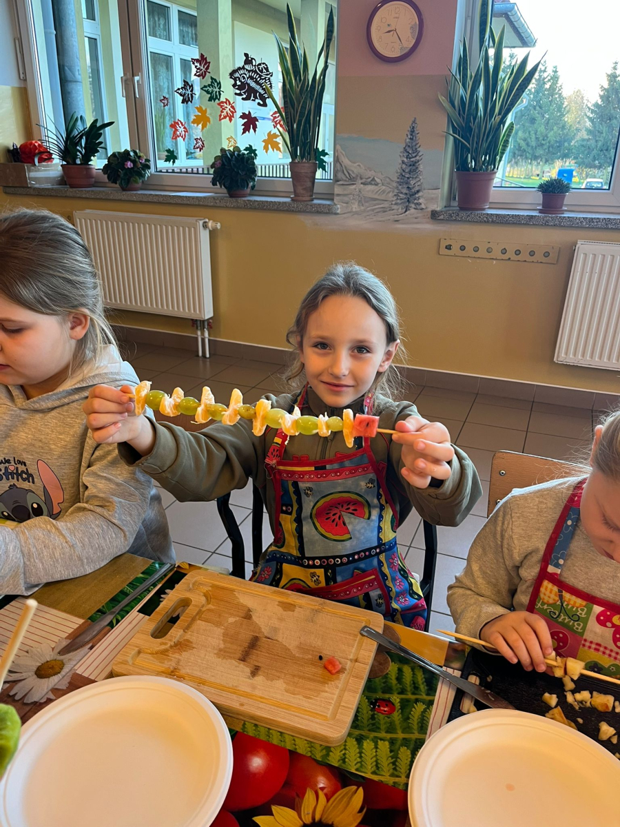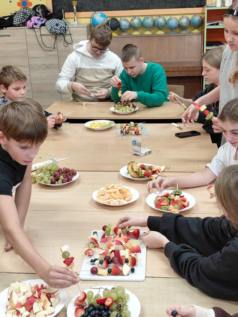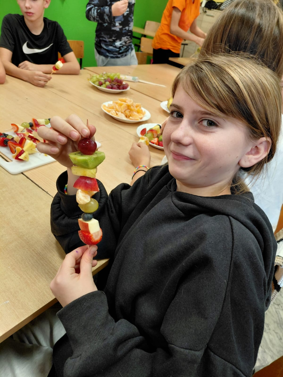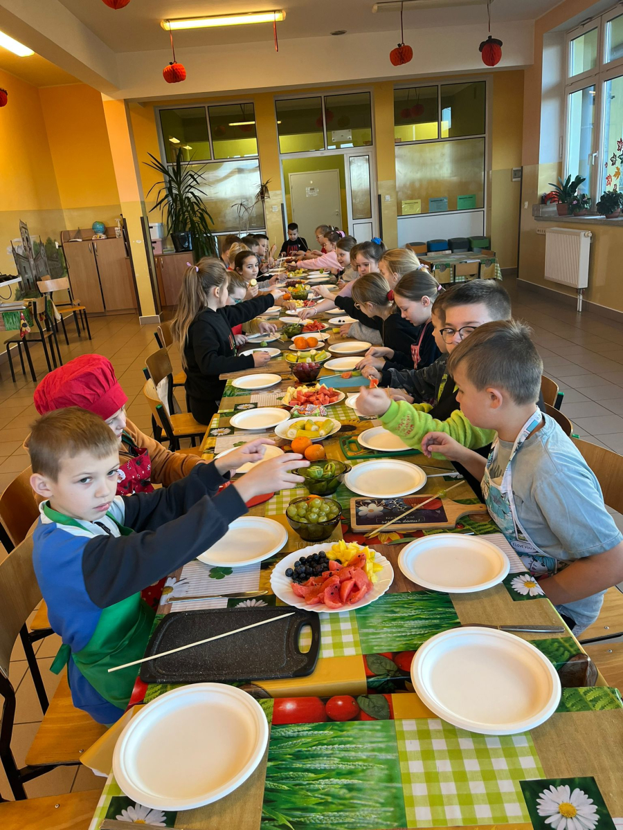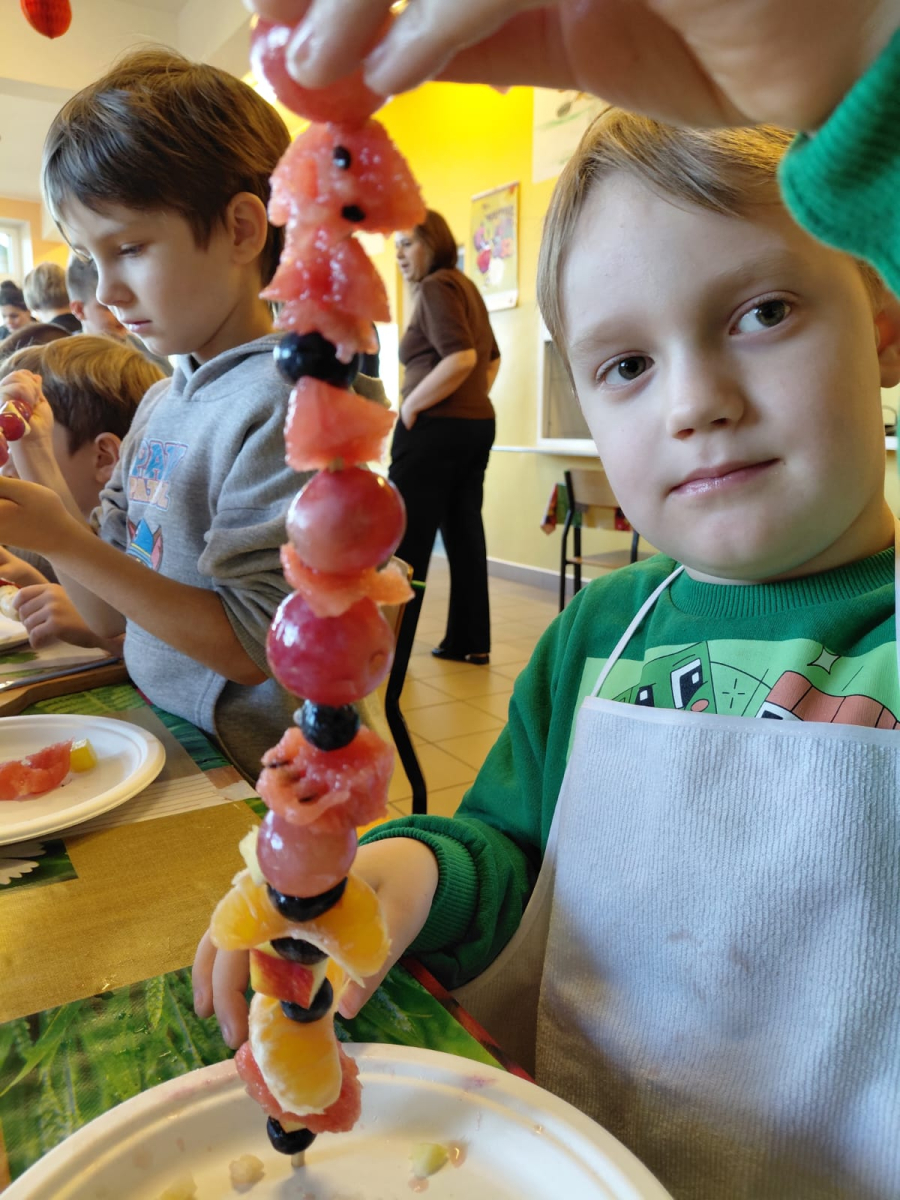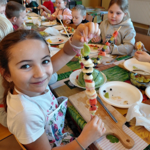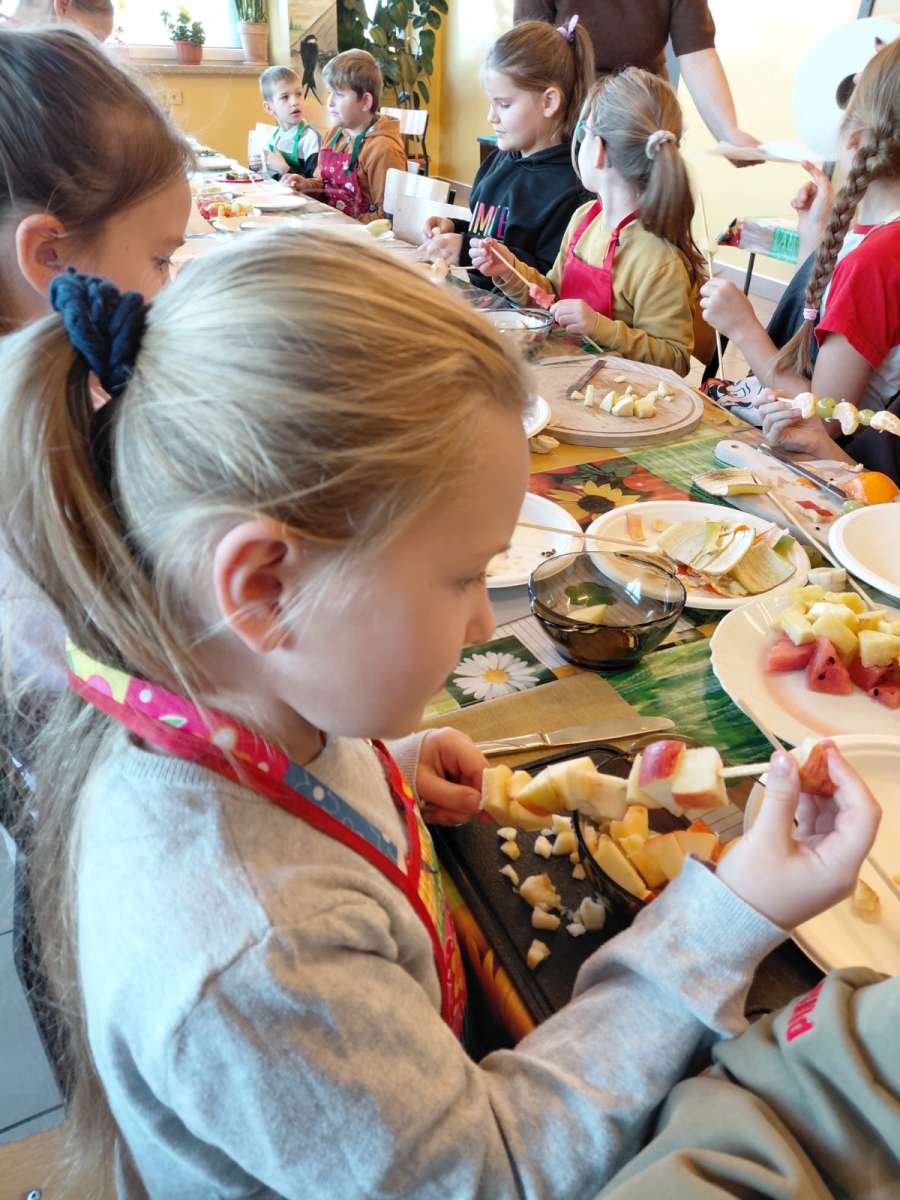 Dzisiaj świętowaliśmy Dzień Zdrowego Odżywiania i… było przepysznie! Przedszkolaki robiły zdrowe kanapki, w klasach zaś dzieci przygotowywały kolorowe, smaczne i zdrowe przekąski – szaszłyki owocowe i warzywne, które znikały szybciej niż zdążyliśmy je fotografować.