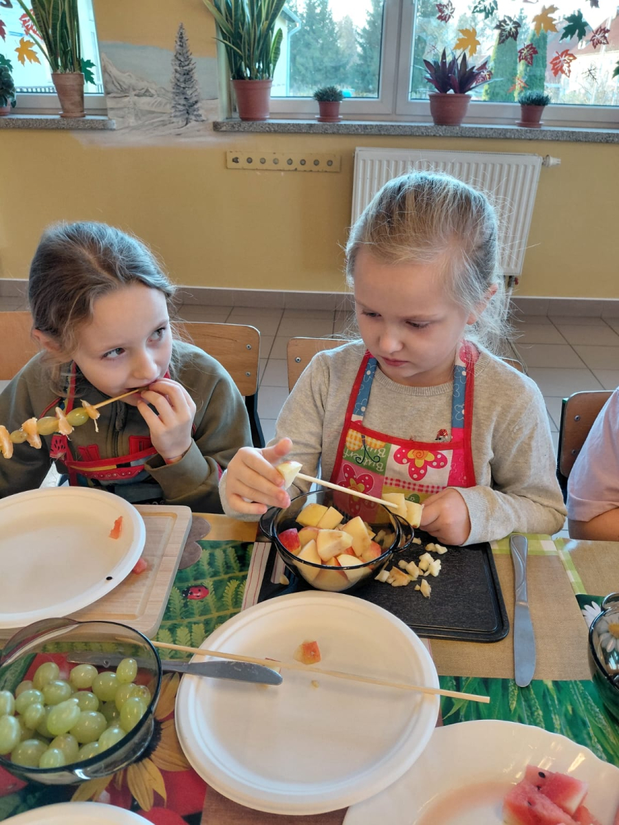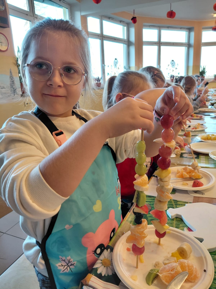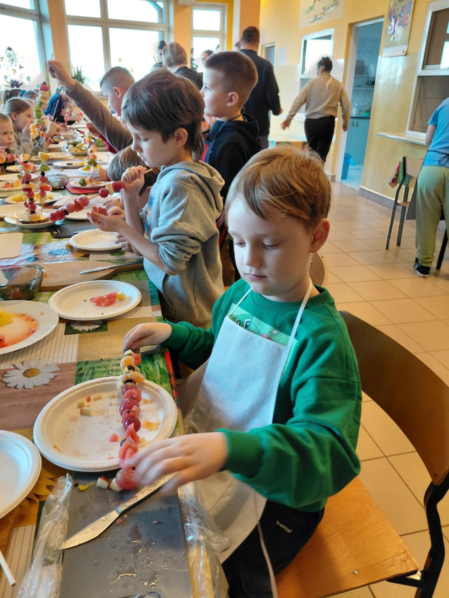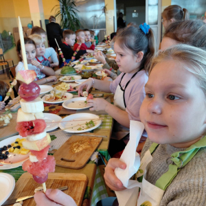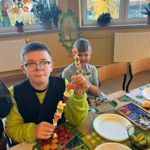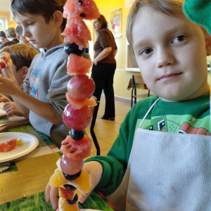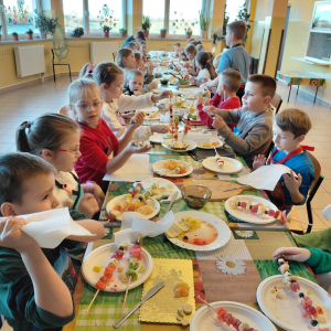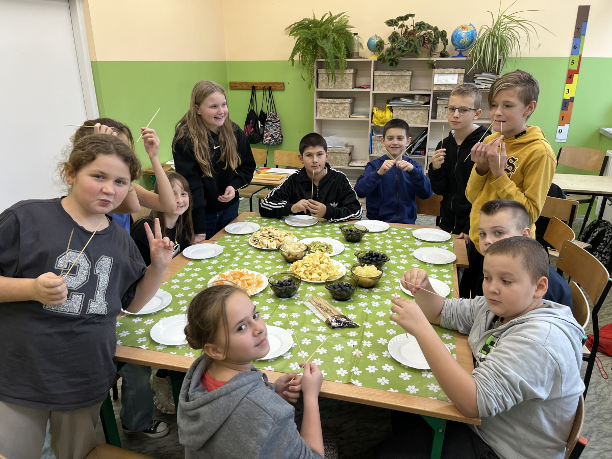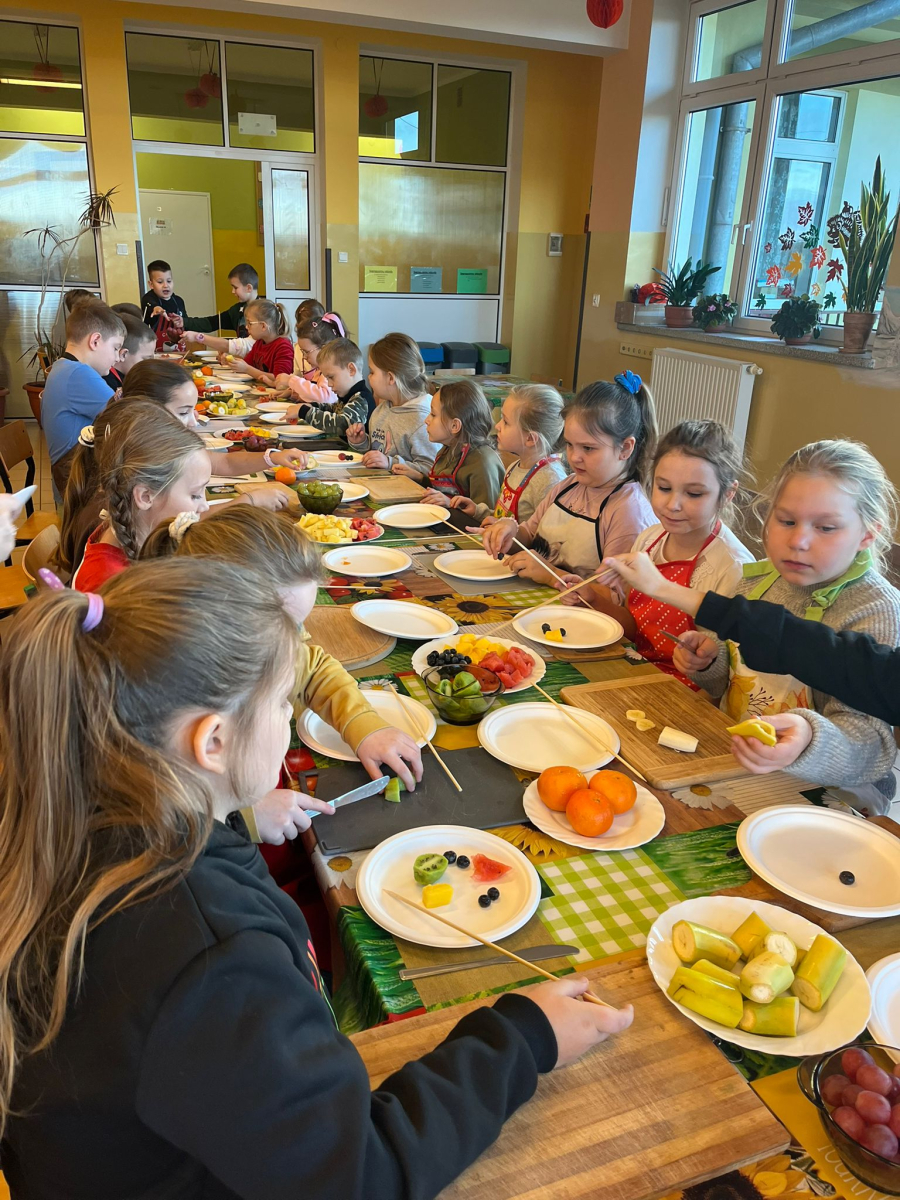 Dzisiaj świętowaliśmy Dzień Zdrowego Odżywiania i… było przepysznie! Przedszkolaki robiły zdrowe kanapki, w klasach zaś dzieci przygotowywały kolorowe, smaczne i zdrowe przekąski – szaszłyki owocowe i warzywne, które znikały szybciej niż zdążyliśmy je fotografować.