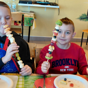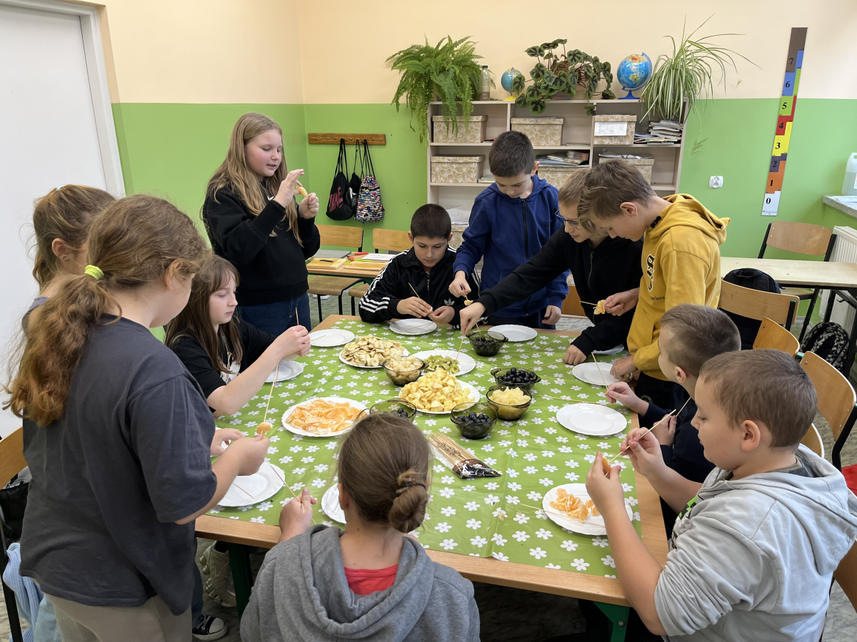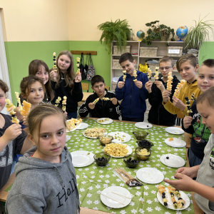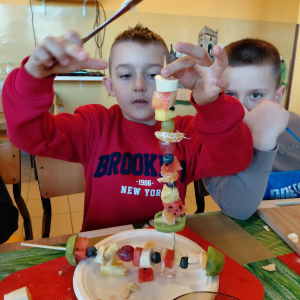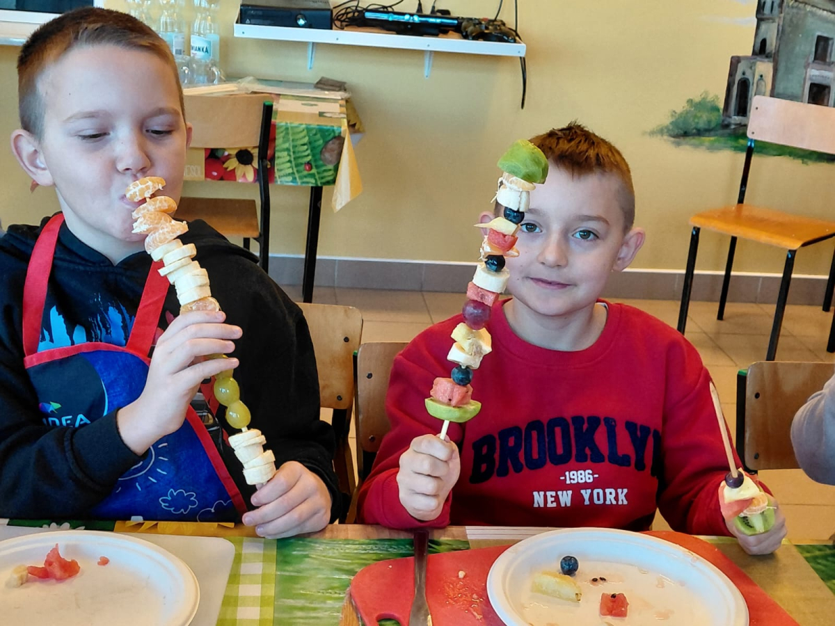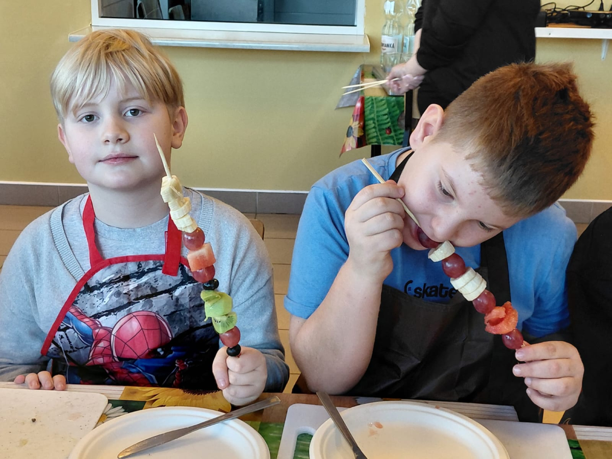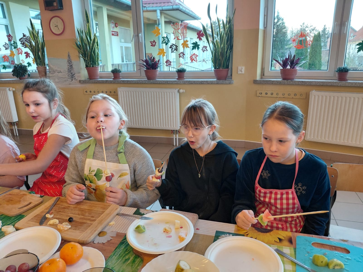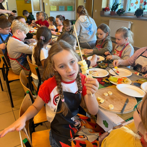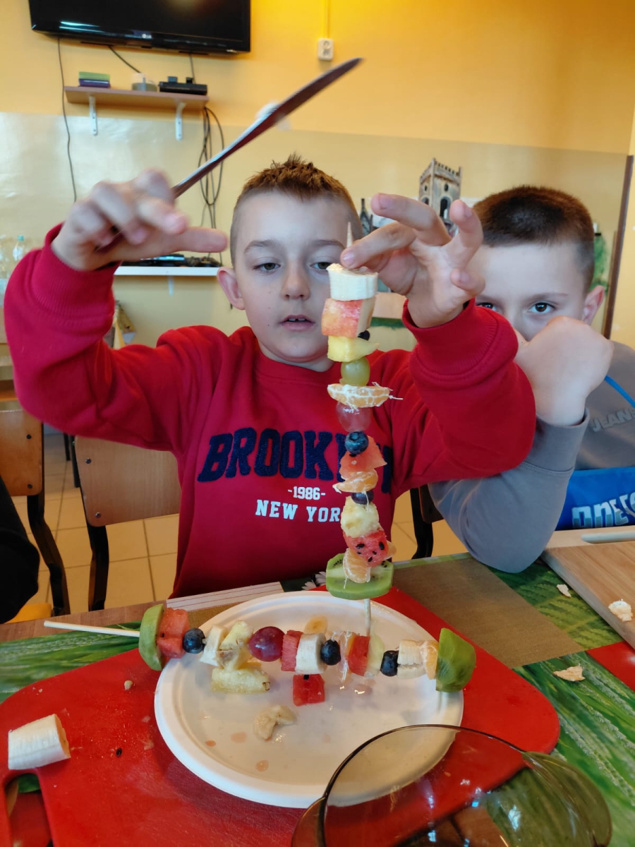Dzisiaj świętowaliśmy Dzień Zdrowego Odżywiania i… było przepysznie! Przedszkolaki robiły zdrowe kanapki, w klasach zaś dzieci przygotowywały kolorowe, smaczne i zdrowe przekąski – szaszłyki owocowe i warzywne, które znikały szybciej niż zdążyliśmy je fotografować.