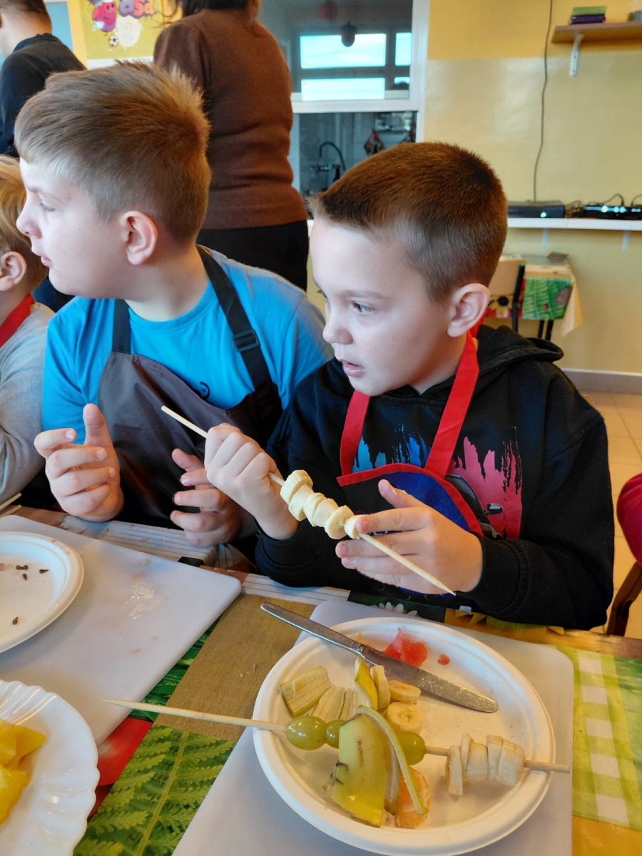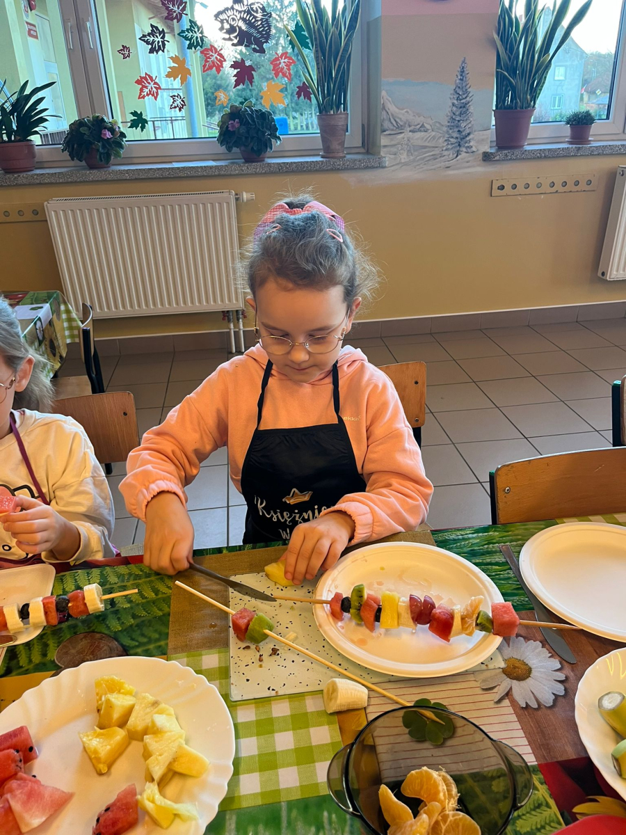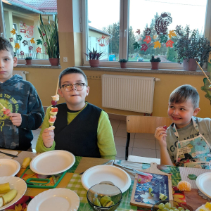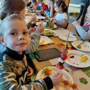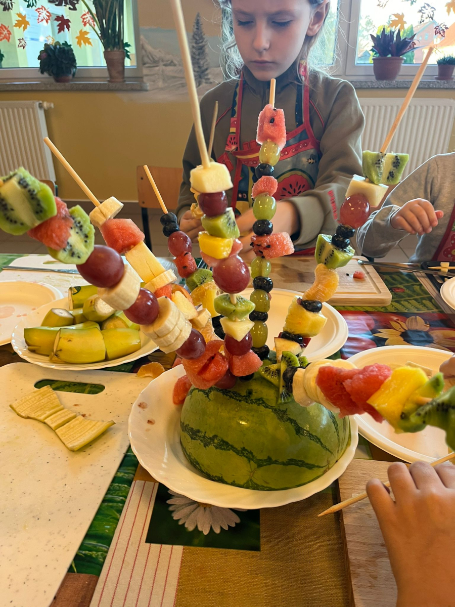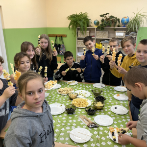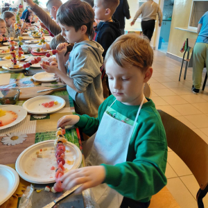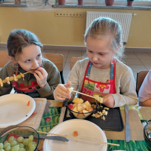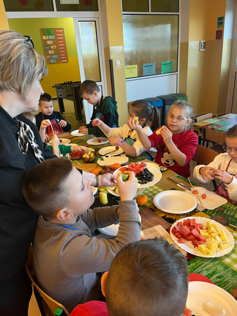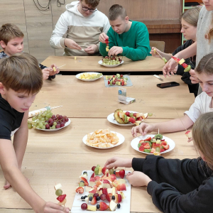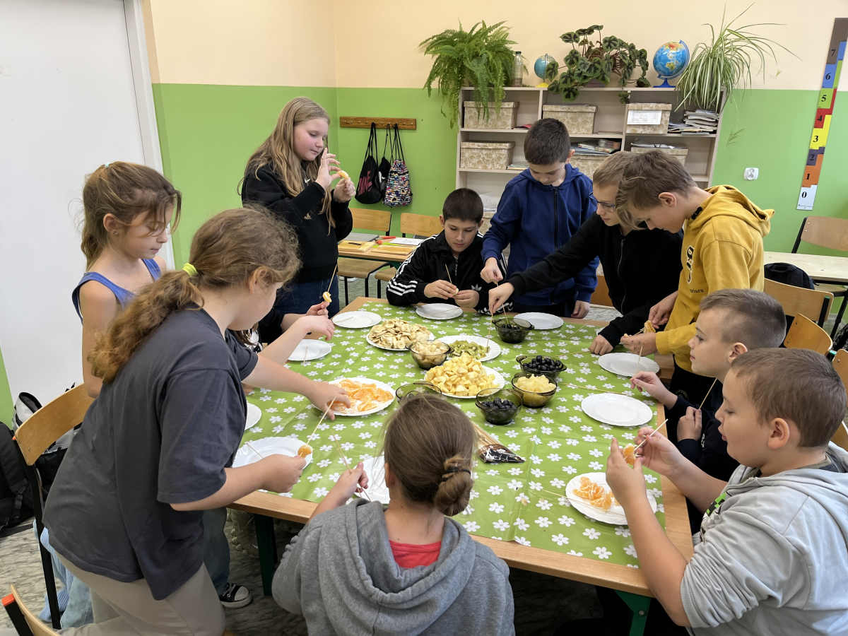 Dzisiaj świętowaliśmy Dzień Zdrowego Odżywiania i… było przepysznie! Przedszkolaki robiły zdrowe kanapki, w klasach zaś dzieci przygotowywały kolorowe, smaczne i zdrowe przekąski – szaszłyki owocowe i warzywne, które znikały szybciej niż zdążyliśmy je fotografować.