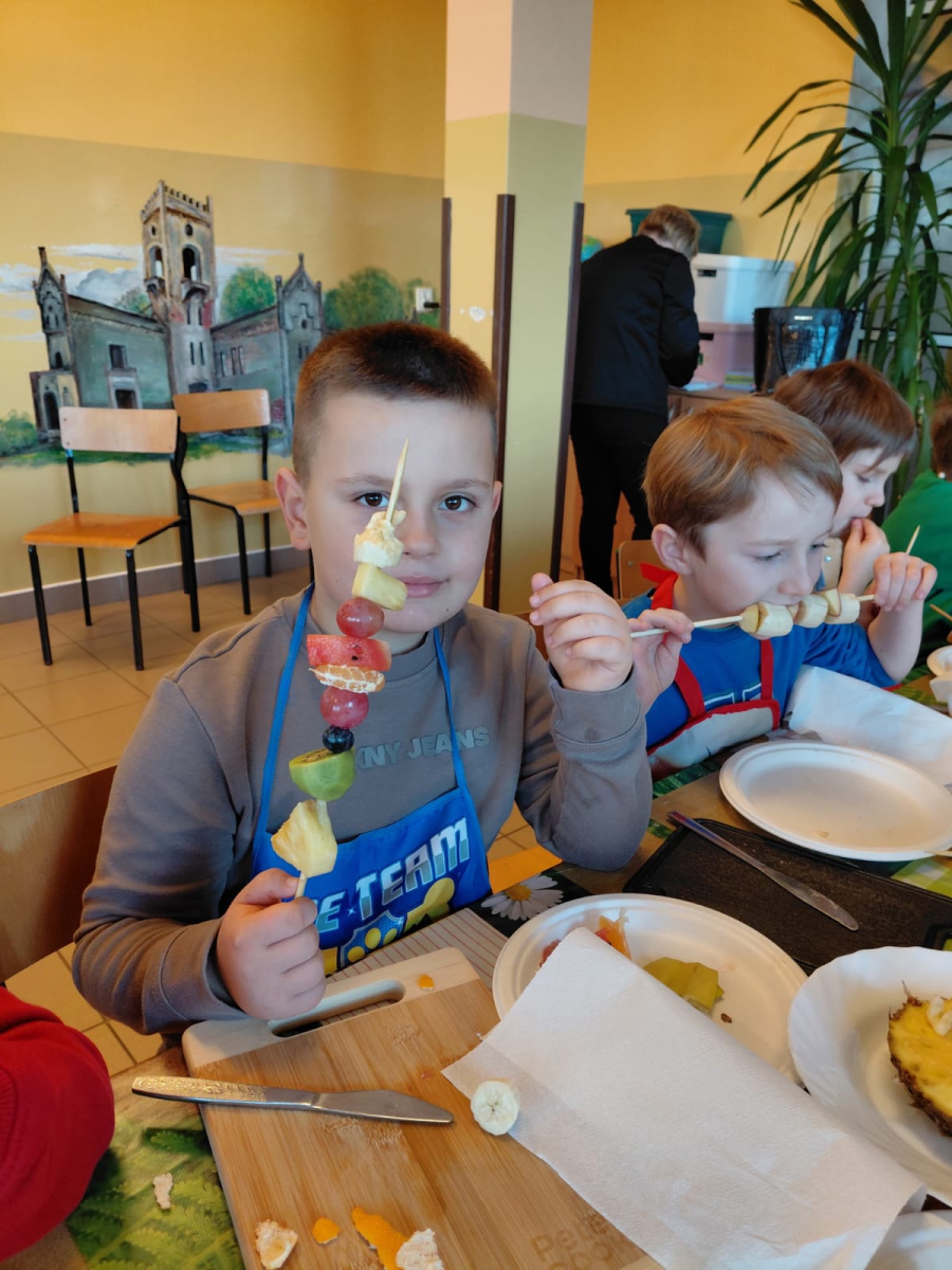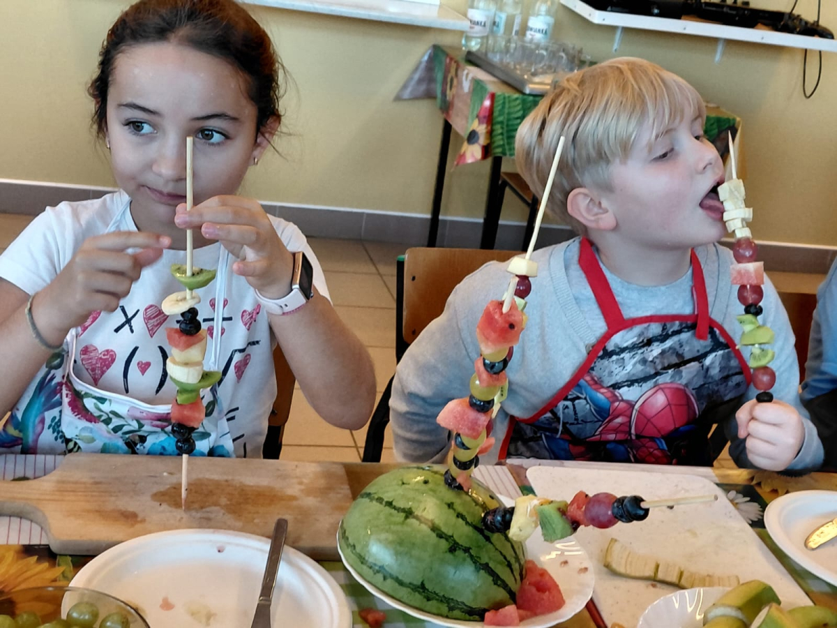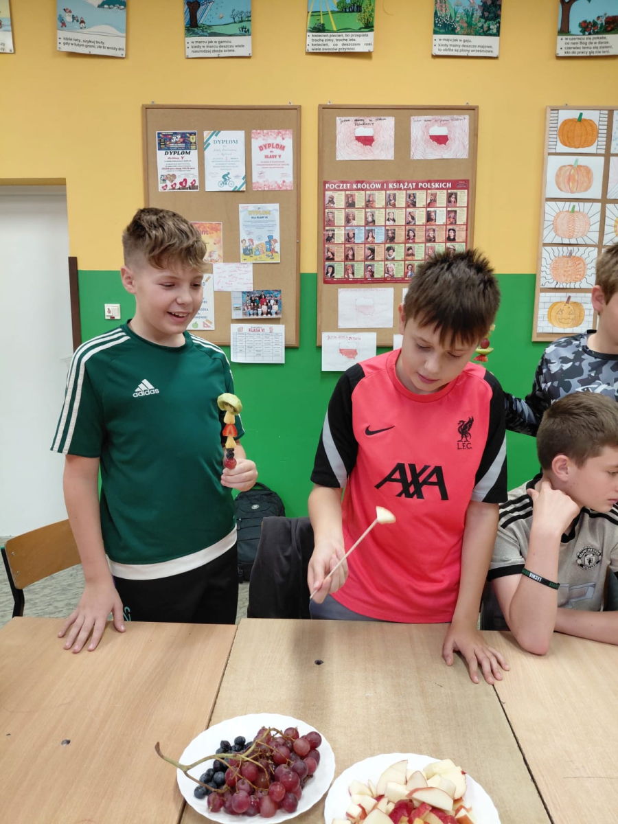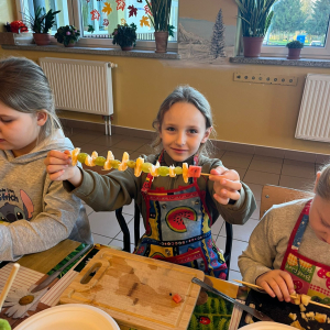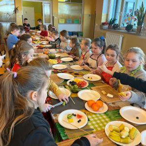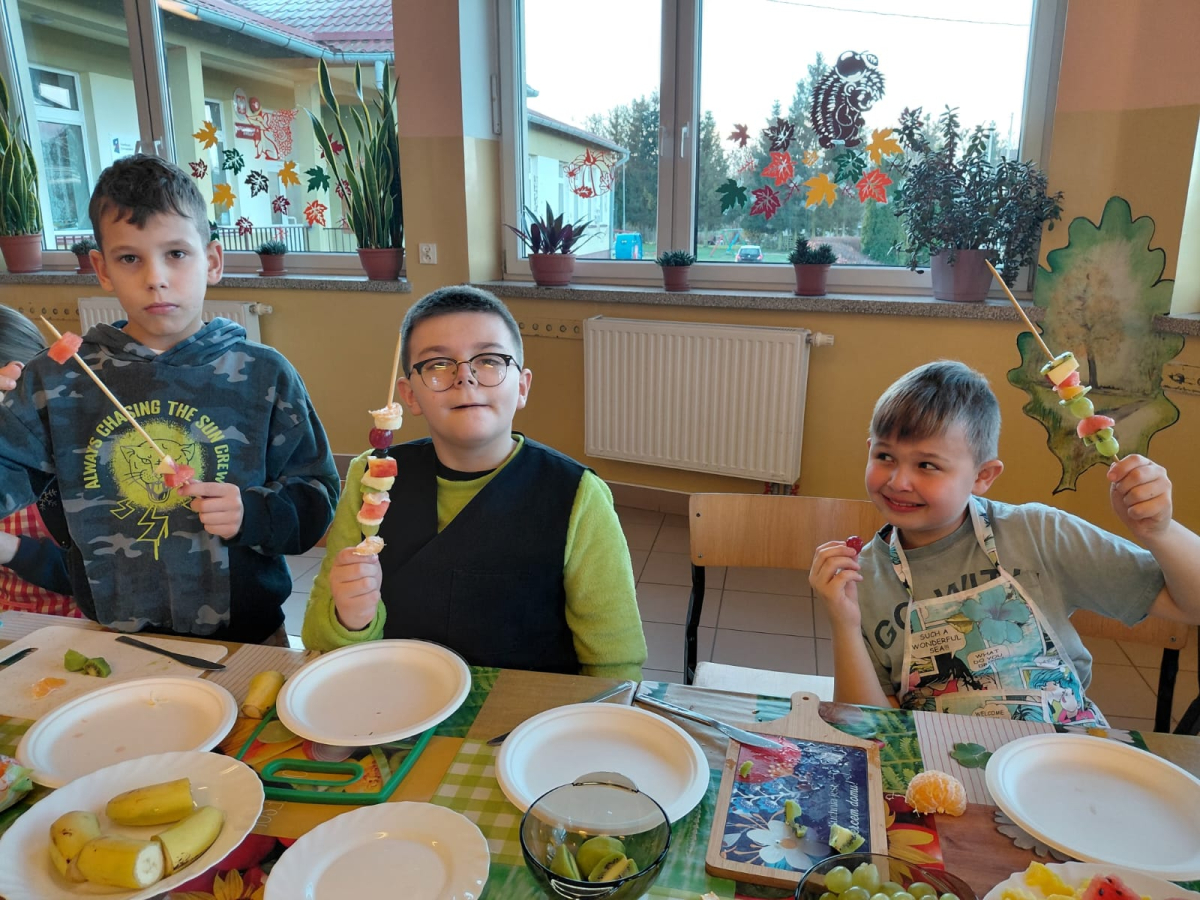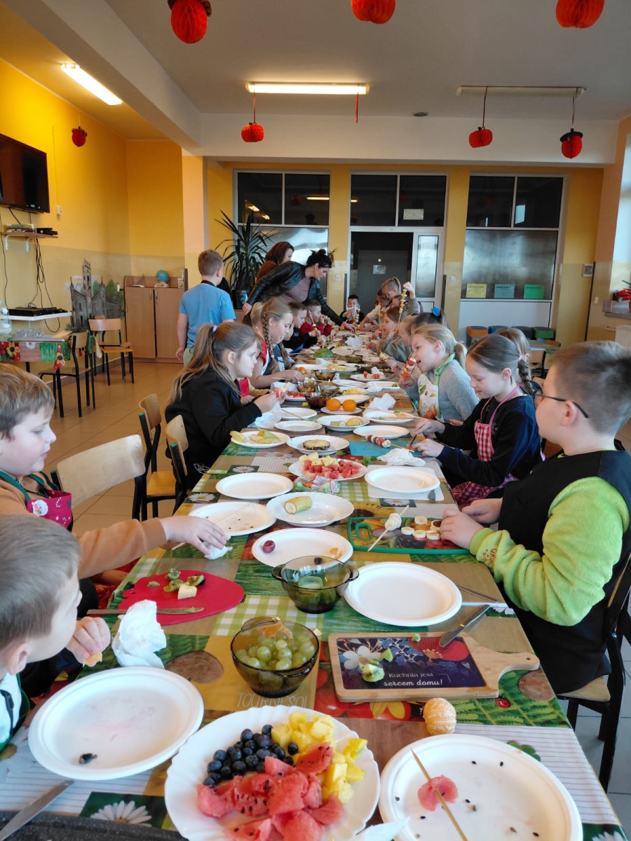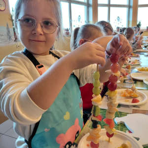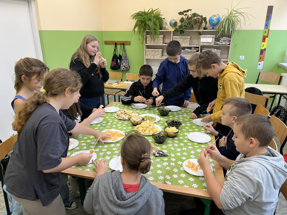 Dzisiaj świętowaliśmy Dzień Zdrowego Odżywiania i… było przepysznie! Przedszkolaki robiły zdrowe kanapki, w klasach zaś dzieci przygotowywały kolorowe, smaczne i zdrowe przekąski – szaszłyki owocowe i warzywne, które znikały szybciej niż zdążyliśmy je fotografować.