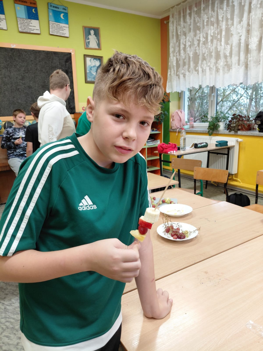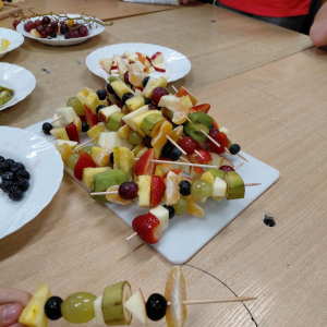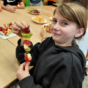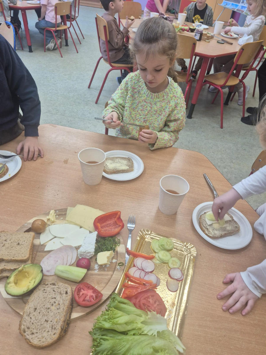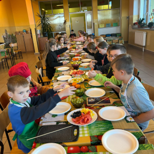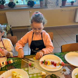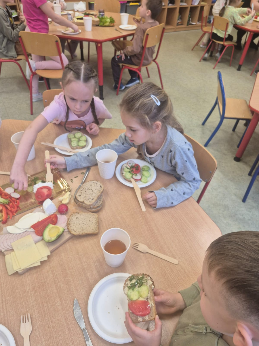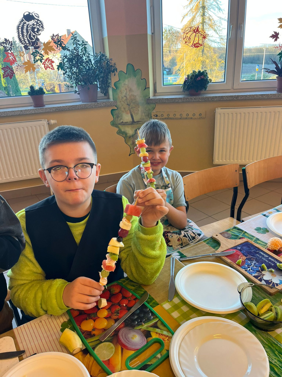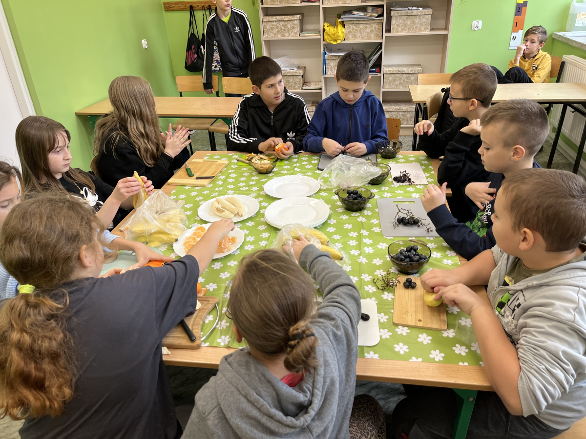 Dzisiaj świętowaliśmy Dzień Zdrowego Odżywiania i… było przepysznie! Przedszkolaki robiły zdrowe kanapki, w klasach zaś dzieci przygotowywały kolorowe, smaczne i zdrowe przekąski – szaszłyki owocowe i warzywne, które znikały szybciej niż zdążyliśmy je fotografować.