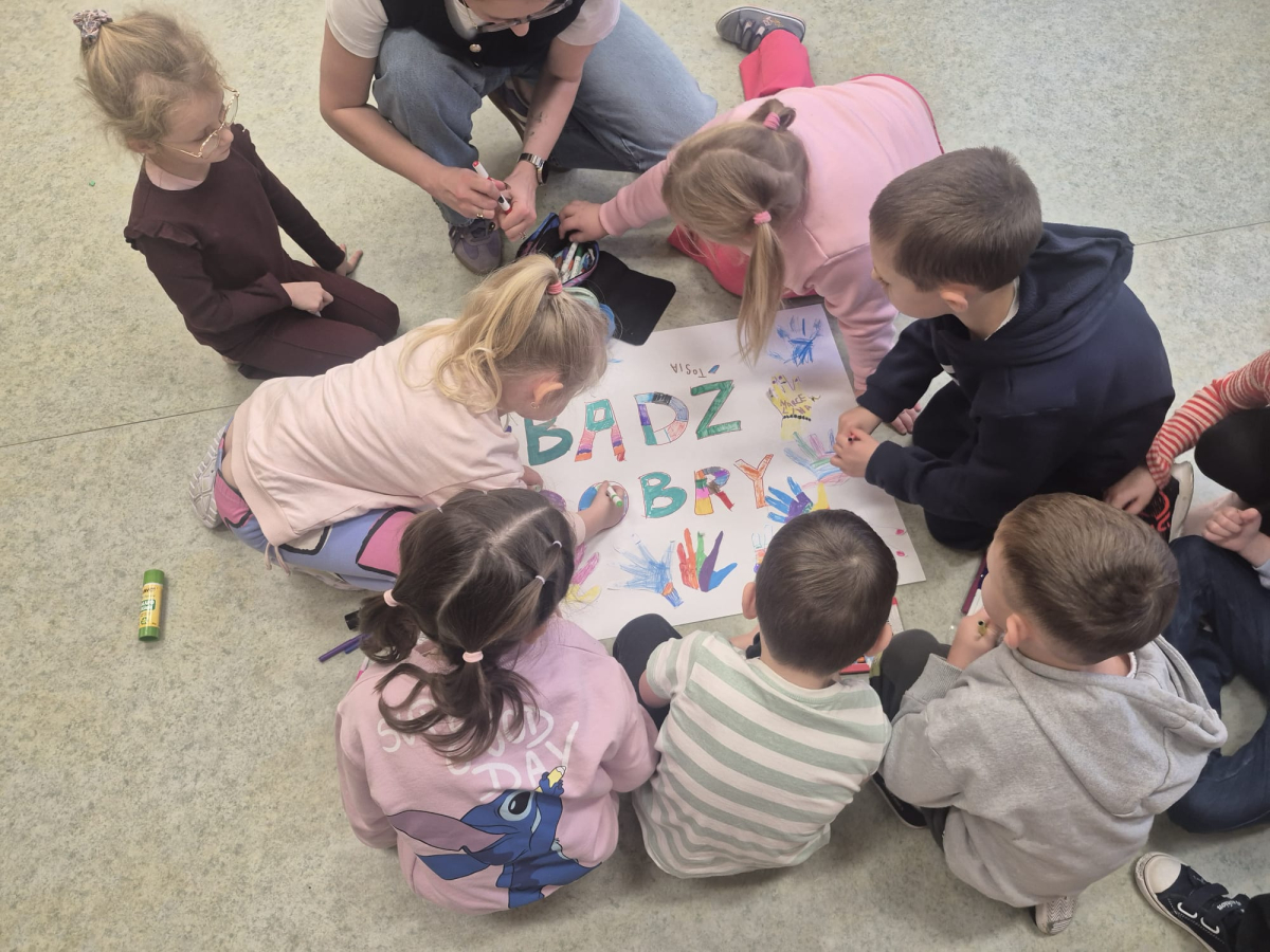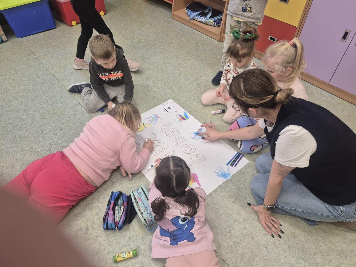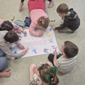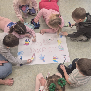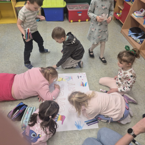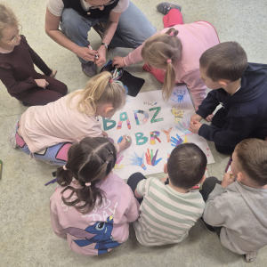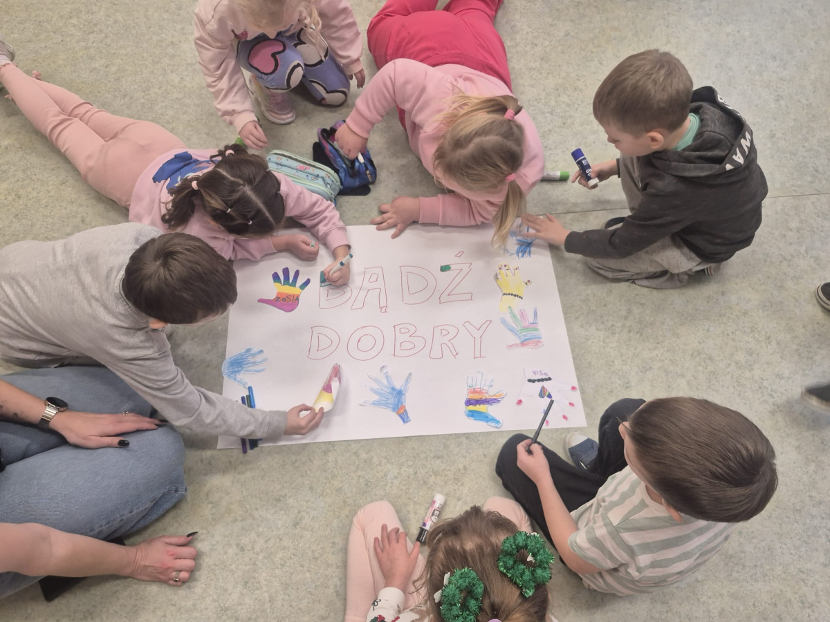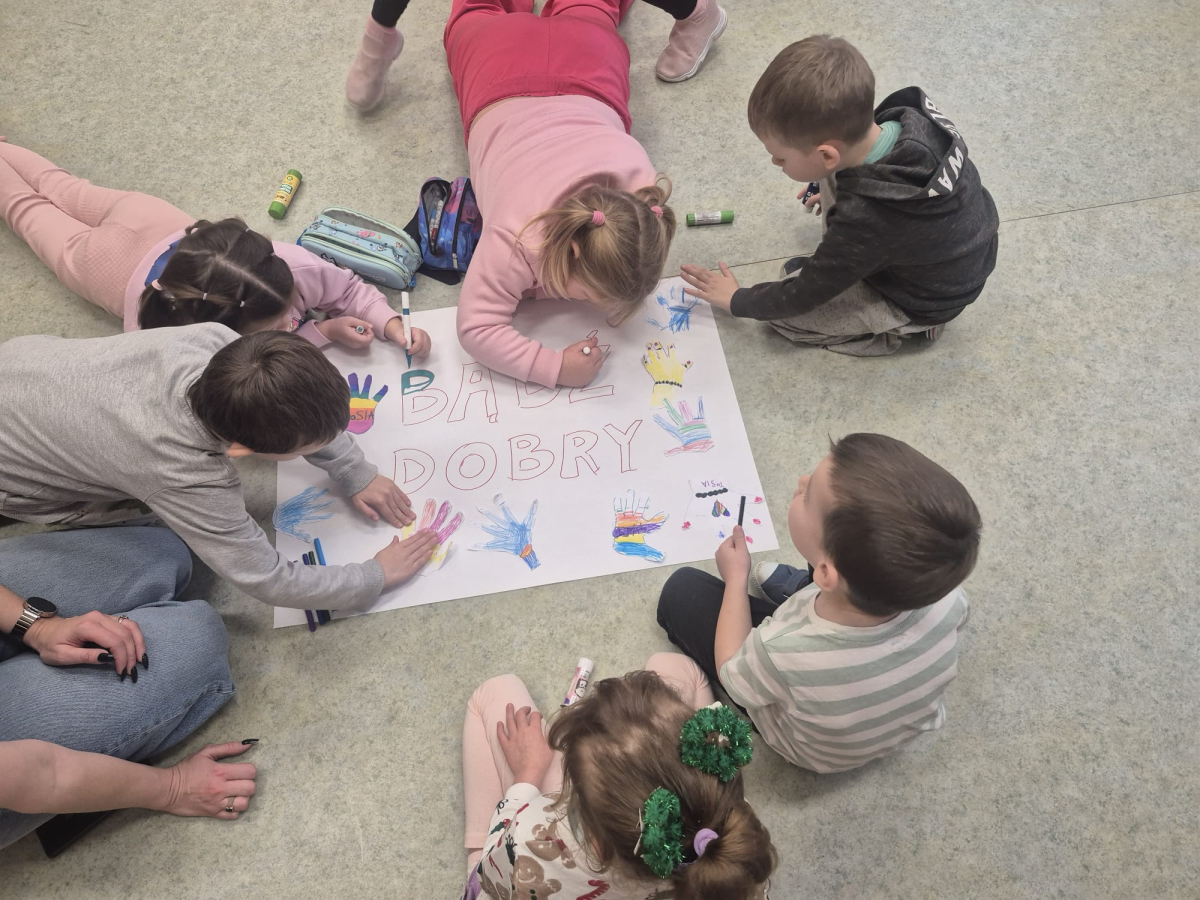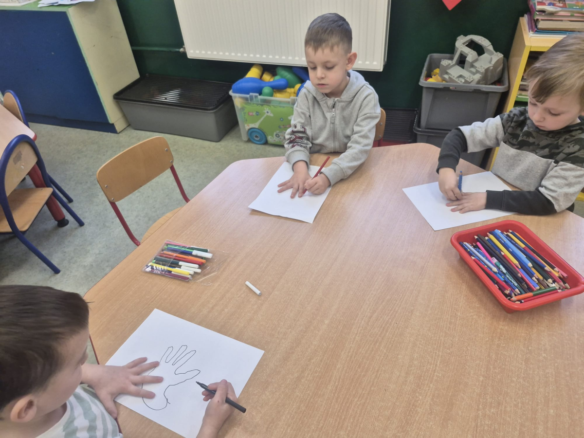 Dzieci z grupy przedszkolnej 5–6 latków uczestniczyły w zajęciach z pedagog pt. „Nie dla przemocy”. W prosty, dostosowany do wieku sposób rozmawiano o tym, co to znaczy być dobrym kolegą i dobrą koleżanką, czym jest przemoc, jak powiedzieć „nie”, jak reagować na niewłaściwe zachowania i jak wspierać innych. Podkreślano, że każdy ma prawo do swoich emocji, ale nie wolno krzywdzić innych – nawet w trudniejszy dzień. Na zakończenie dzieci wykonały pracę plastyczną „Ręka, która mówi STOP” – odrysowując swoje dłonie i tworząc kolorowe symbole sprzeciwu wobec przemocy.