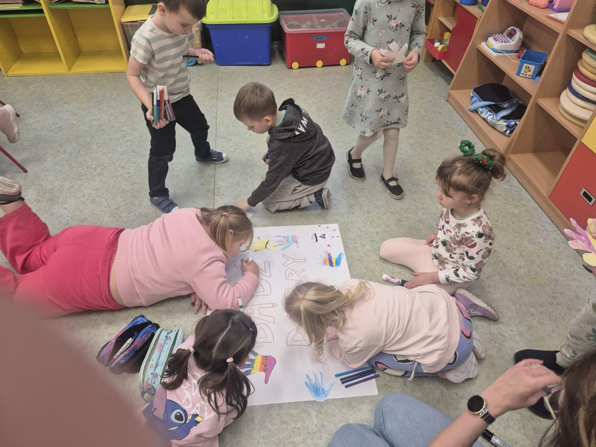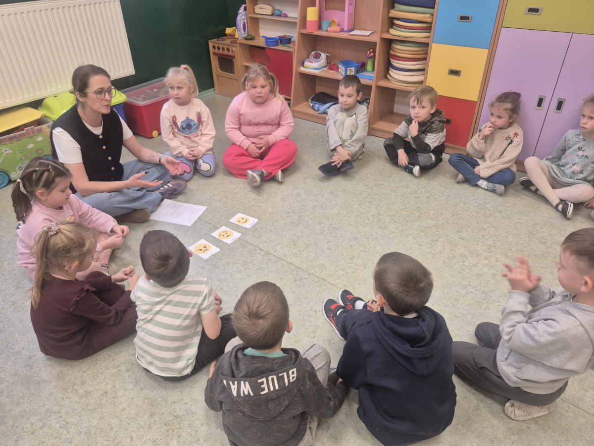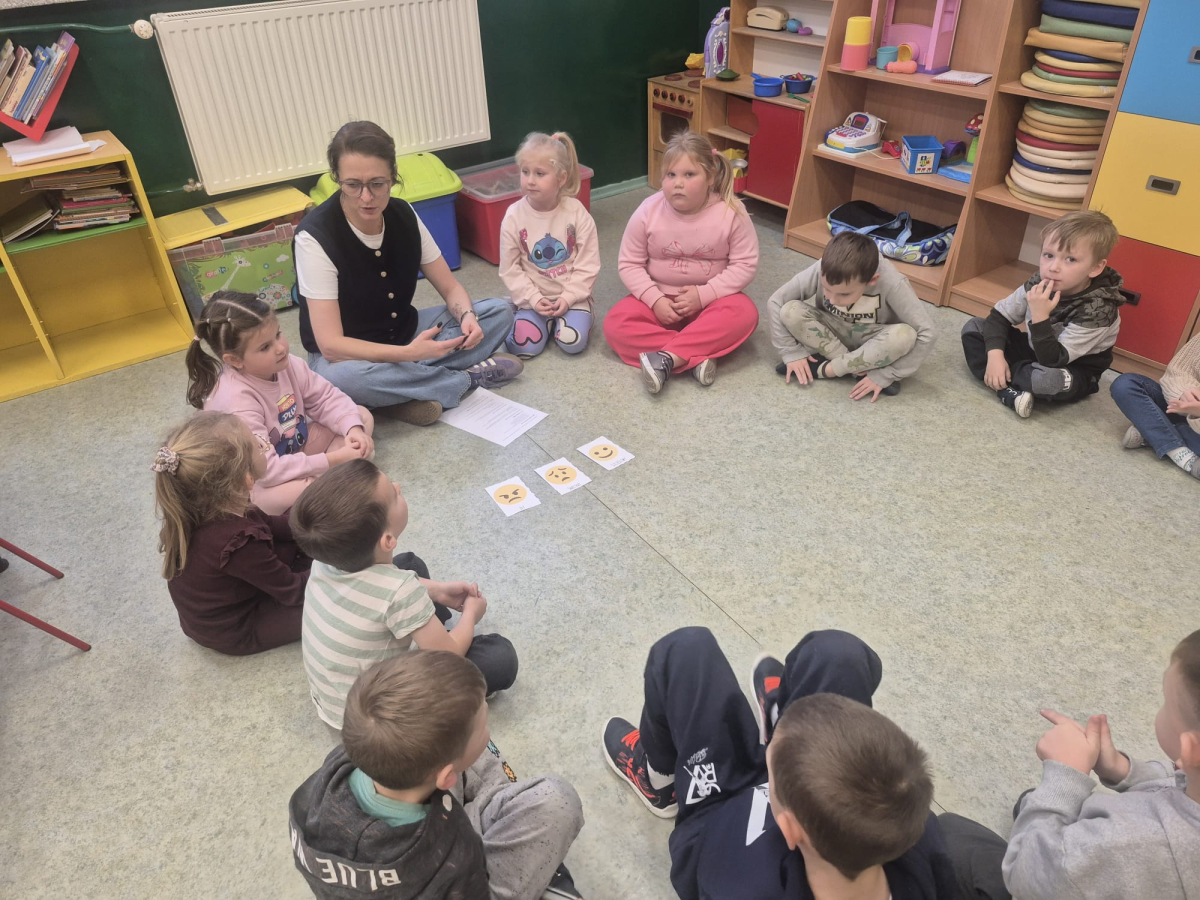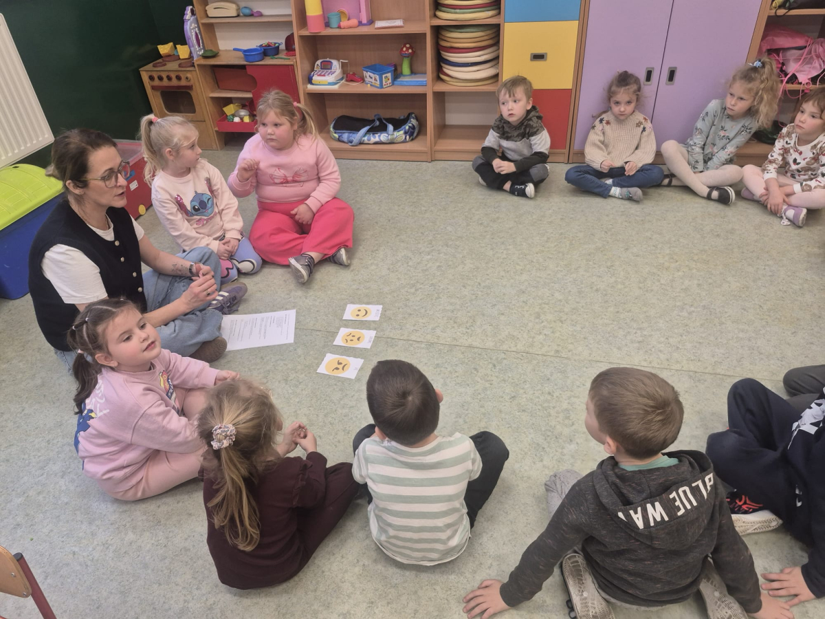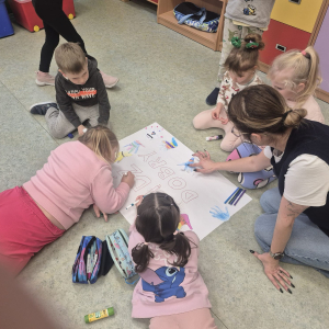 Dzieci z grupy przedszkolnej 5–6 latków uczestniczyły w zajęciach z pedagog pt. „Nie dla przemocy”. W prosty, dostosowany do wieku sposób rozmawiano o tym, co to znaczy być dobrym kolegą i dobrą koleżanką, czym jest przemoc, jak powiedzieć „nie”, jak reagować na niewłaściwe zachowania i jak wspierać innych. Podkreślano, że każdy ma prawo do swoich emocji, ale nie wolno krzywdzić innych – nawet w trudniejszy dzień. Na zakończenie dzieci wykonały pracę plastyczną „Ręka, która mówi STOP” – odrysowując swoje dłonie i tworząc kolorowe symbole sprzeciwu wobec przemocy.