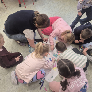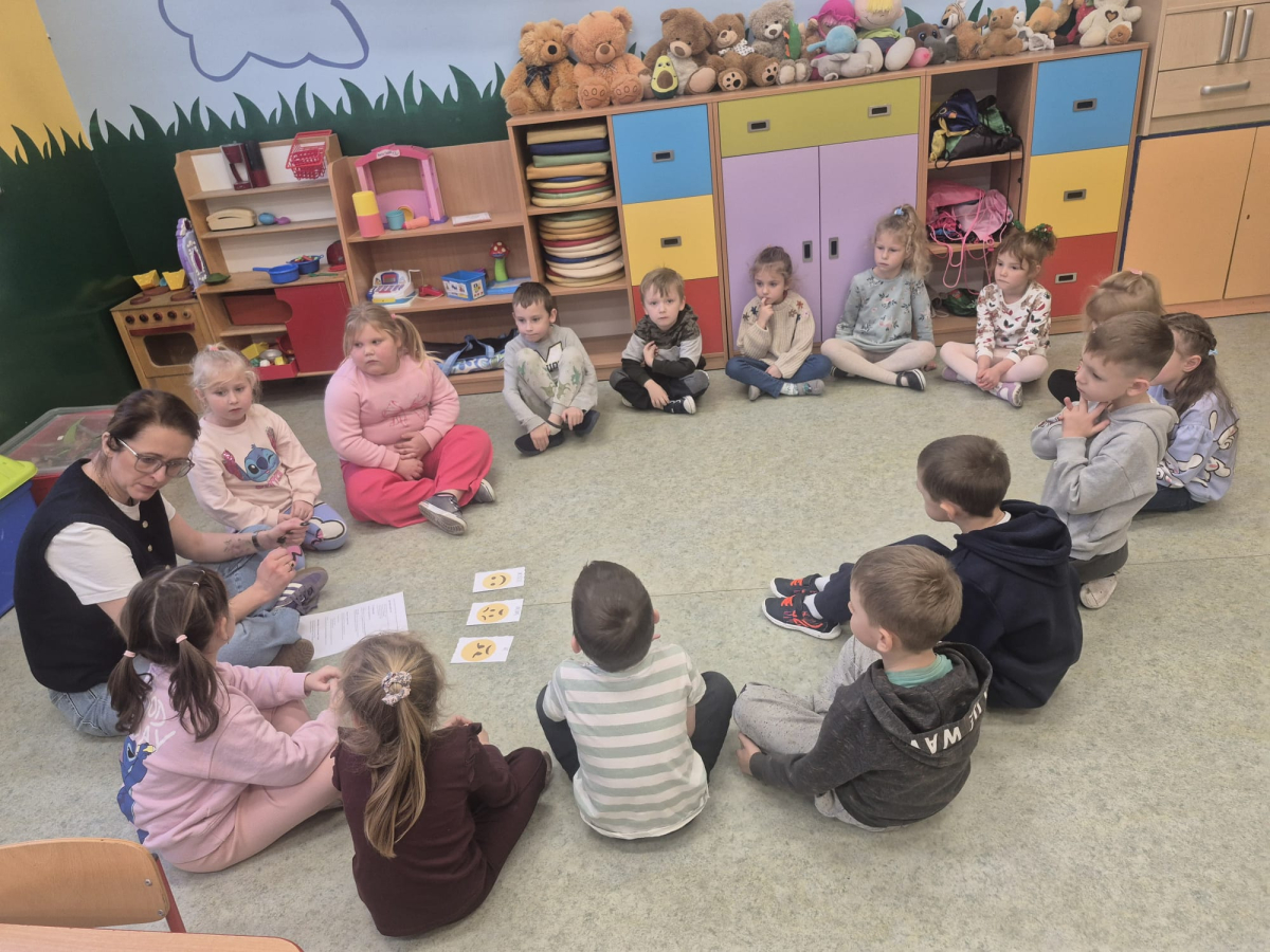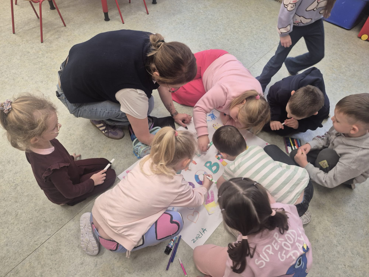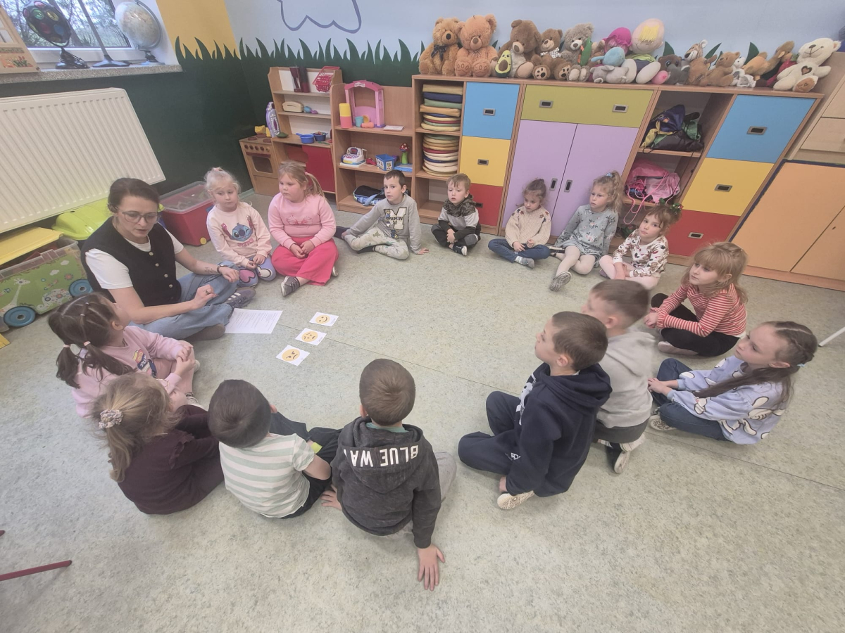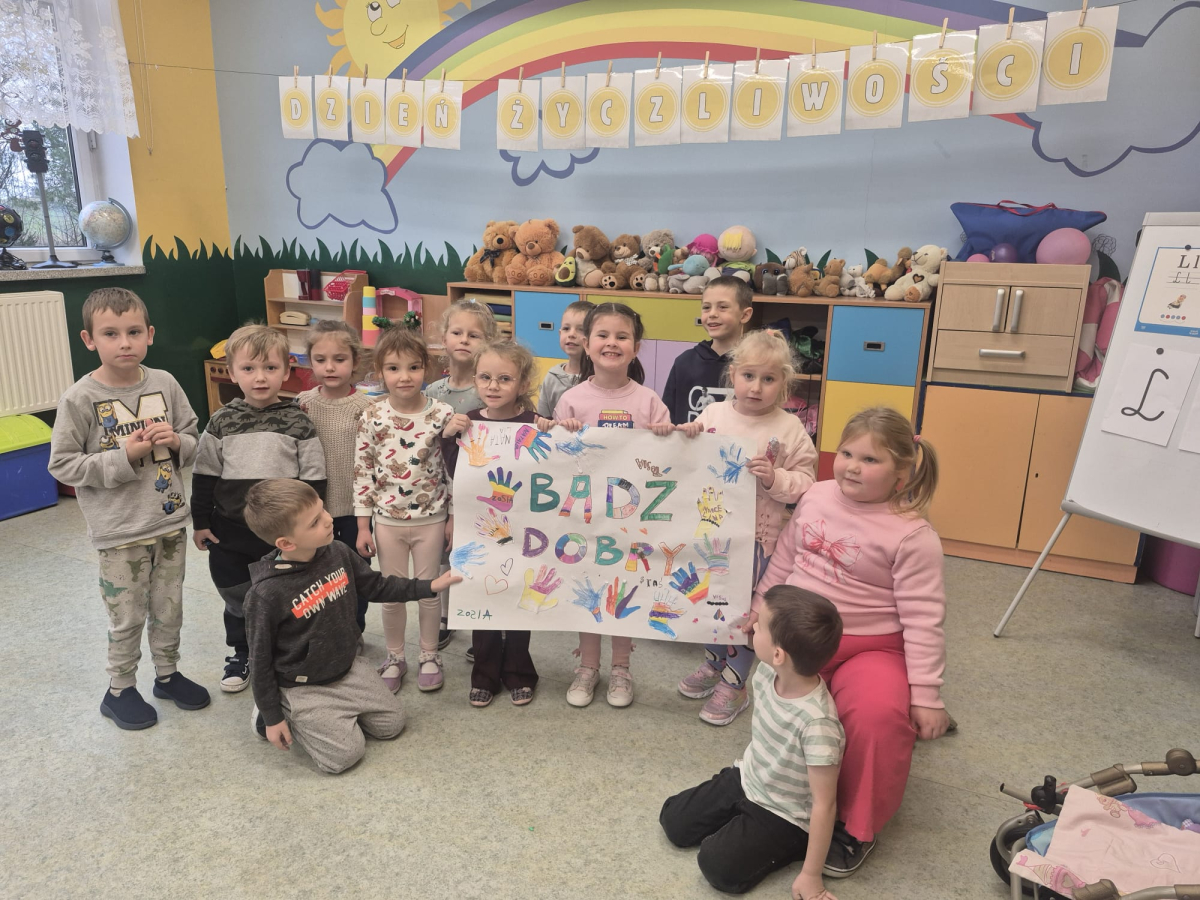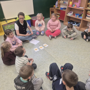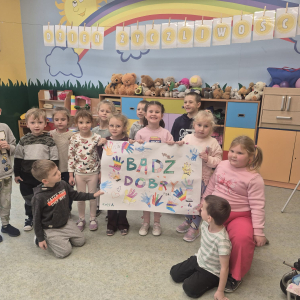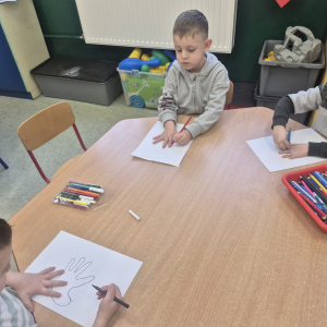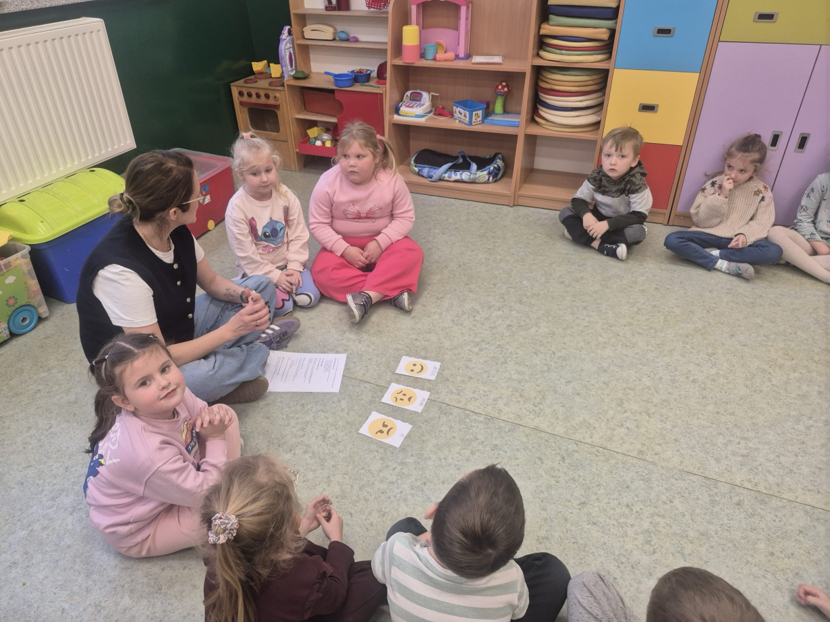 Dzieci z grupy przedszkolnej 5–6 latków uczestniczyły w zajęciach z pedagog pt. „Nie dla przemocy”. W prosty, dostosowany do wieku sposób rozmawiano o tym, co to znaczy być dobrym kolegą i dobrą koleżanką, czym jest przemoc, jak powiedzieć „nie”, jak reagować na niewłaściwe zachowania i jak wspierać innych. Podkreślano, że każdy ma prawo do swoich emocji, ale nie wolno krzywdzić innych – nawet w trudniejszy dzień. Na zakończenie dzieci wykonały pracę plastyczną „Ręka, która mówi STOP” – odrysowując swoje dłonie i tworząc kolorowe symbole sprzeciwu wobec przemocy.