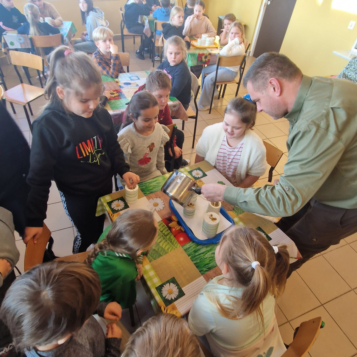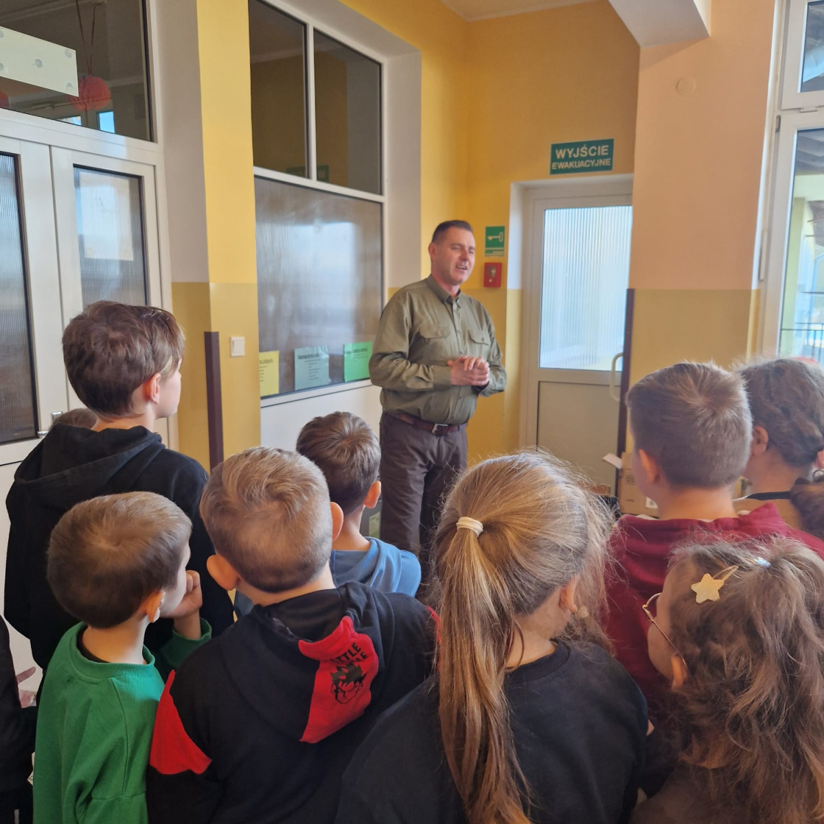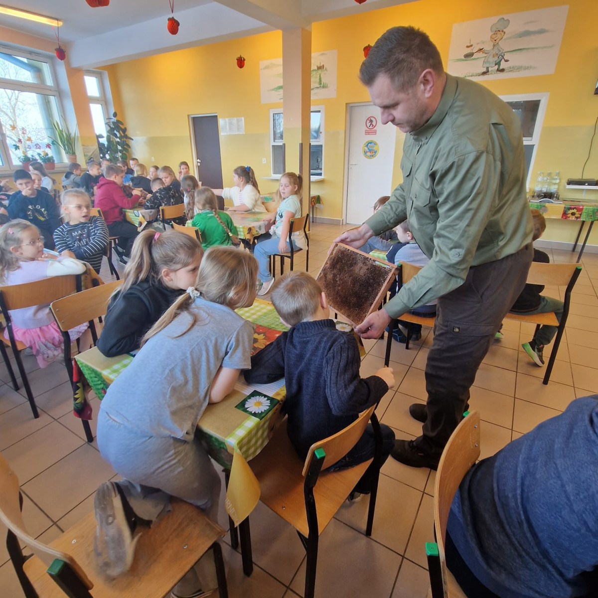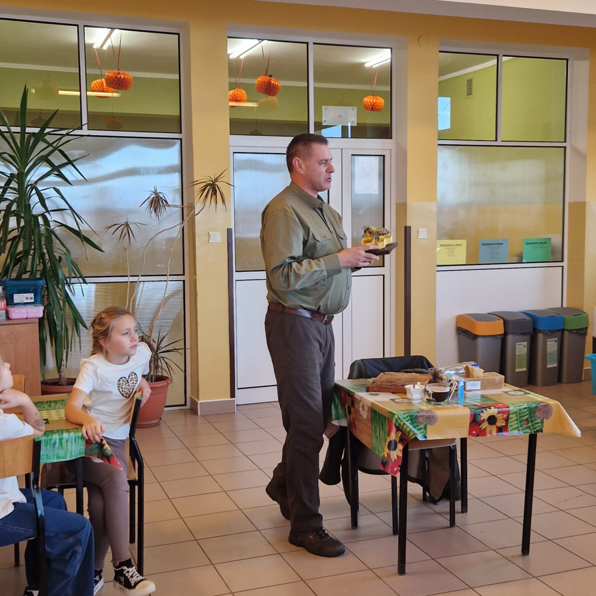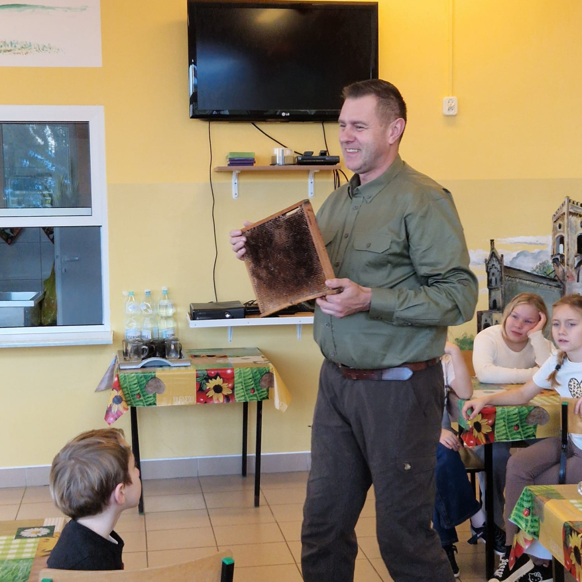 2 grudnia 2025 r. w naszej szkole odbyło się spotkanie uczniów klas I-IV z Panem Grzegorzem Głozakiem, pracownikiem Parku Krajobrazowego Pojezierza Iławskiego i Wzgórz Dylewskich w Jerzwałdzie. Prelegent opowiedział uczniom o fascynującym świecie pszczół, ich roli w ekosystemie oraz o tym, jak ważna jest ochrona owadów zapylających.