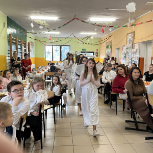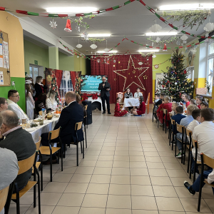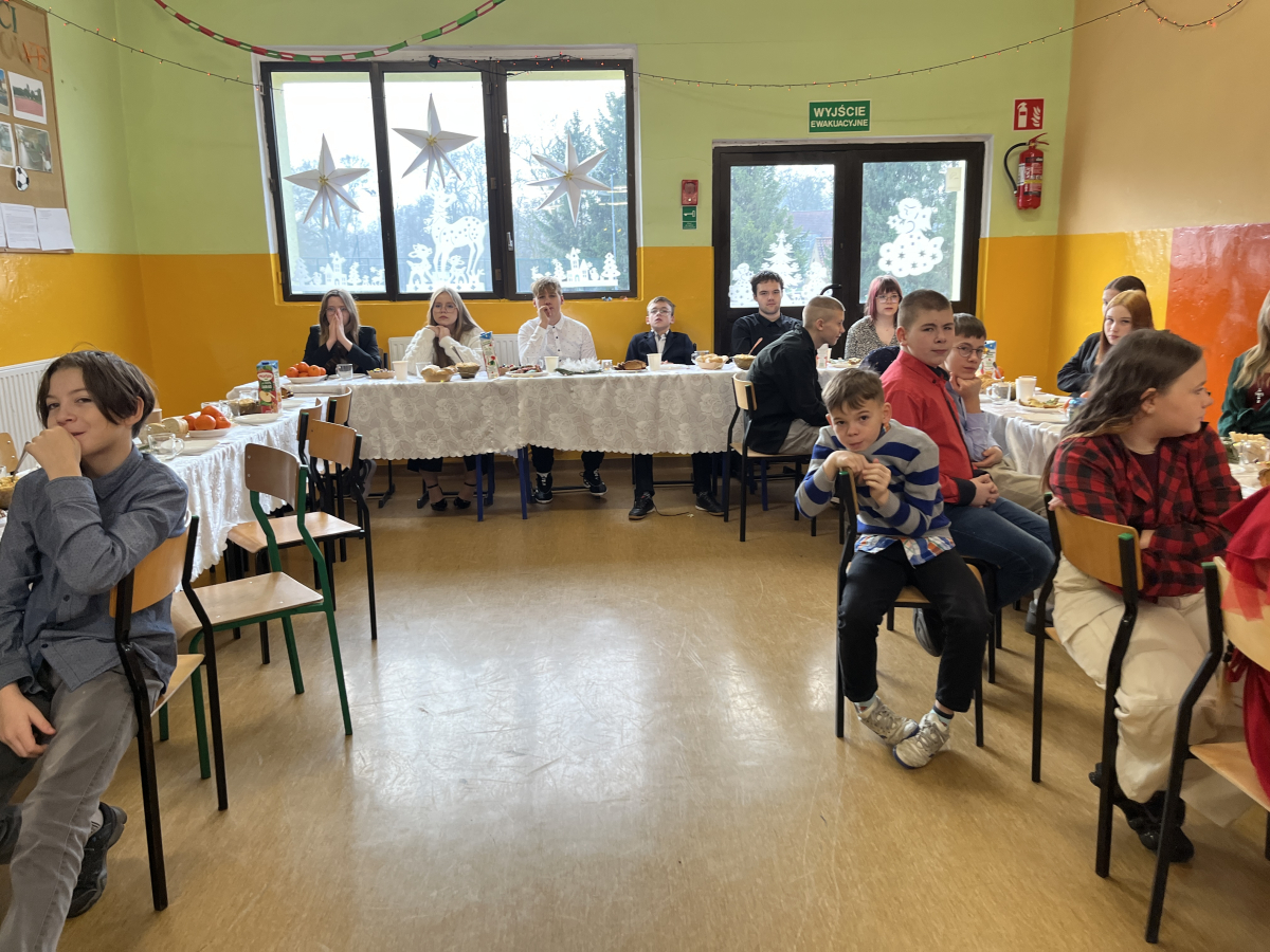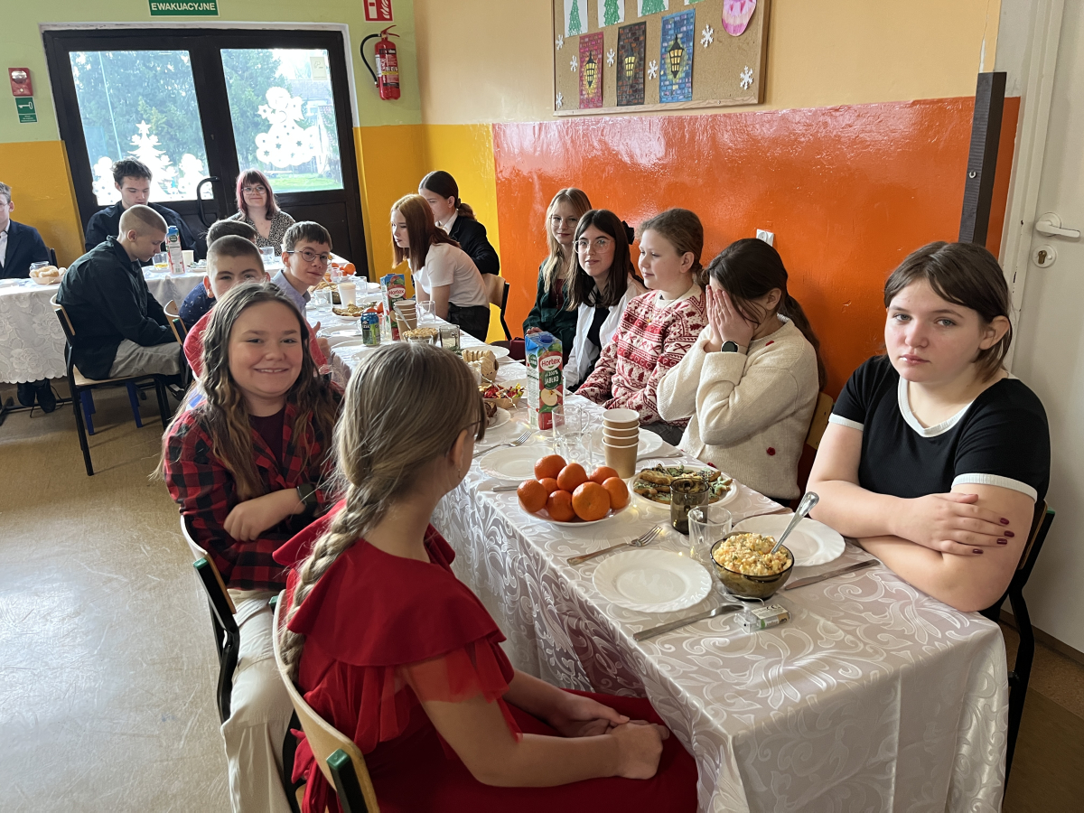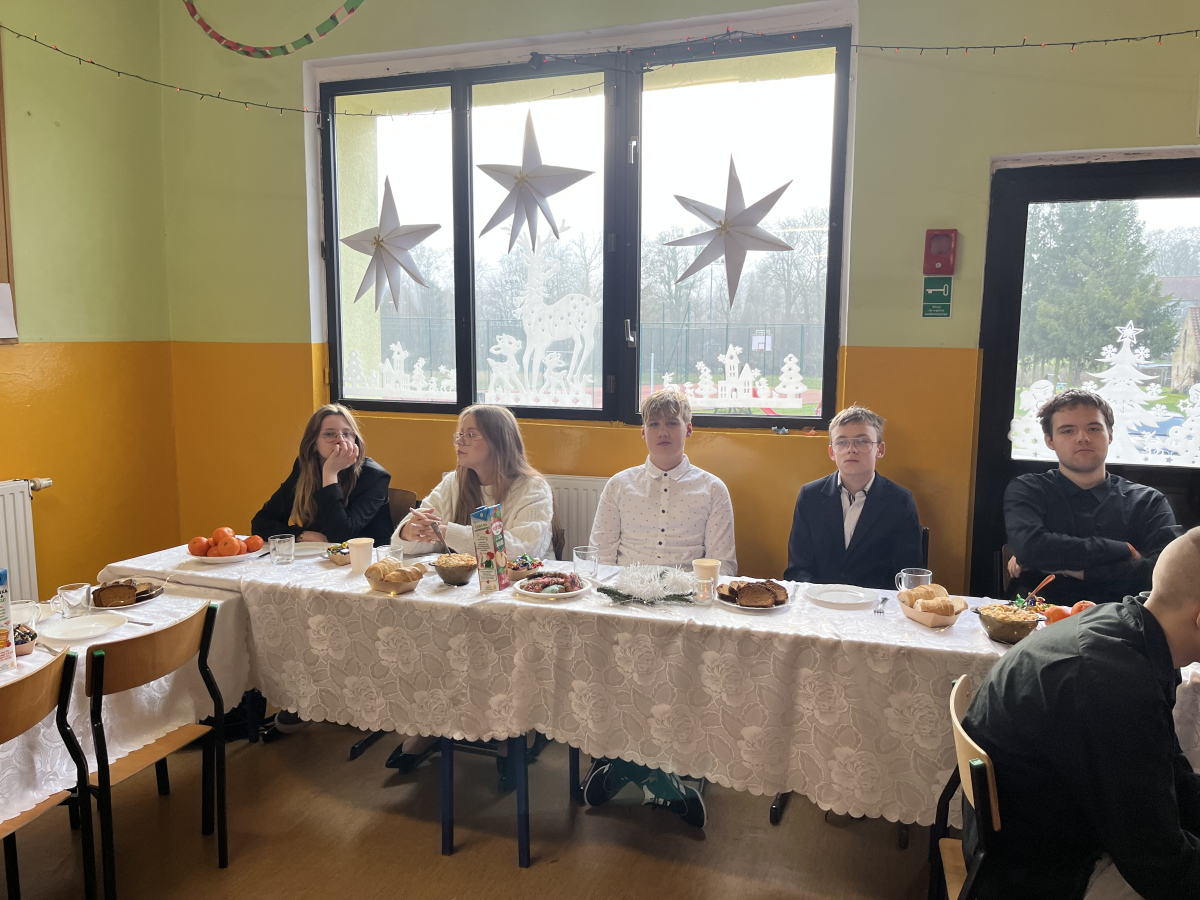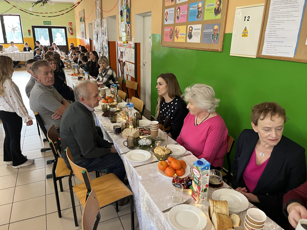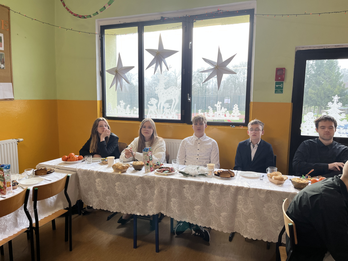 Po części artystycznej wszyscy uczestnicy spotkania podzielili się opłatkiem, składając sobie serdeczne, świąteczne życzenia. Zwieńczeniem uroczystości była wspólna wigilia, która przebiegła w ciepłej, rodzinnej atmosferze i stała się okazją do rozmów, wspomnień oraz integracji całej społeczności szkolnej. Spotkanie zakończyło się wspólnym kolędowaniem, które pięknie dopełniło ten wyjątkowy, świąteczny czas.