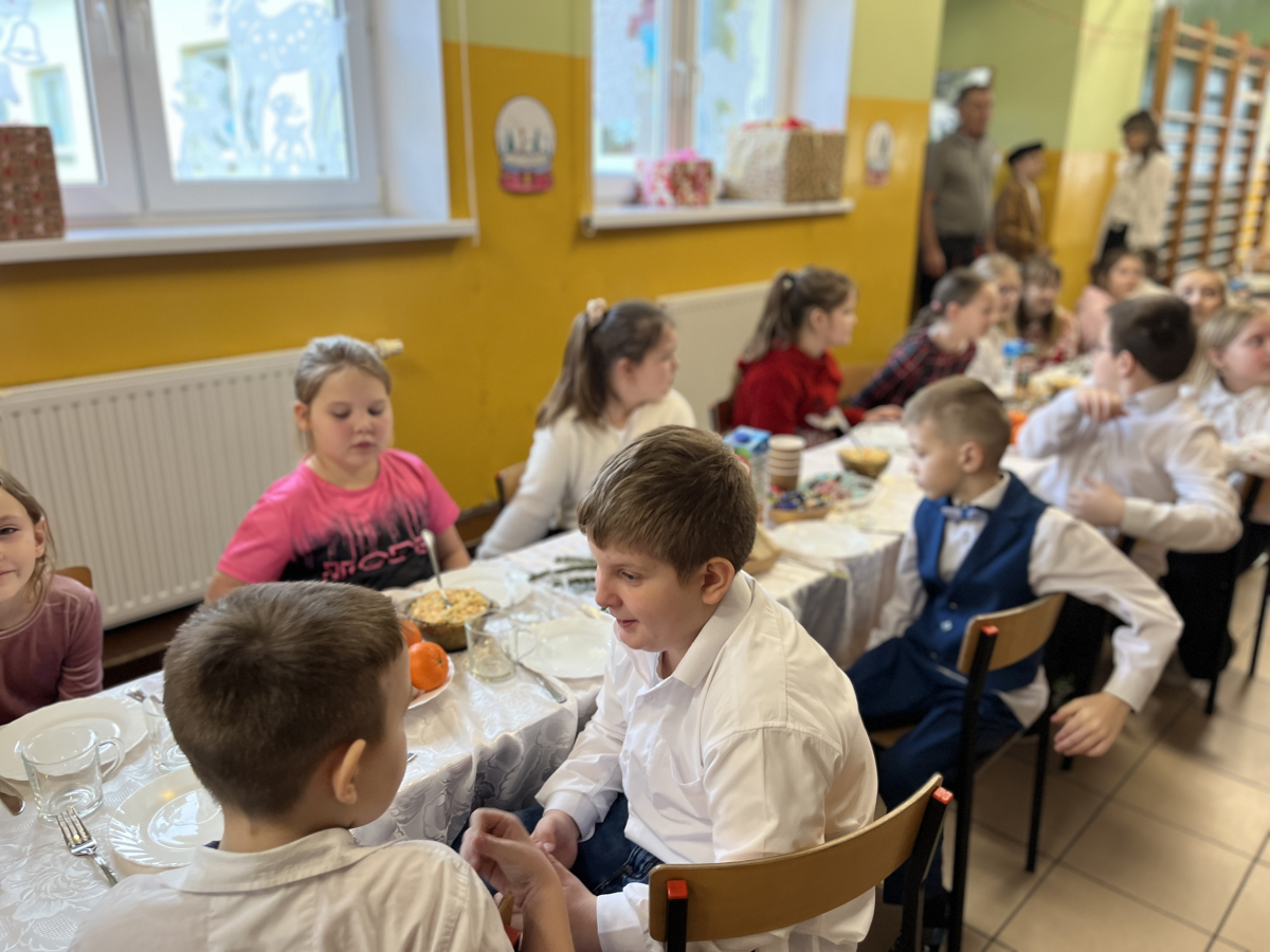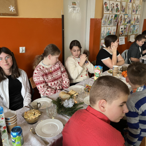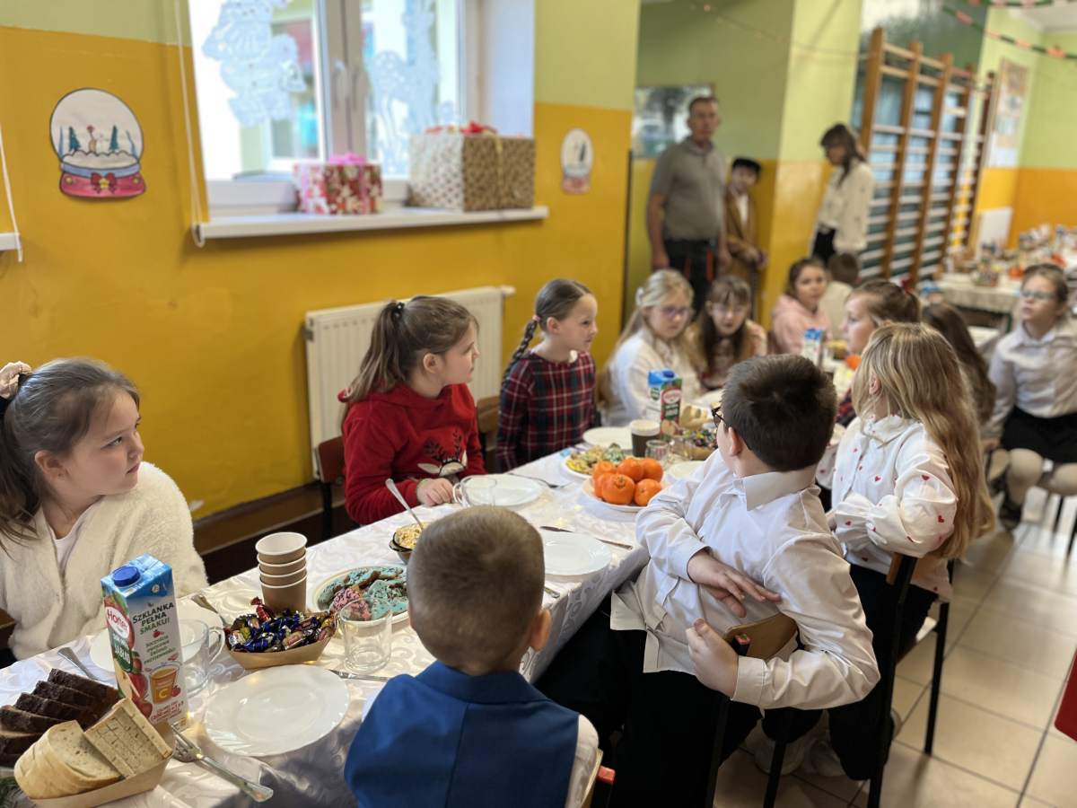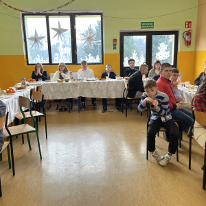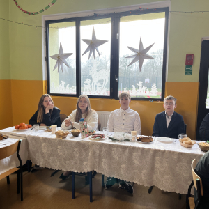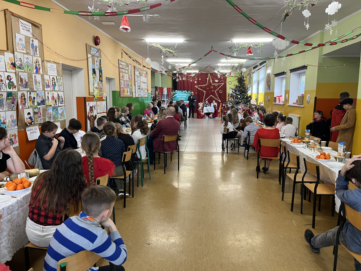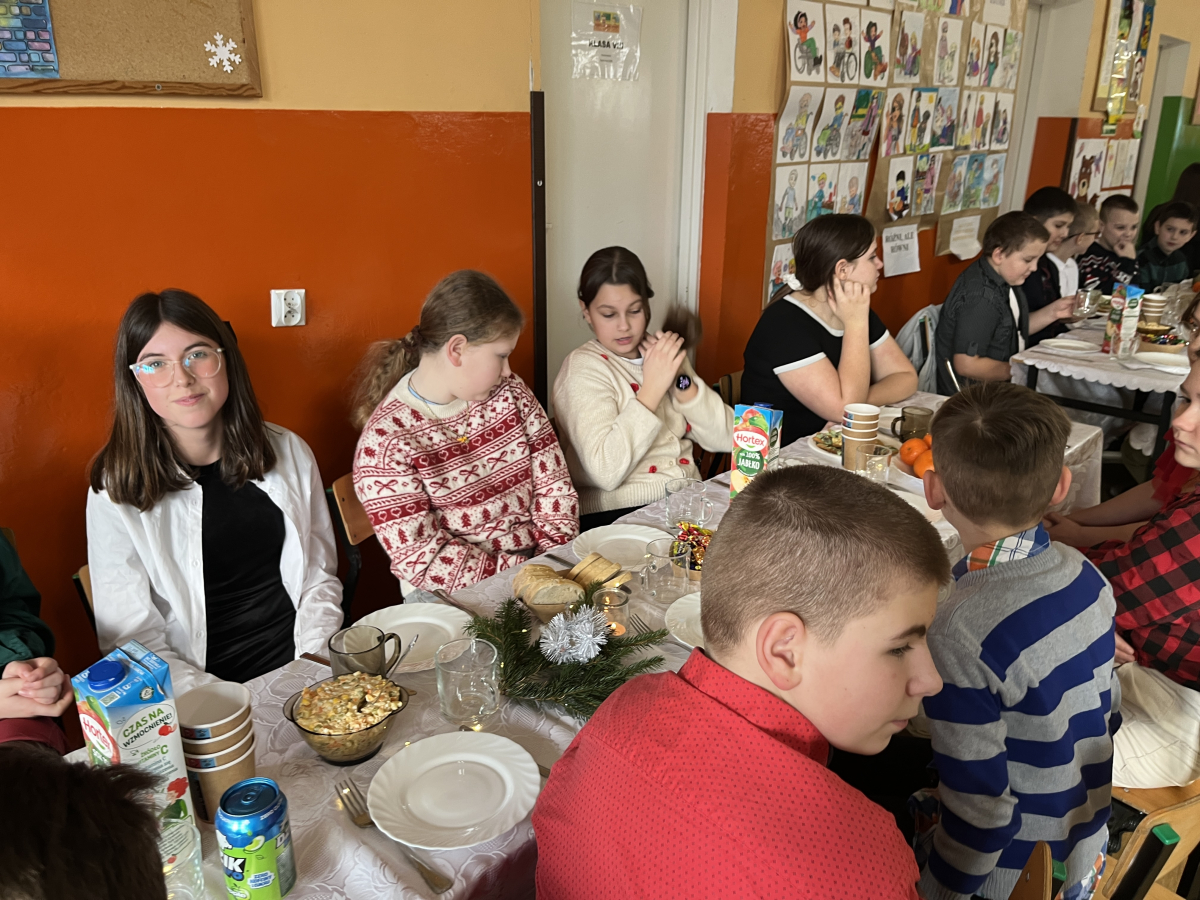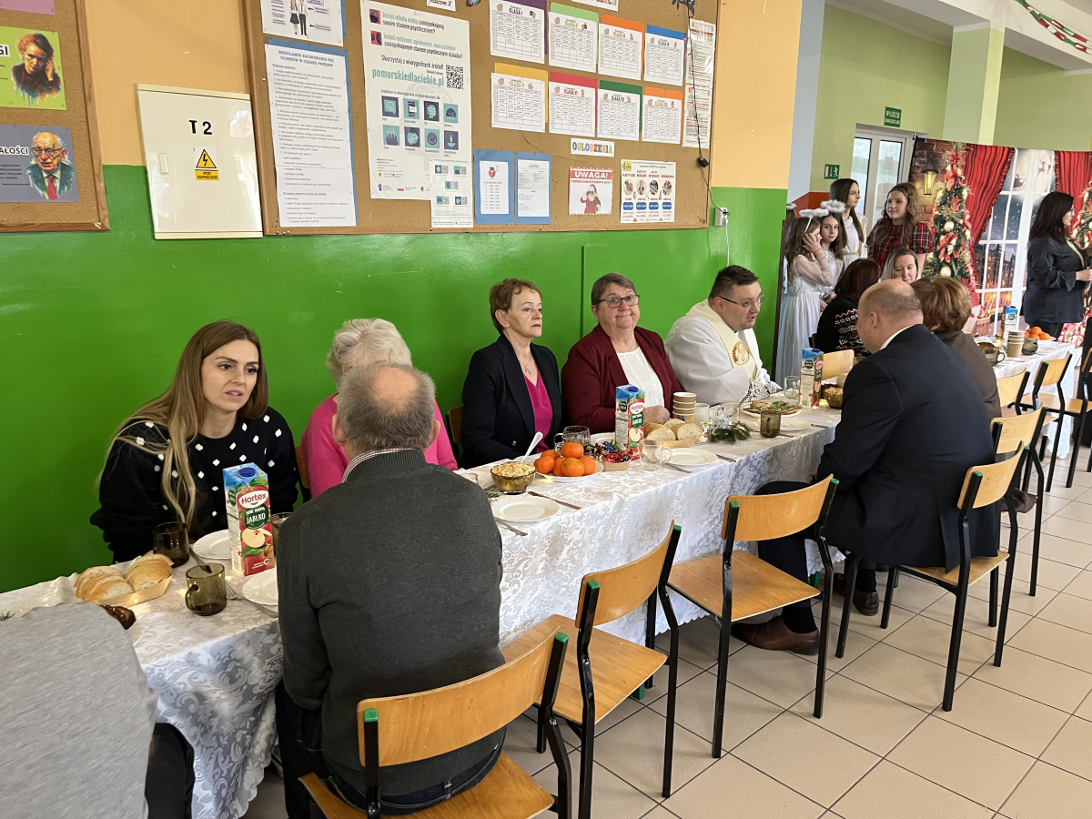 Po części artystycznej wszyscy uczestnicy spotkania podzielili się opłatkiem, składając sobie serdeczne, świąteczne życzenia. Zwieńczeniem uroczystości była wspólna wigilia, która przebiegła w ciepłej, rodzinnej atmosferze i stała się okazją do rozmów, wspomnień oraz integracji całej społeczności szkolnej. Spotkanie zakończyło się wspólnym kolędowaniem, które pięknie dopełniło ten wyjątkowy, świąteczny czas.