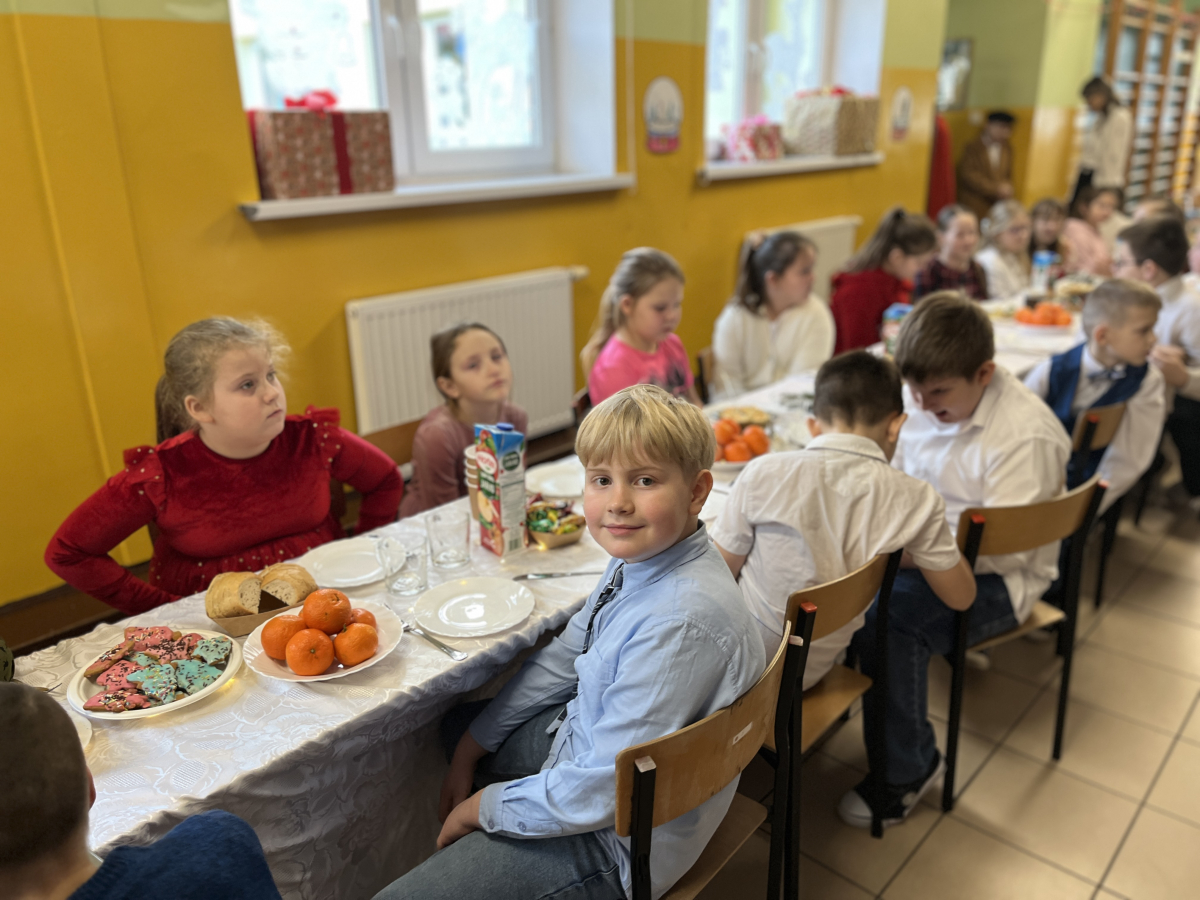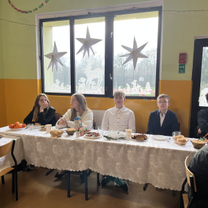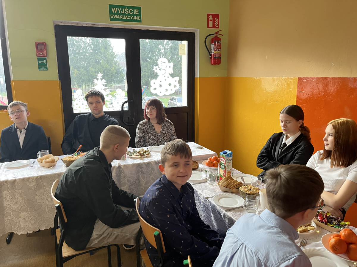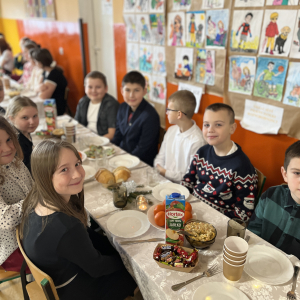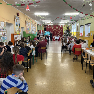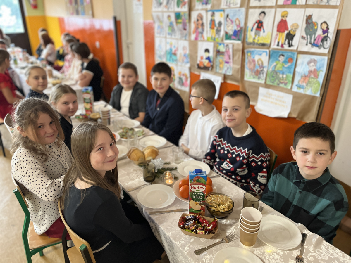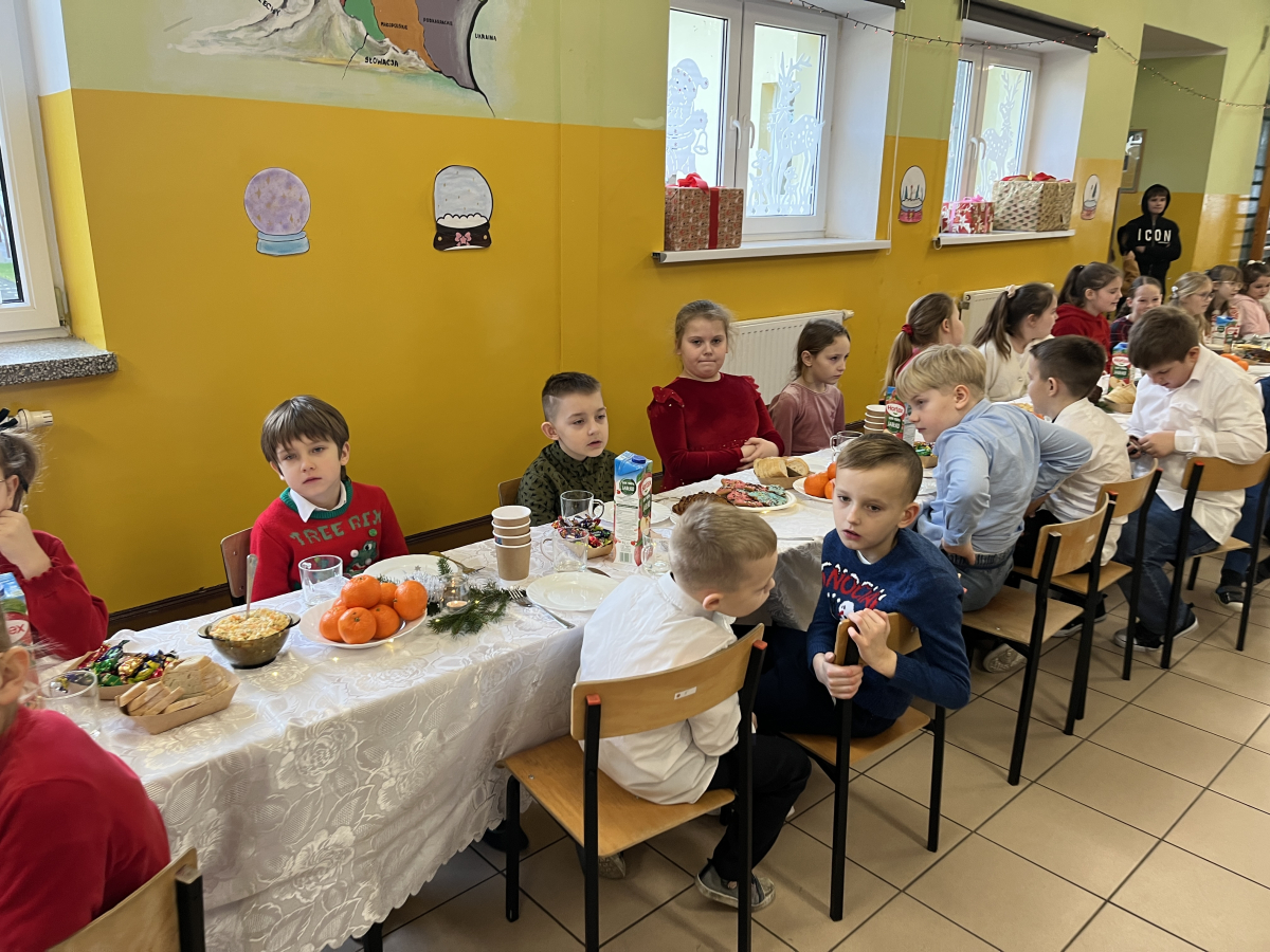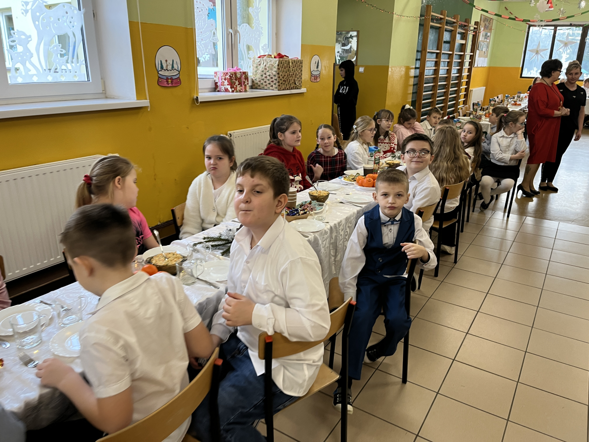 Po części artystycznej wszyscy uczestnicy spotkania podzielili się opłatkiem, składając sobie serdeczne, świąteczne życzenia. Zwieńczeniem uroczystości była wspólna wigilia, która przebiegła w ciepłej, rodzinnej atmosferze i stała się okazją do rozmów, wspomnień oraz integracji całej społeczności szkolnej. Spotkanie zakończyło się wspólnym kolędowaniem, które pięknie dopełniło ten wyjątkowy, świąteczny czas.