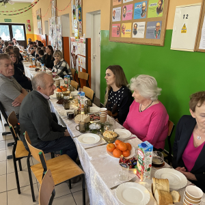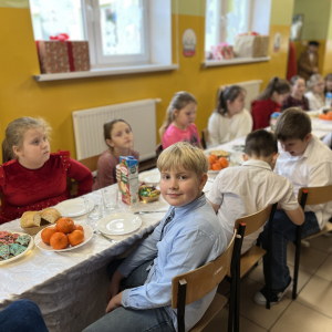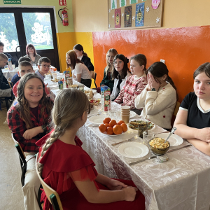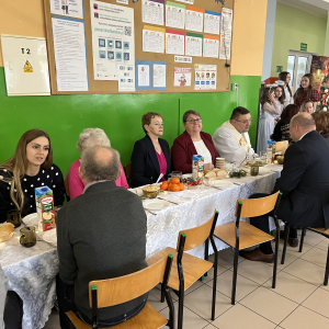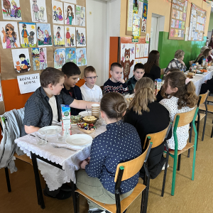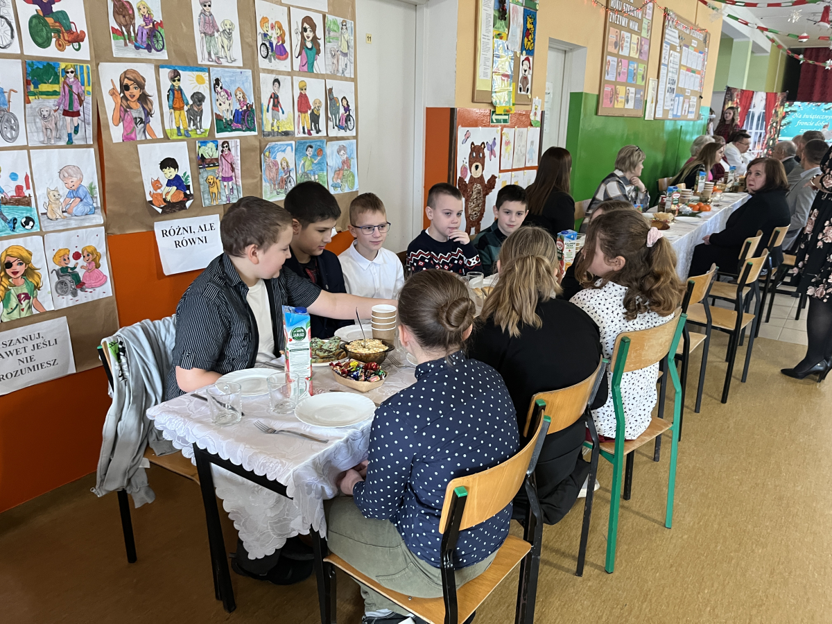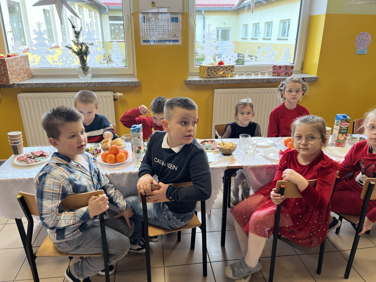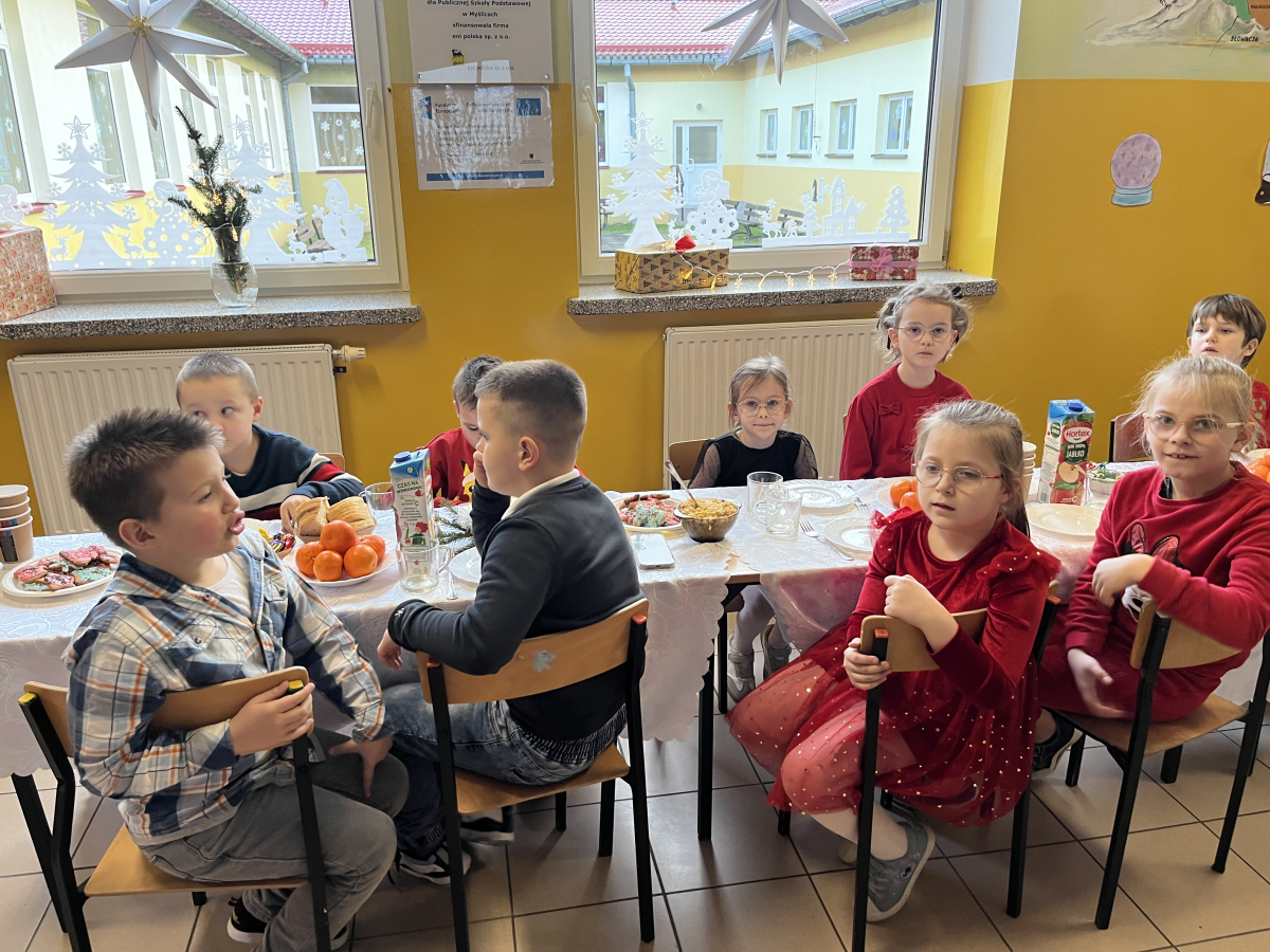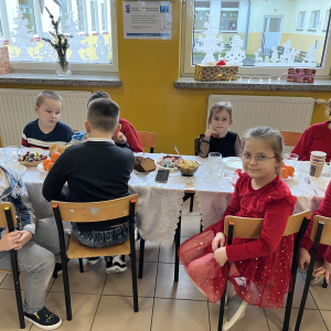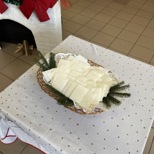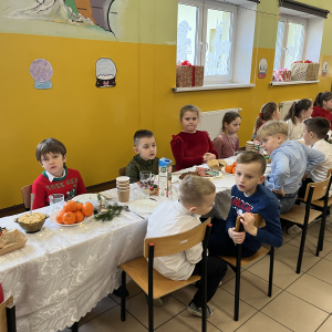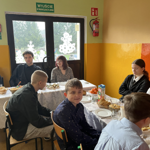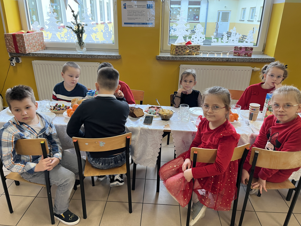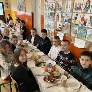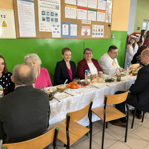 Po części artystycznej wszyscy uczestnicy spotkania podzielili się opłatkiem, składając sobie serdeczne, świąteczne życzenia. Zwieńczeniem uroczystości była wspólna wigilia, która przebiegła w ciepłej, rodzinnej atmosferze i stała się okazją do rozmów, wspomnień oraz integracji całej społeczności szkolnej. Spotkanie zakończyło się wspólnym kolędowaniem, które pięknie dopełniło ten wyjątkowy, świąteczny czas.