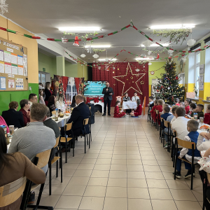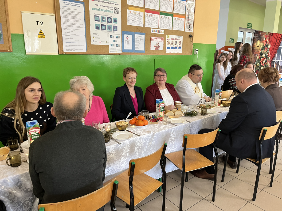 19 grudnia 2025 roku w naszej szkole odbyło się uroczyste spotkanie wigilijne, które zgromadziło całą społeczność szkolną oraz zaproszonych gości. Wśród nich znaleźli się: Wójt Gminy Stary Dzierzgoń – pan Wojciech Puton, Sekretarz Gminy Stary Dzierzgoń – pani Dorota Letkiman, a także emerytowani pracownicy szkoły. Niezmiernie miło było nam gościć osoby, które przez wiele lat współtworzyły historię naszej placówki i na stałe zapisały się w jej pamięci.