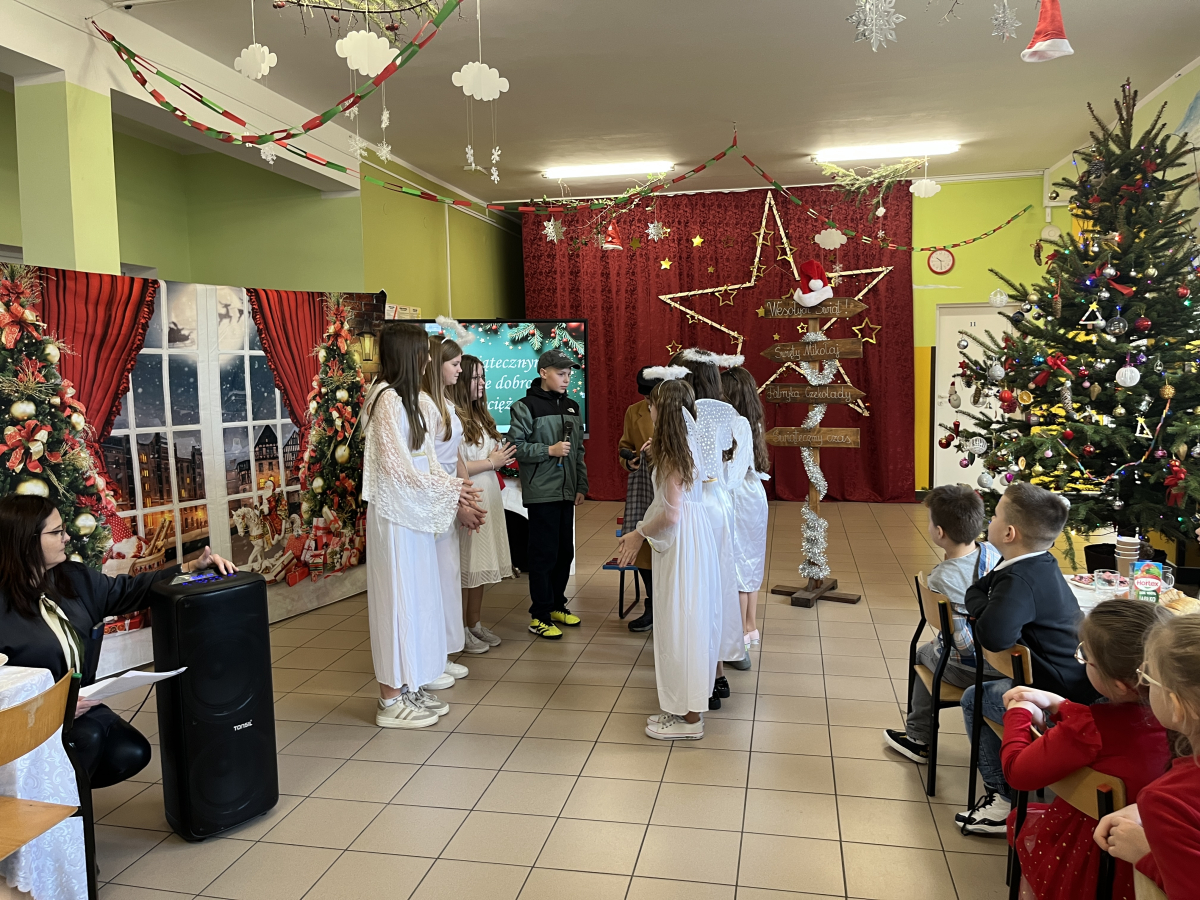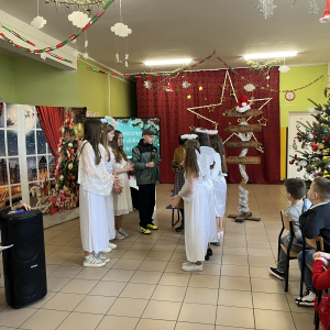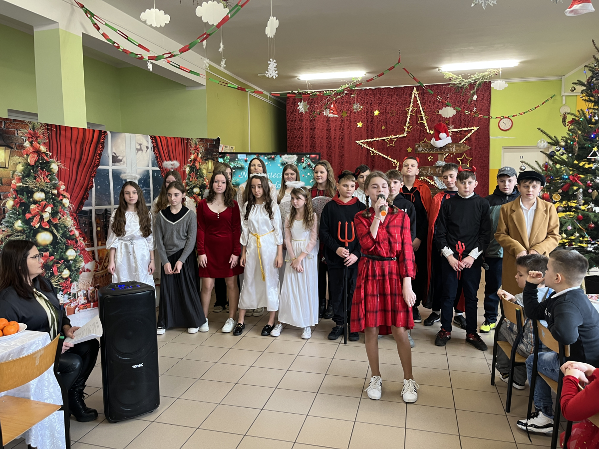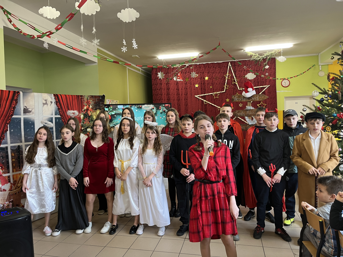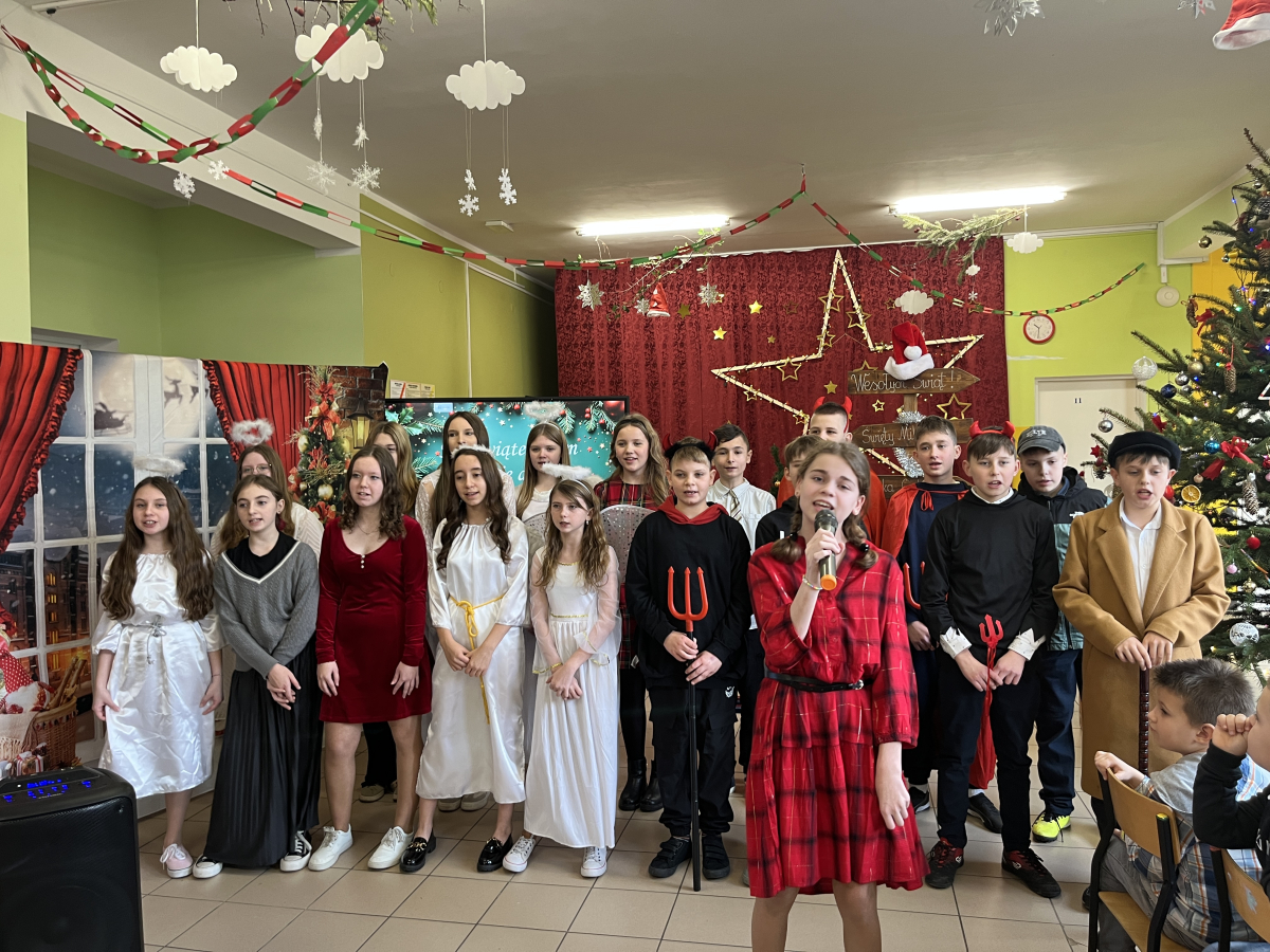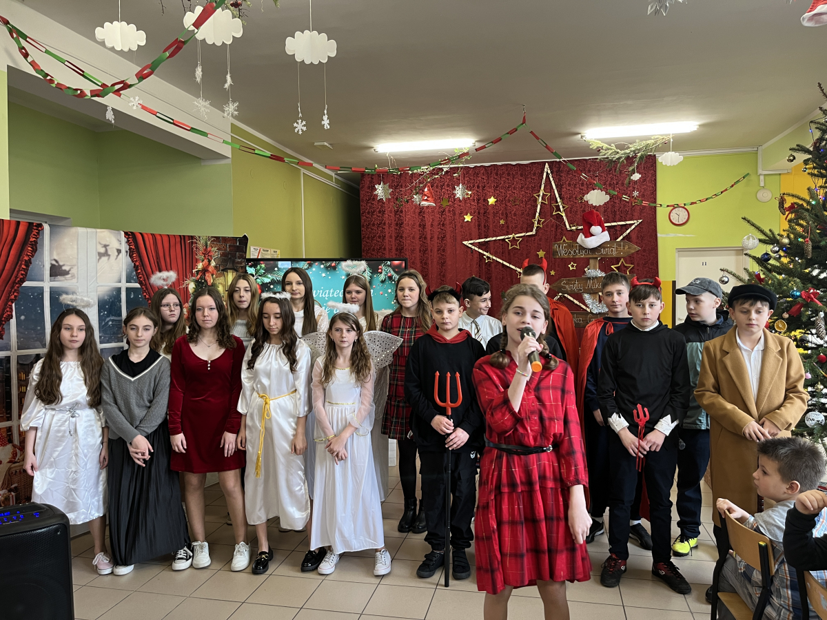 Wyjątkowym punktem spotkania były jasełka przygotowane przez uczniów klasy VI pod hasłem „Na świątecznym froncie dobro zwycięża”. Przedstawienie w poruszający sposób ukazywało współczesne, trudne sytuacje z życia codziennego – kłótnie w rodzinie, niepokojące wiadomości płynące ze świata oraz niewłaściwe postawy młodzieży. Dzięki obecności aniołów każda z tych historii znalazła jednak dobre zakończenie – konflikty zamieniały się w zgodę, strach w nadzieję, a obojętność w empatię i zrozumienie. Przekaz płynący ze sceny przypomniał wszystkim, że dobro ma niezwykłą moc i nawet w najtrudniejszych chwilach potrafi zwyciężyć.