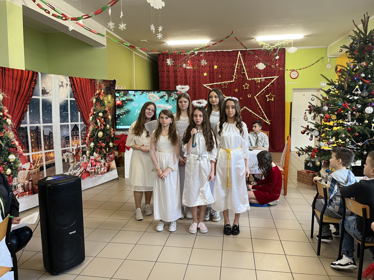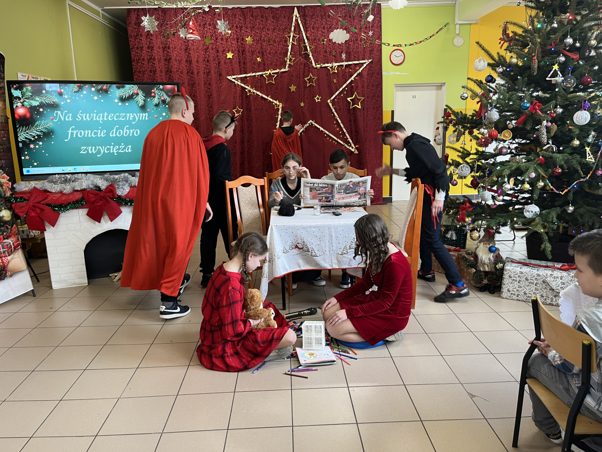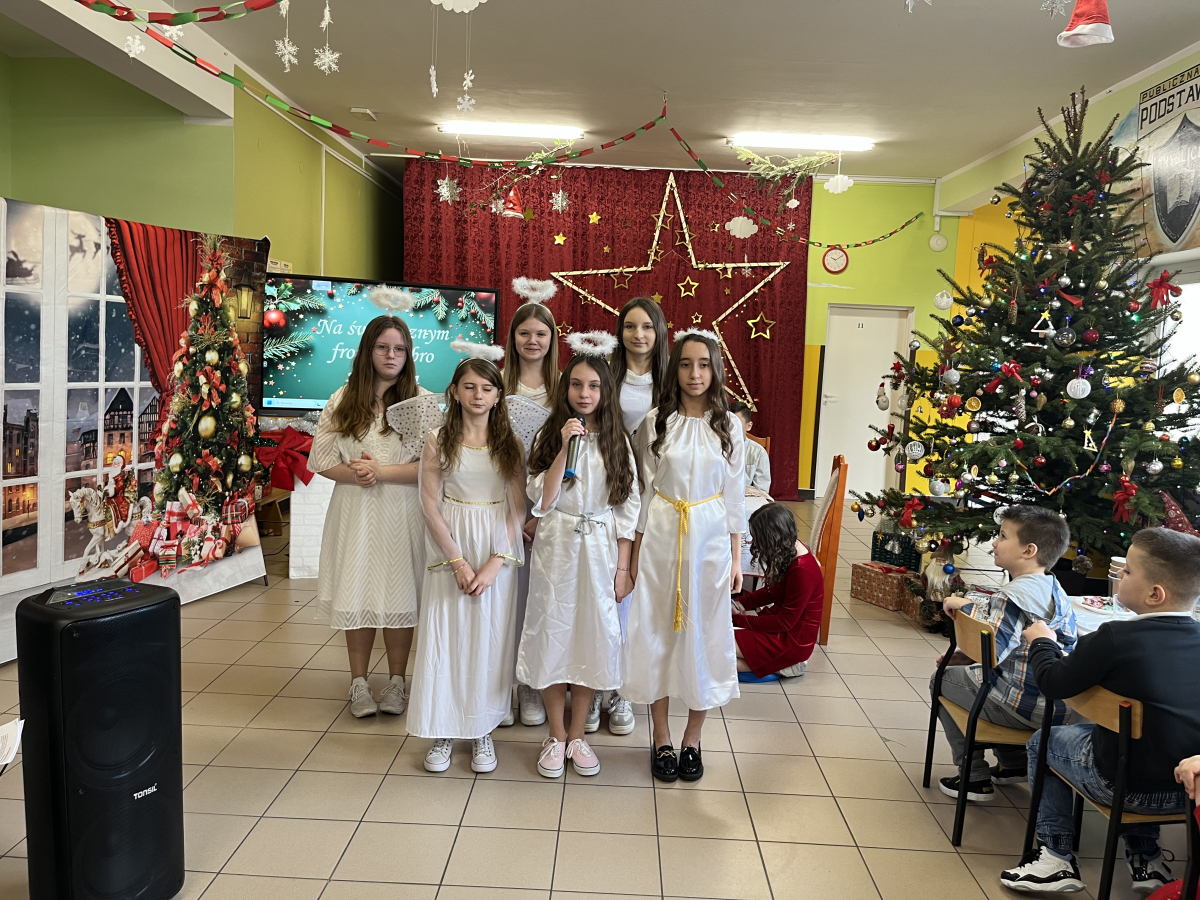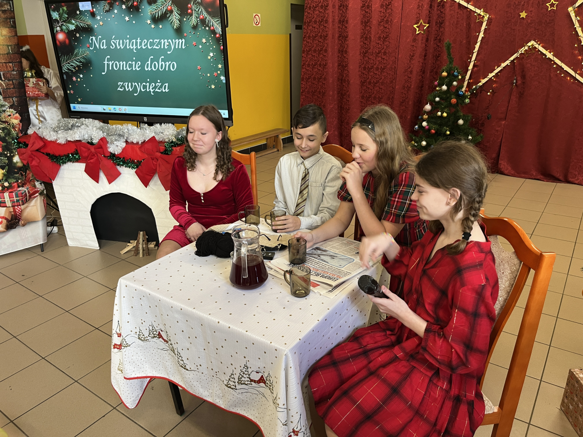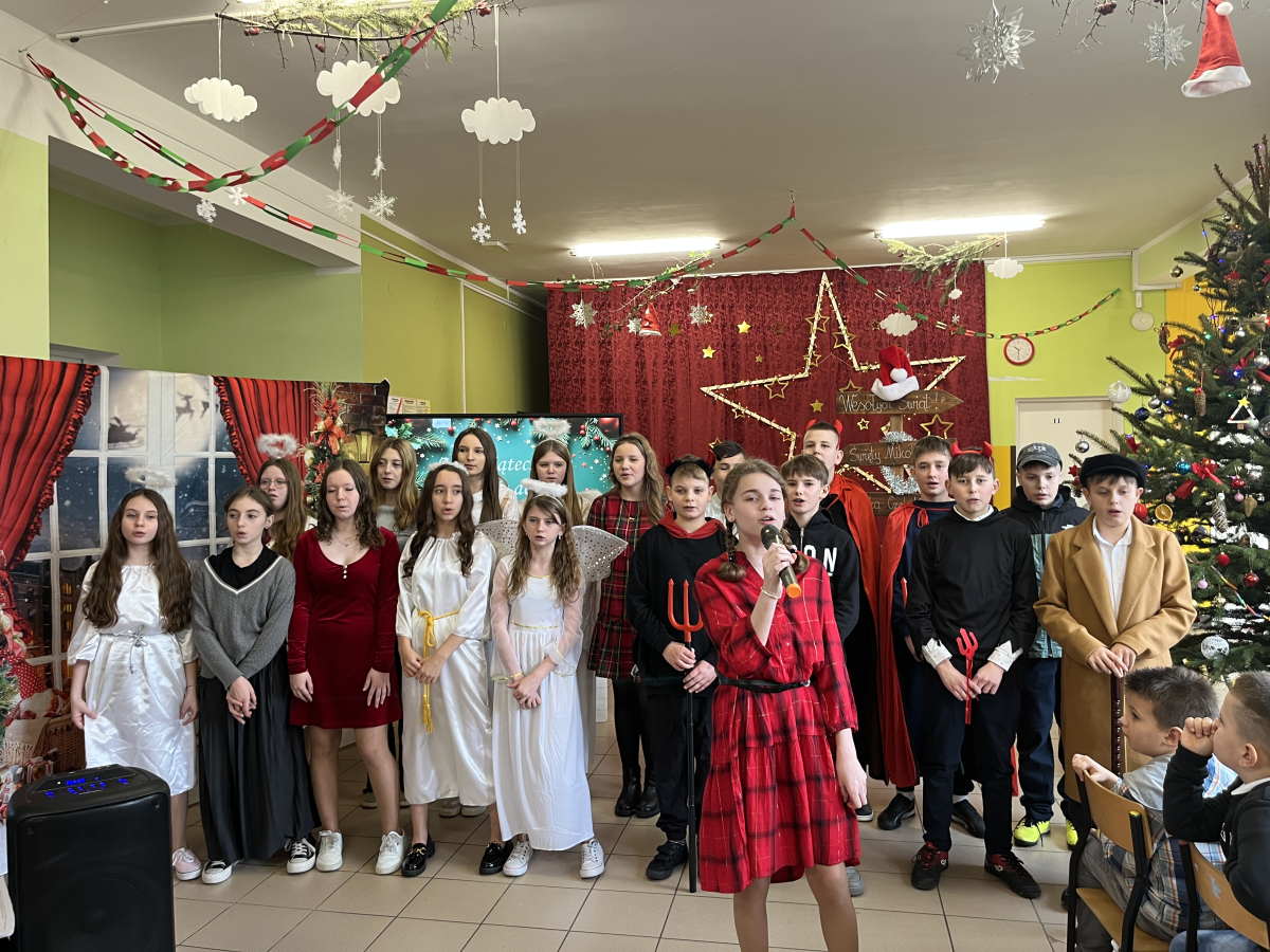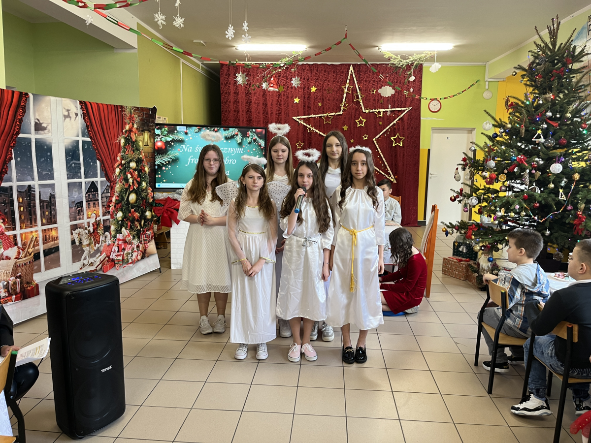 Wyjątkowym punktem spotkania były jasełka przygotowane przez uczniów klasy VI pod hasłem „Na świątecznym froncie dobro zwycięża”. Przedstawienie w poruszający sposób ukazywało współczesne, trudne sytuacje z życia codziennego – kłótnie w rodzinie, niepokojące wiadomości płynące ze świata oraz niewłaściwe postawy młodzieży. Dzięki obecności aniołów każda z tych historii znalazła jednak dobre zakończenie – konflikty zamieniały się w zgodę, strach w nadzieję, a obojętność w empatię i zrozumienie. Przekaz płynący ze sceny przypomniał wszystkim, że dobro ma niezwykłą moc i nawet w najtrudniejszych chwilach potrafi zwyciężyć.