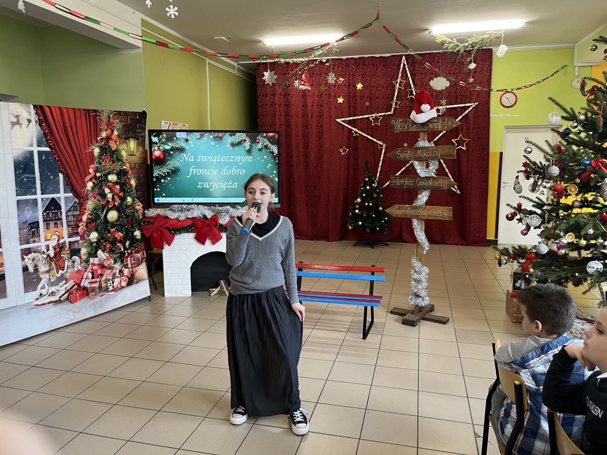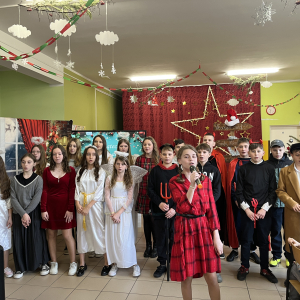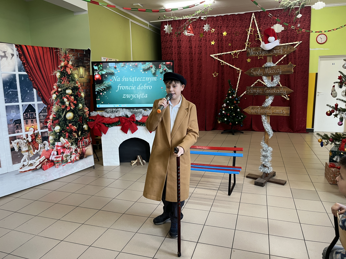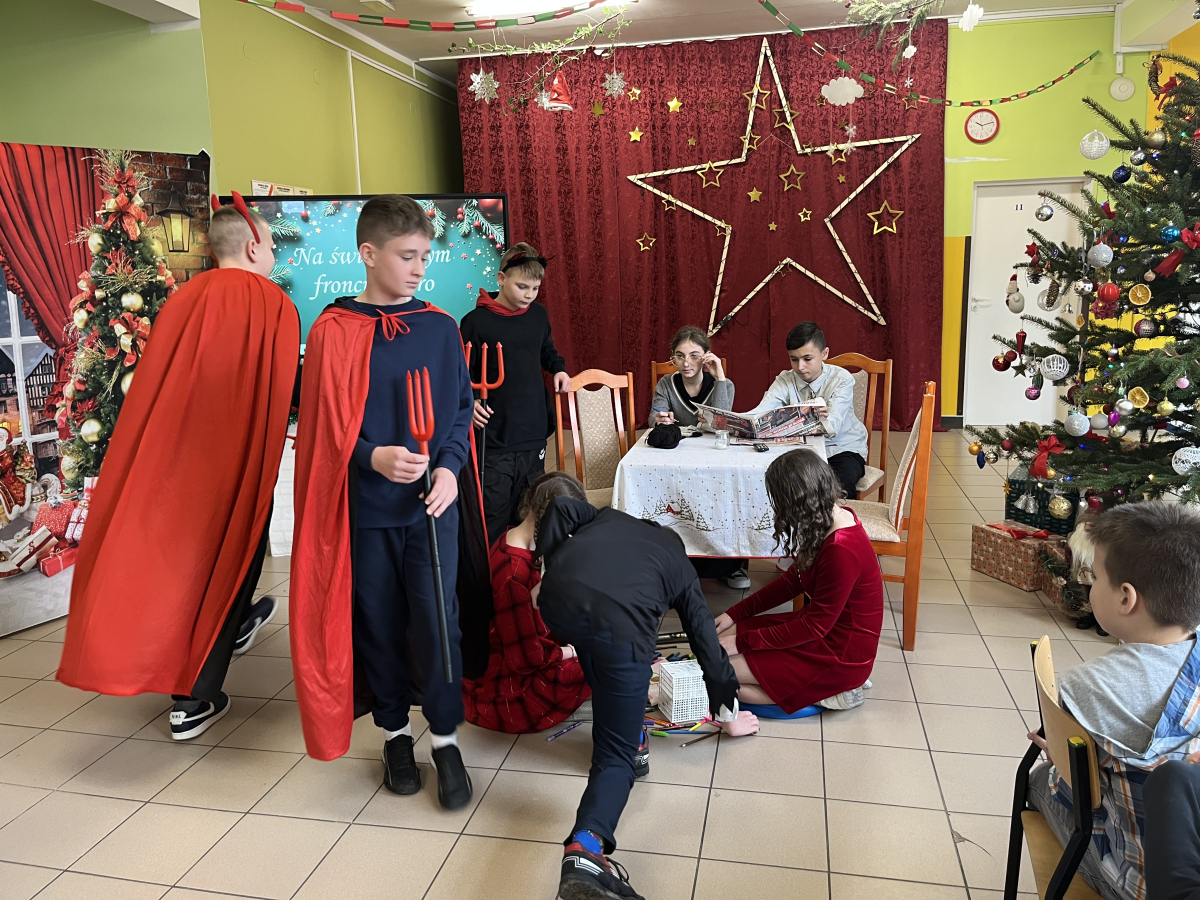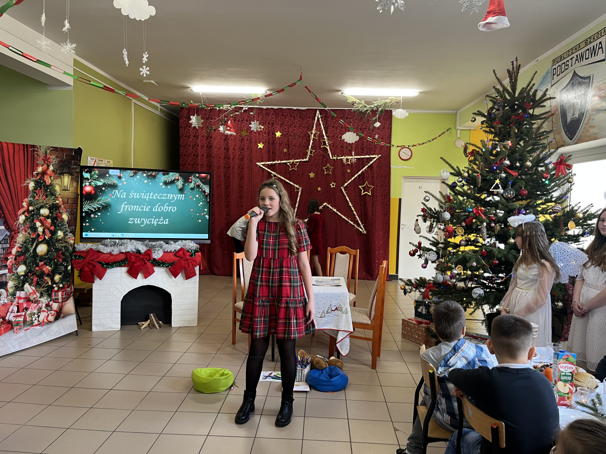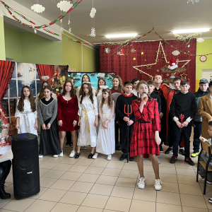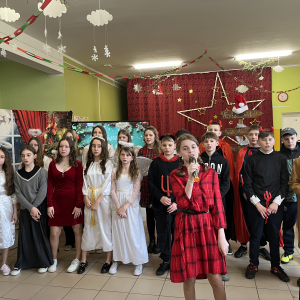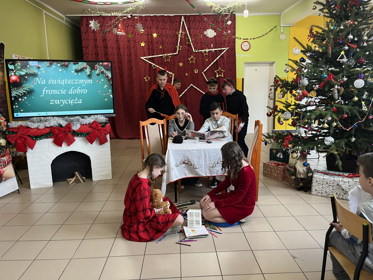 Wyjątkowym punktem spotkania były jasełka przygotowane przez uczniów klasy VI pod hasłem „Na świątecznym froncie dobro zwycięża”. Przedstawienie w poruszający sposób ukazywało współczesne, trudne sytuacje z życia codziennego – kłótnie w rodzinie, niepokojące wiadomości płynące ze świata oraz niewłaściwe postawy młodzieży. Dzięki obecności aniołów każda z tych historii znalazła jednak dobre zakończenie – konflikty zamieniały się w zgodę, strach w nadzieję, a obojętność w empatię i zrozumienie. Przekaz płynący ze sceny przypomniał wszystkim, że dobro ma niezwykłą moc i nawet w najtrudniejszych chwilach potrafi zwyciężyć.