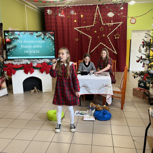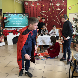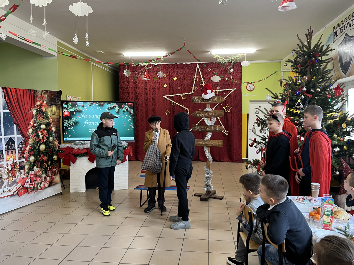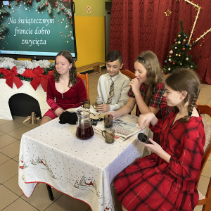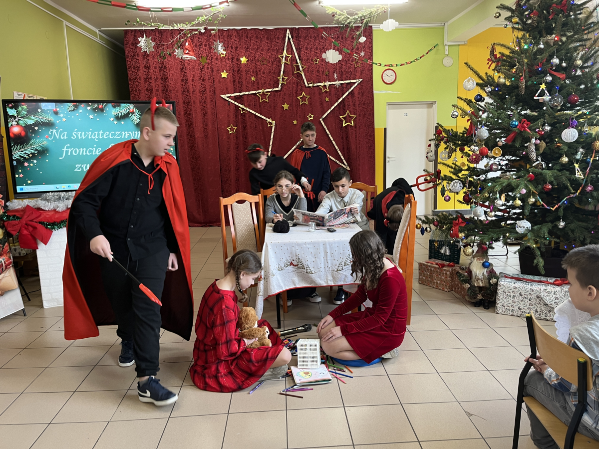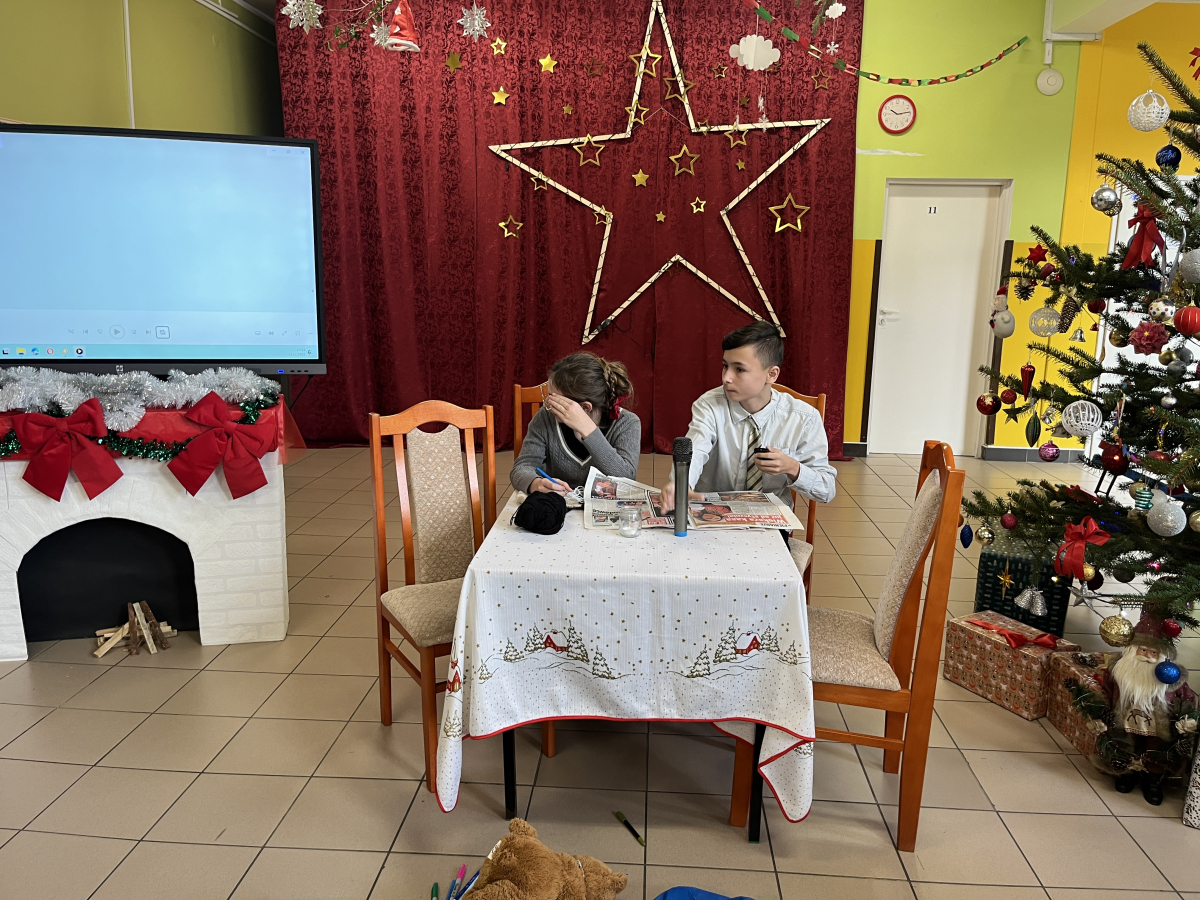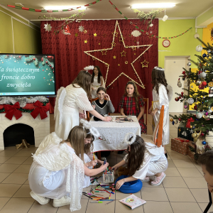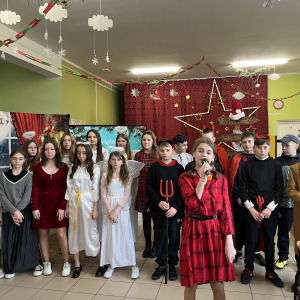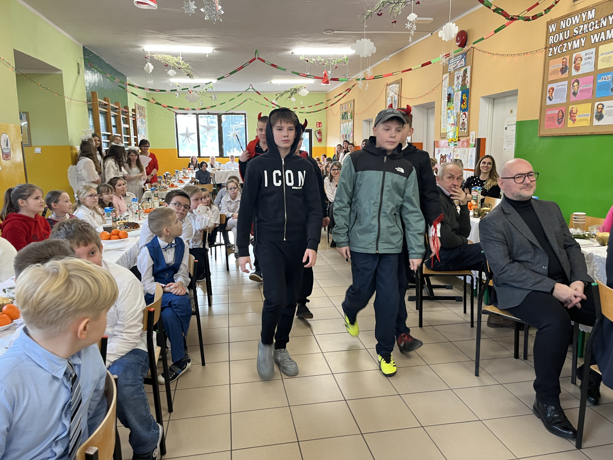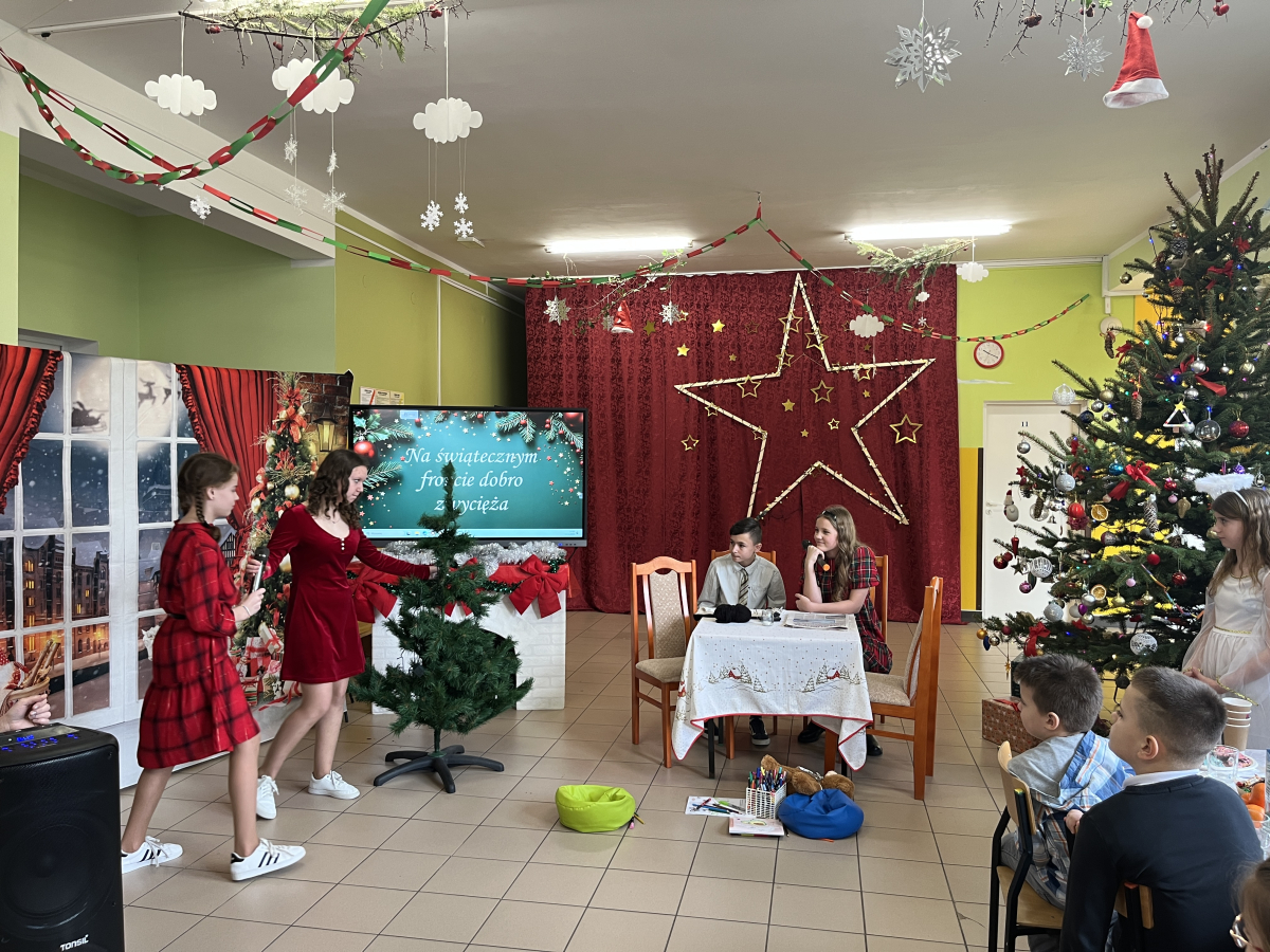 Wyjątkowym punktem spotkania były jasełka przygotowane przez uczniów klasy VI pod hasłem „Na świątecznym froncie dobro zwycięża”. Przedstawienie w poruszający sposób ukazywało współczesne, trudne sytuacje z życia codziennego – kłótnie w rodzinie, niepokojące wiadomości płynące ze świata oraz niewłaściwe postawy młodzieży. Dzięki obecności aniołów każda z tych historii znalazła jednak dobre zakończenie – konflikty zamieniały się w zgodę, strach w nadzieję, a obojętność w empatię i zrozumienie. Przekaz płynący ze sceny przypomniał wszystkim, że dobro ma niezwykłą moc i nawet w najtrudniejszych chwilach potrafi zwyciężyć.
