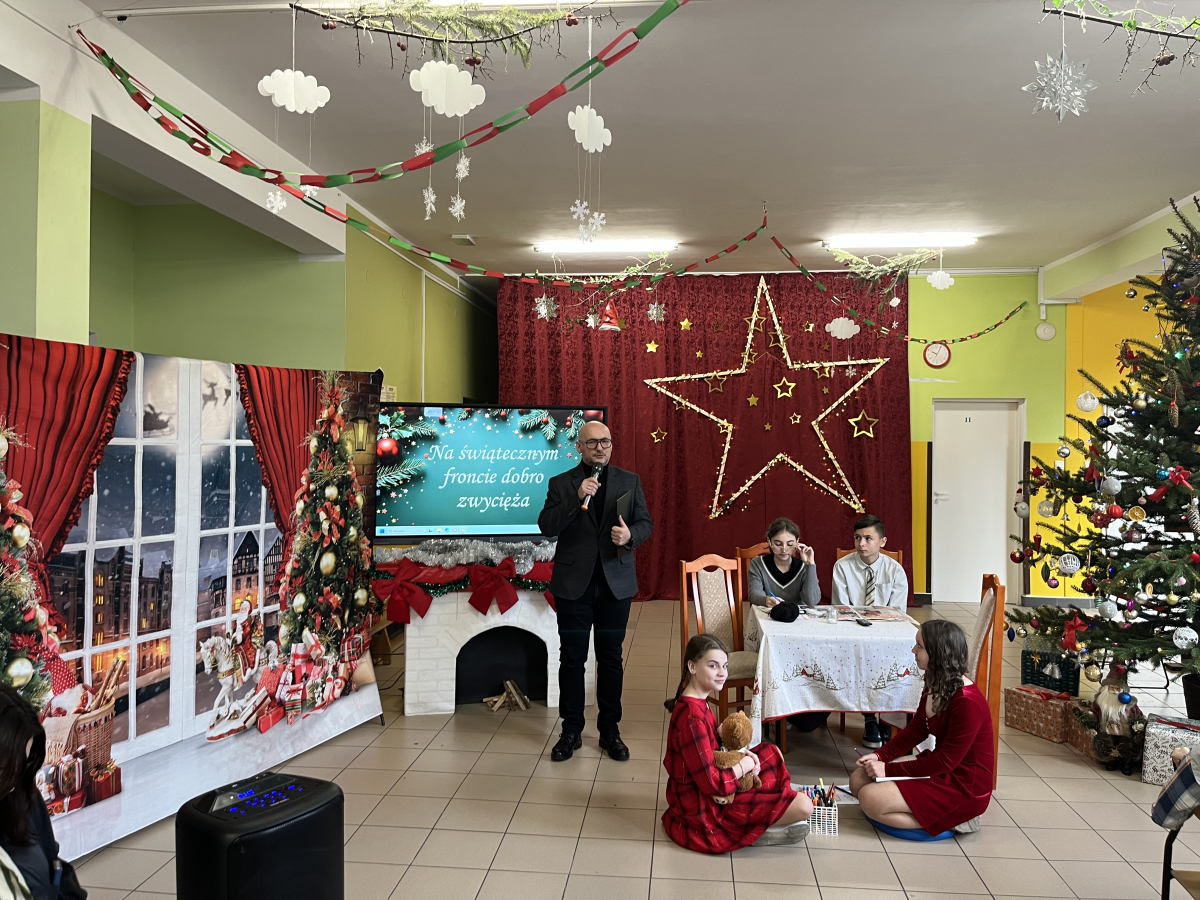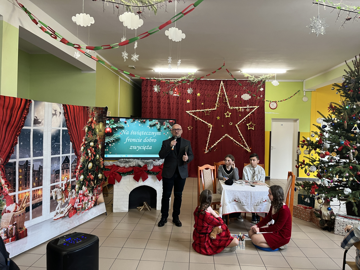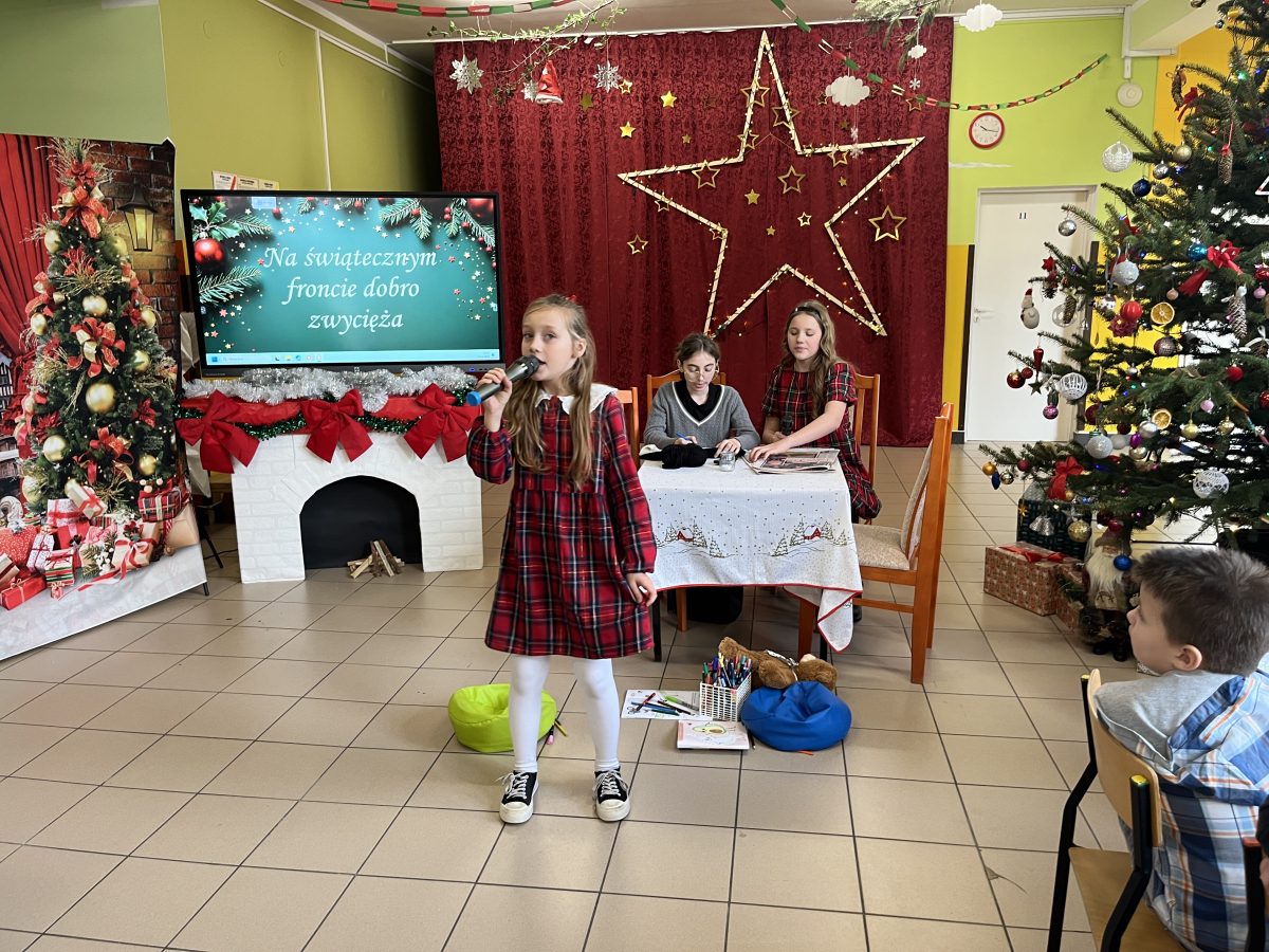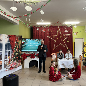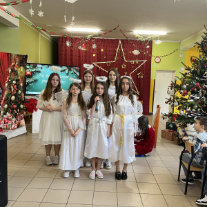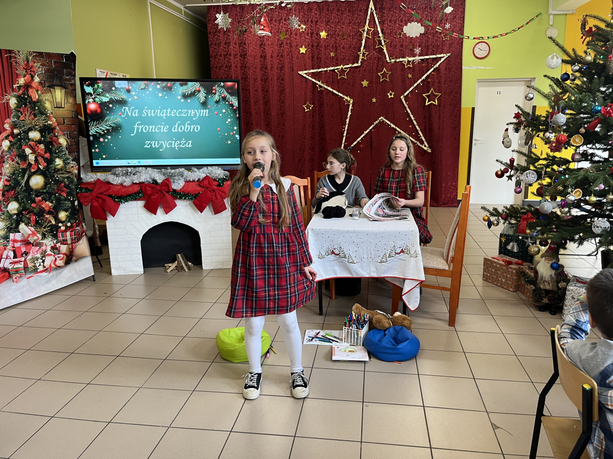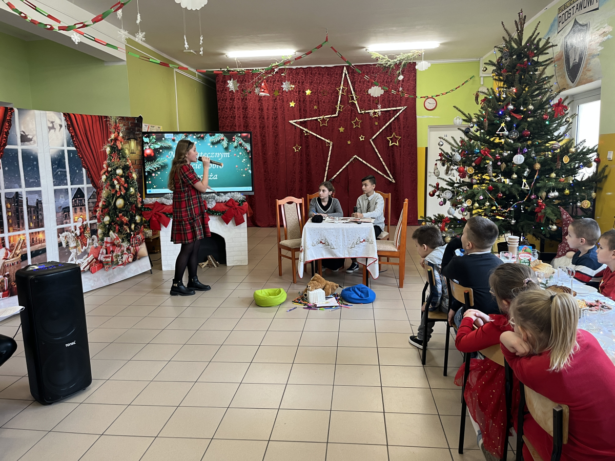 Wyjątkowym punktem spotkania były jasełka przygotowane przez uczniów klasy VI pod hasłem „Na świątecznym froncie dobro zwycięża”. Przedstawienie w poruszający sposób ukazywało współczesne, trudne sytuacje z życia codziennego – kłótnie w rodzinie, niepokojące wiadomości płynące ze świata oraz niewłaściwe postawy młodzieży. Dzięki obecności aniołów każda z tych historii znalazła jednak dobre zakończenie – konflikty zamieniały się w zgodę, strach w nadzieję, a obojętność w empatię i zrozumienie. Przekaz płynący ze sceny przypomniał wszystkim, że dobro ma niezwykłą moc i nawet w najtrudniejszych chwilach potrafi zwyciężyć.