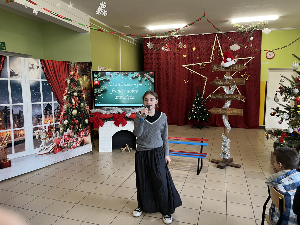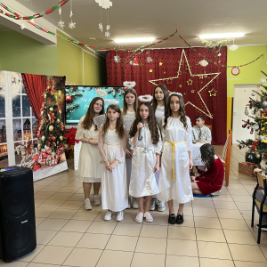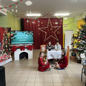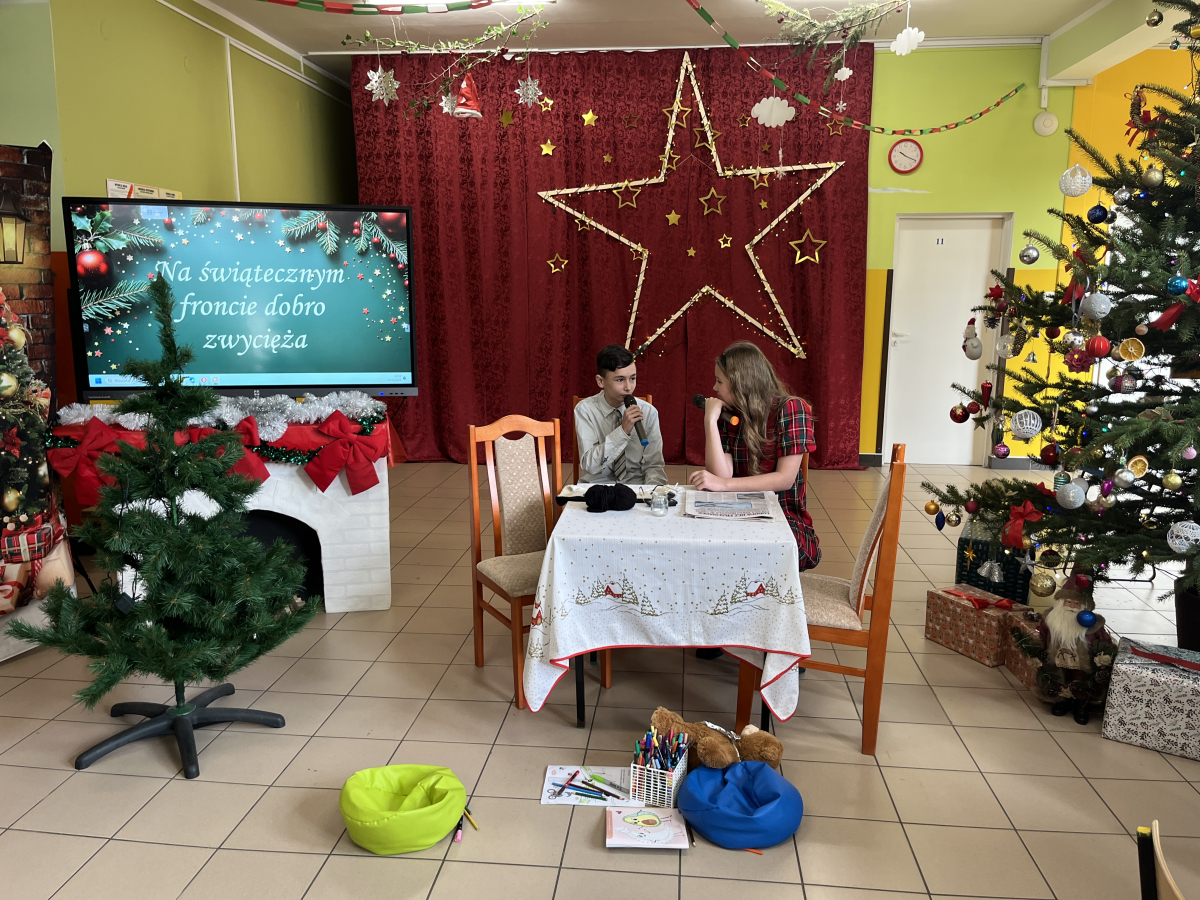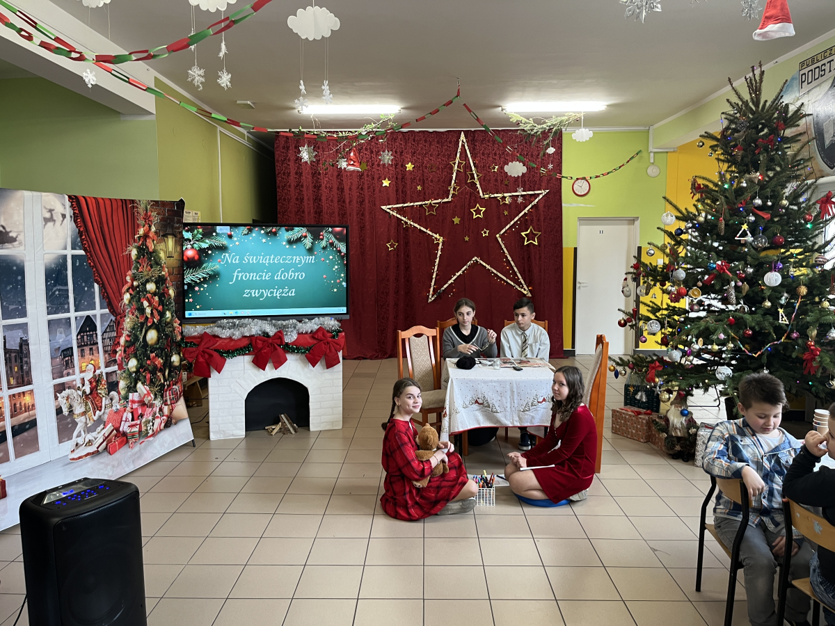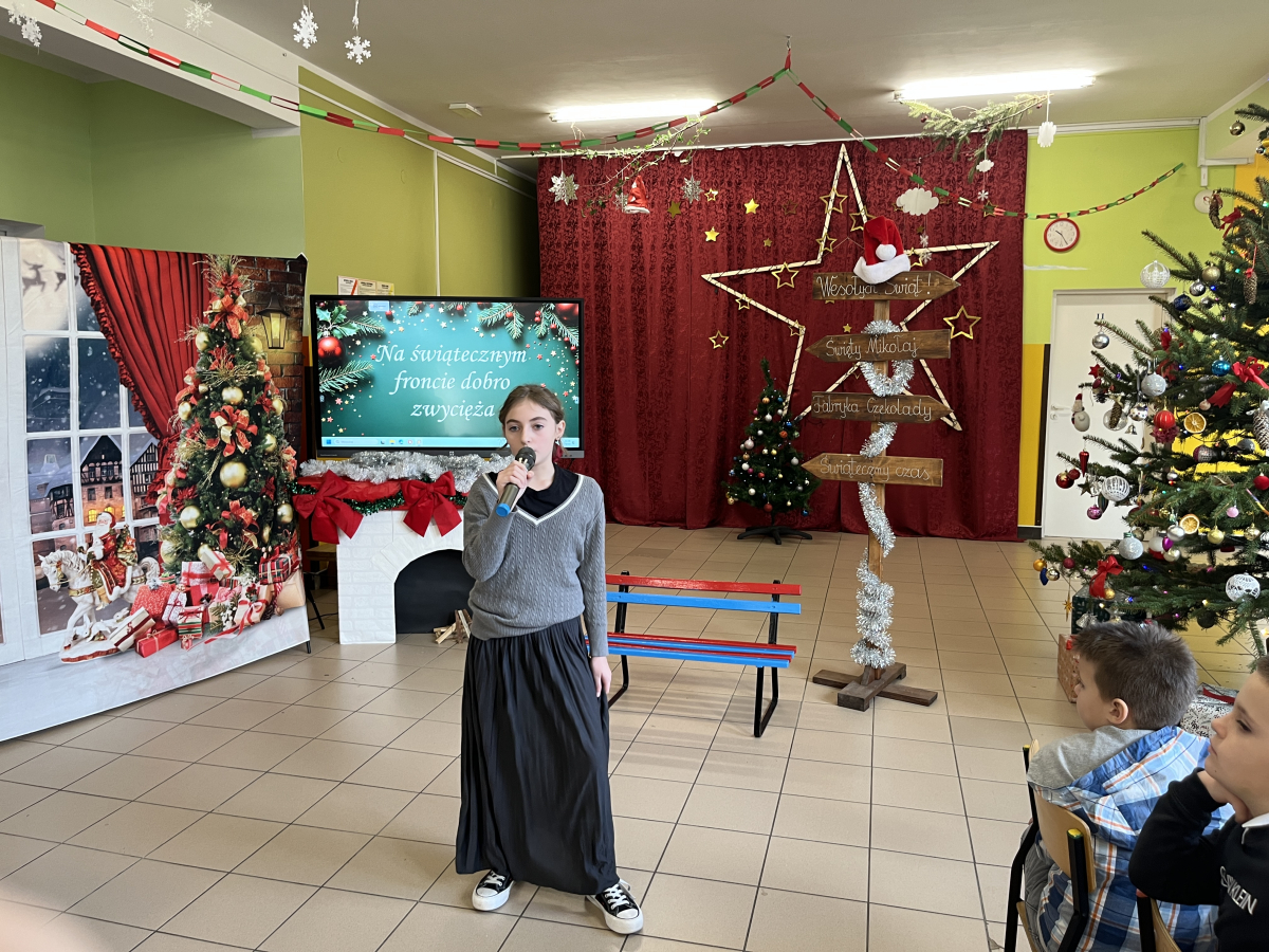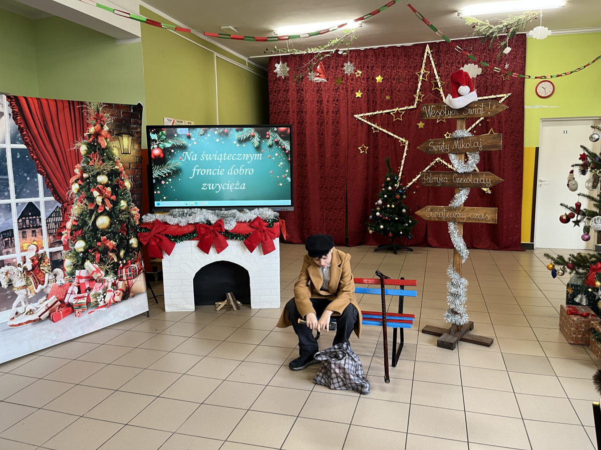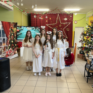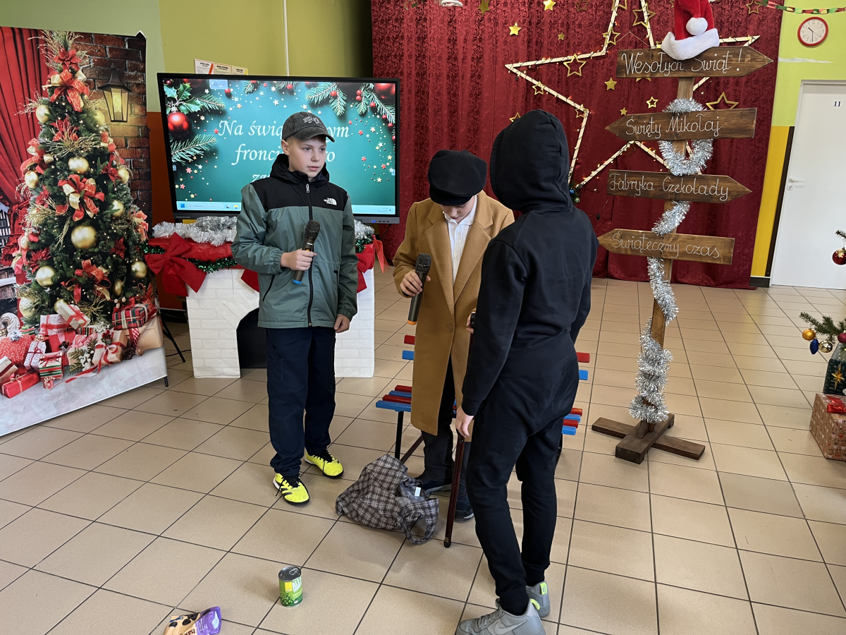 Wyjątkowym punktem spotkania były jasełka przygotowane przez uczniów klasy VI pod hasłem „Na świątecznym froncie dobro zwycięża”. Przedstawienie w poruszający sposób ukazywało współczesne, trudne sytuacje z życia codziennego – kłótnie w rodzinie, niepokojące wiadomości płynące ze świata oraz niewłaściwe postawy młodzieży. Dzięki obecności aniołów każda z tych historii znalazła jednak dobre zakończenie – konflikty zamieniały się w zgodę, strach w nadzieję, a obojętność w empatię i zrozumienie. Przekaz płynący ze sceny przypomniał wszystkim, że dobro ma niezwykłą moc i nawet w najtrudniejszych chwilach potrafi zwyciężyć.
