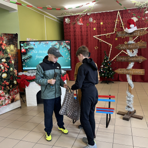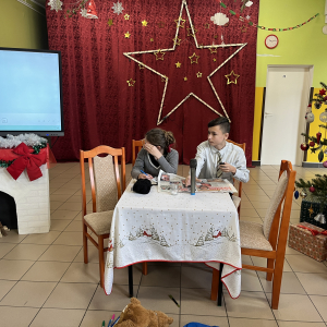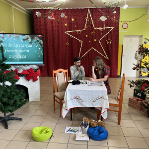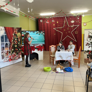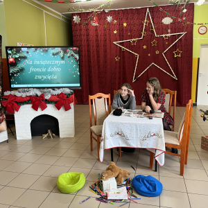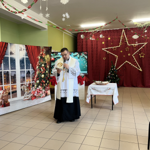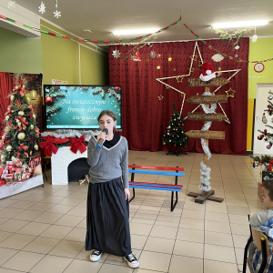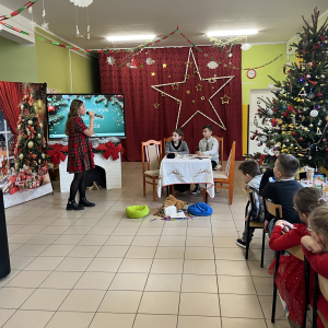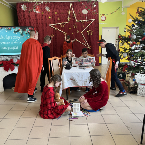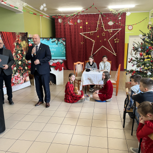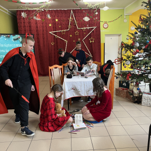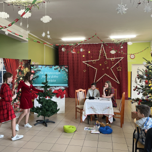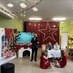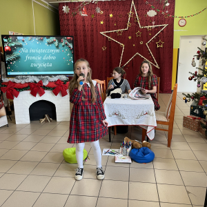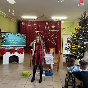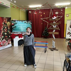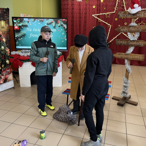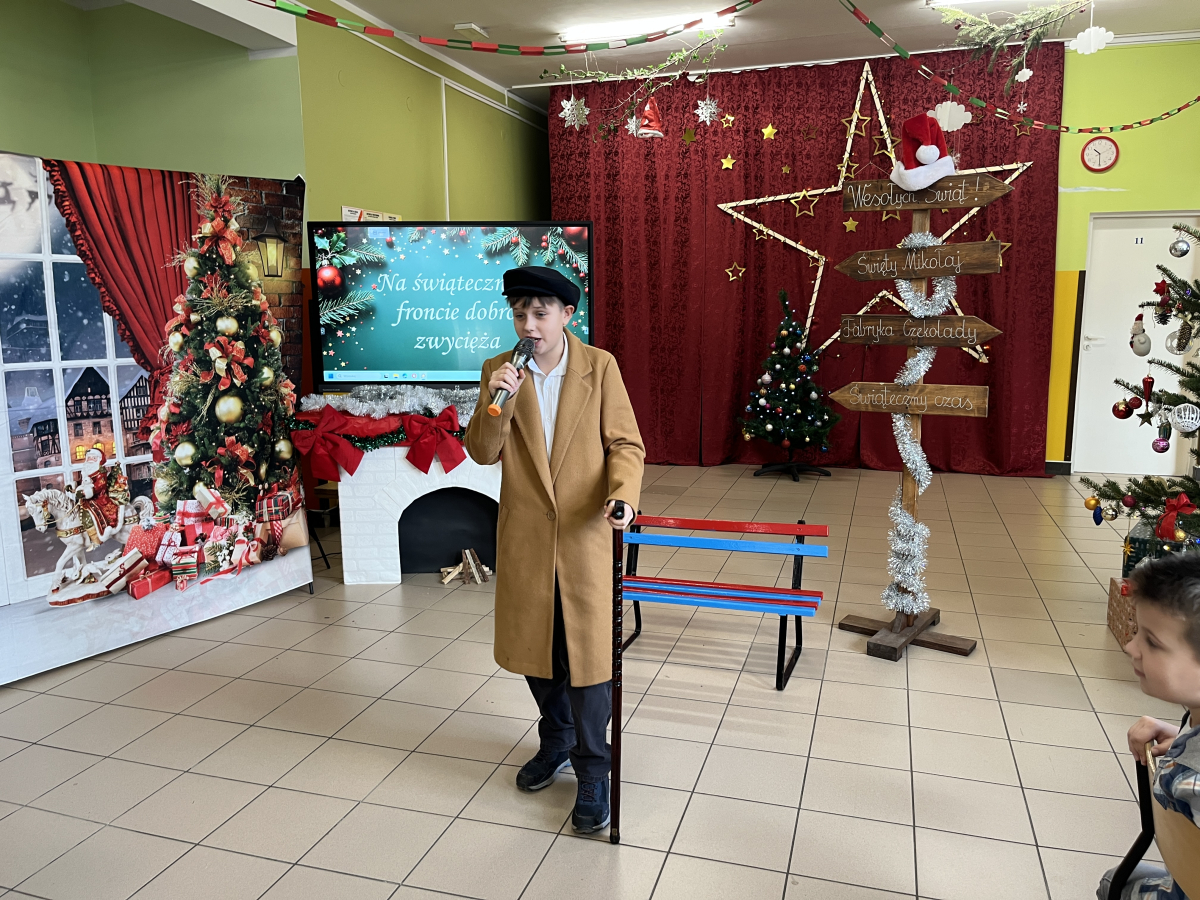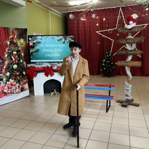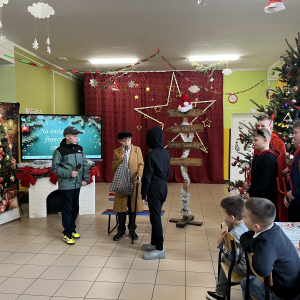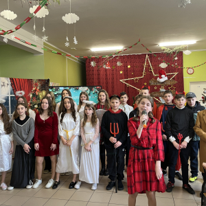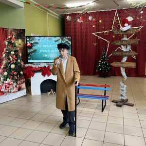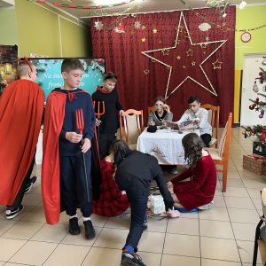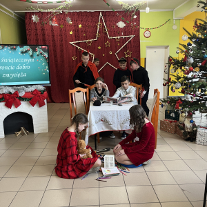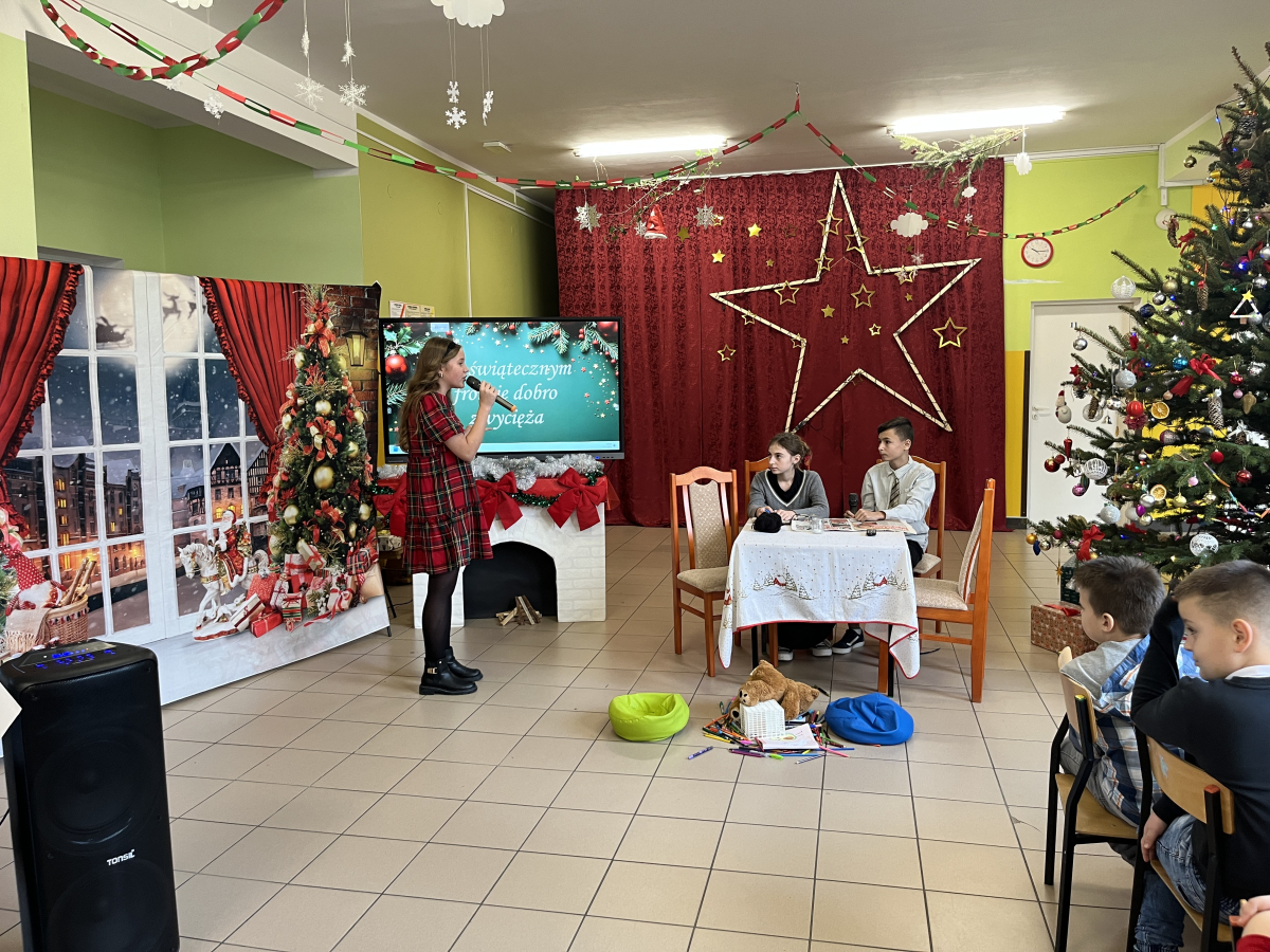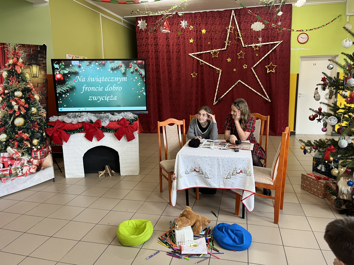 Wyjątkowym punktem spotkania były jasełka przygotowane przez uczniów klasy VI pod hasłem „Na świątecznym froncie dobro zwycięża”. Przedstawienie w poruszający sposób ukazywało współczesne, trudne sytuacje z życia codziennego – kłótnie w rodzinie, niepokojące wiadomości płynące ze świata oraz niewłaściwe postawy młodzieży. Dzięki obecności aniołów każda z tych historii znalazła jednak dobre zakończenie – konflikty zamieniały się w zgodę, strach w nadzieję, a obojętność w empatię i zrozumienie. Przekaz płynący ze sceny przypomniał wszystkim, że dobro ma niezwykłą moc i nawet w najtrudniejszych chwilach potrafi zwyciężyć.