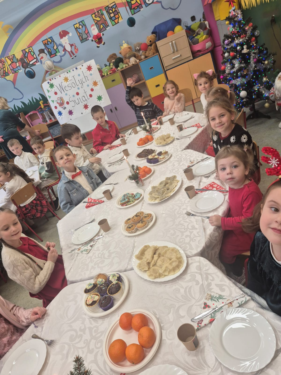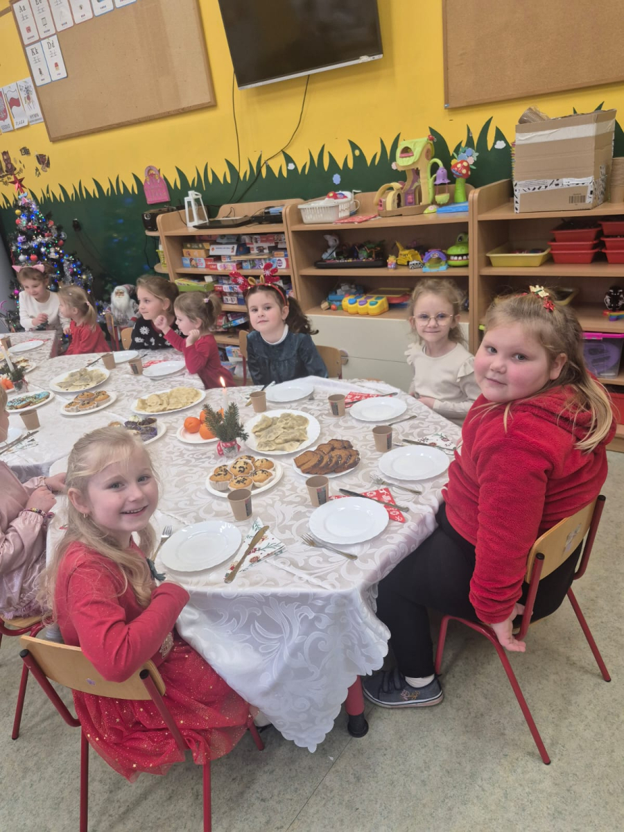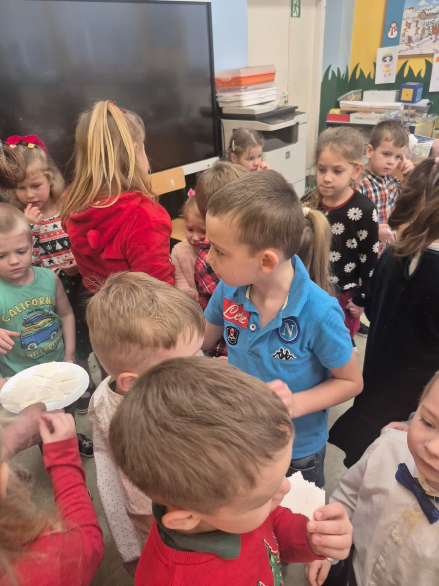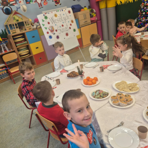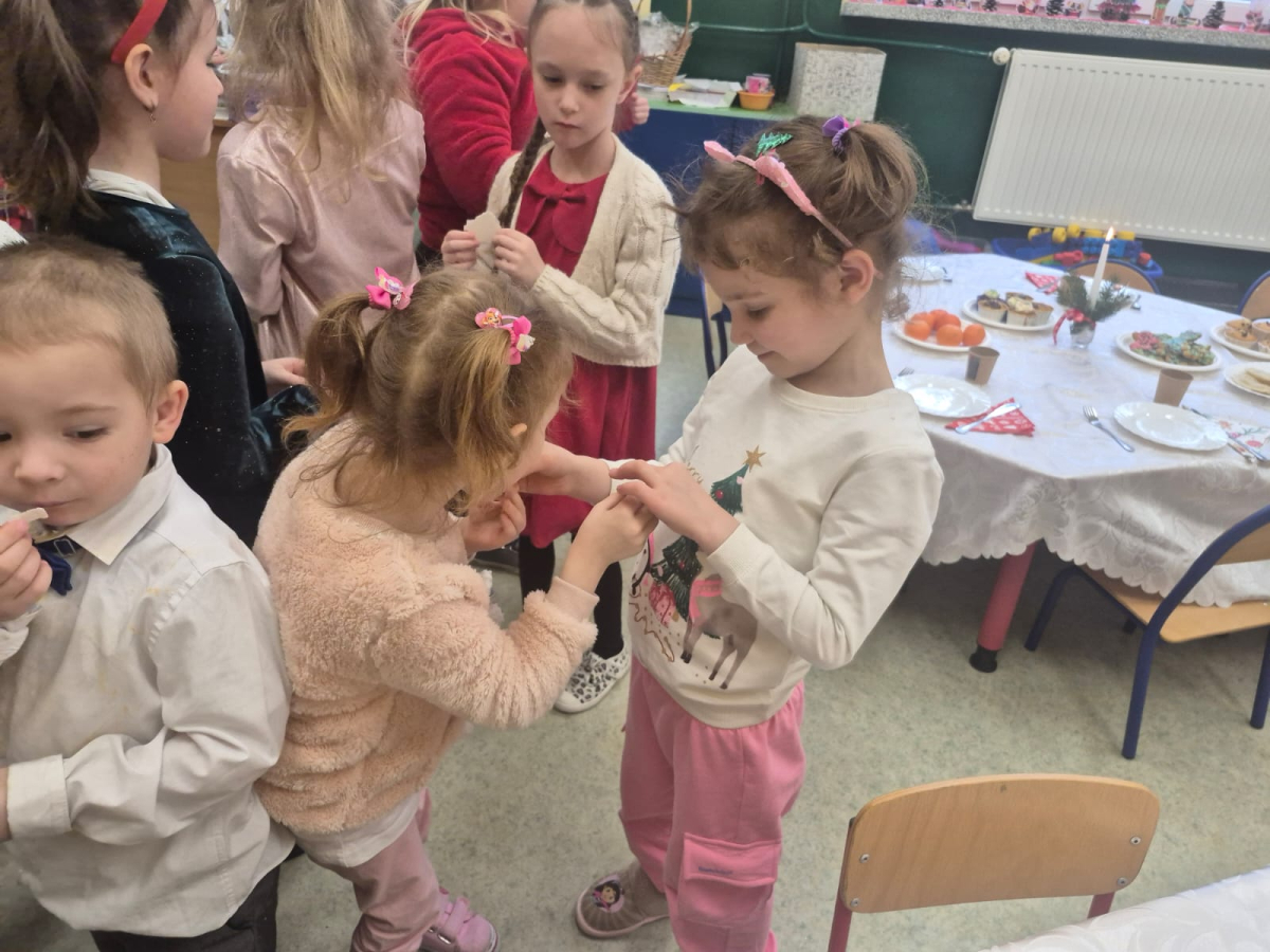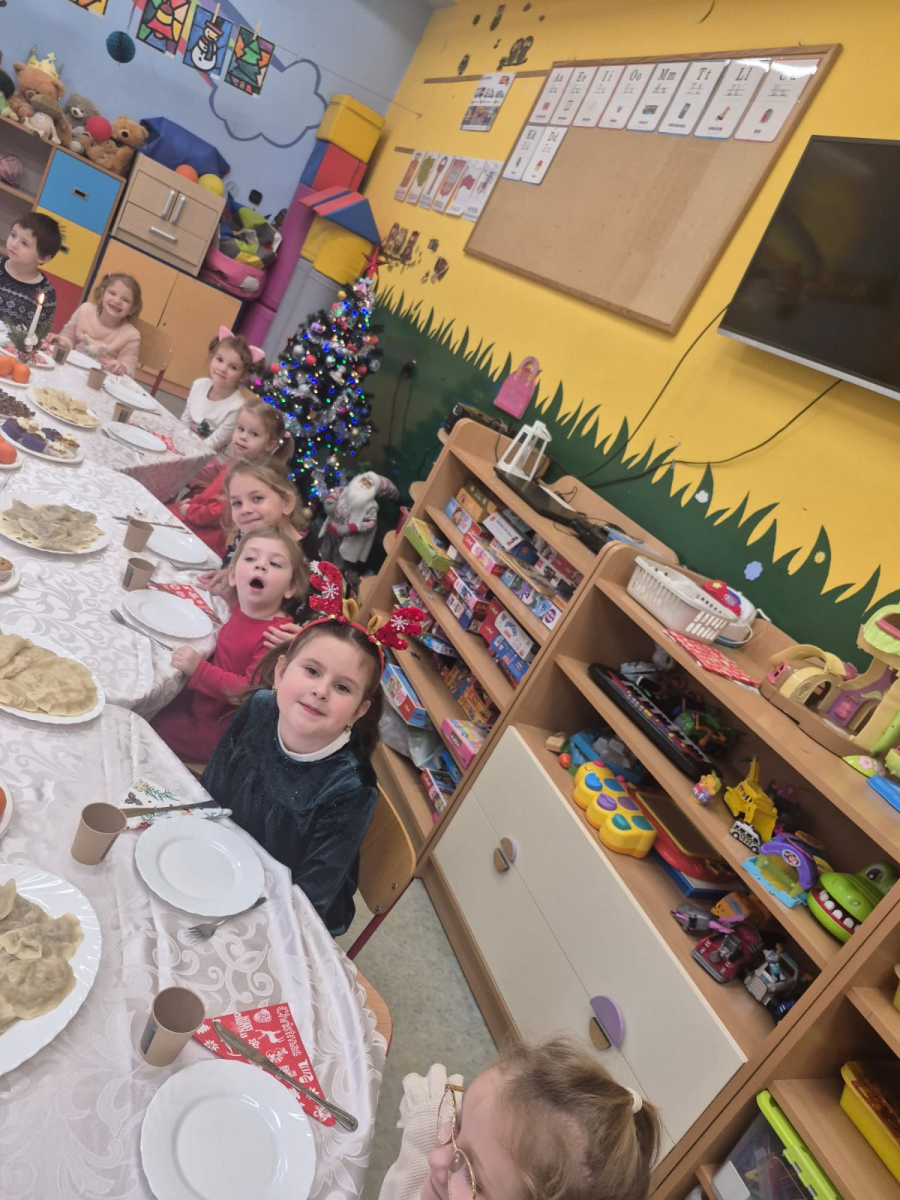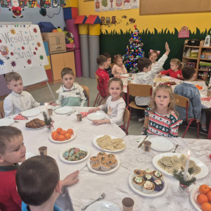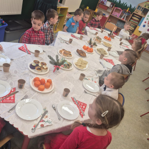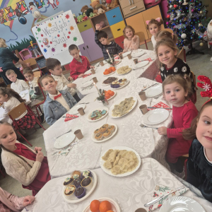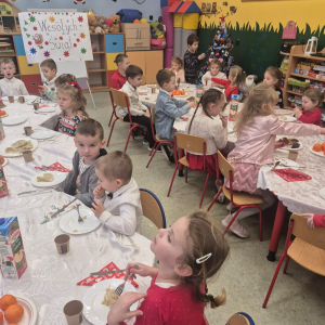 18 grudnia 2025 r. w naszym przedszkolu odbyła się wigilia. Był to wyjątkowy, świąteczny czas pełen radości i ciepłej atmosfery. Dzieci wspólnie wykonywały piękne bombki, słuchały świątecznej bajki, a także dzieliły się opłatkiem, składając sobie serdeczne życzenia. Całemu spotkaniu towarzyszyły kolędy, uśmiechy oraz radość ze wspólnie spędzonego czasu.