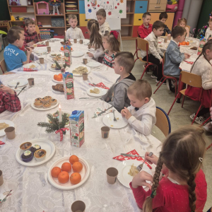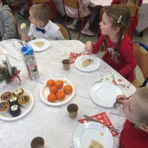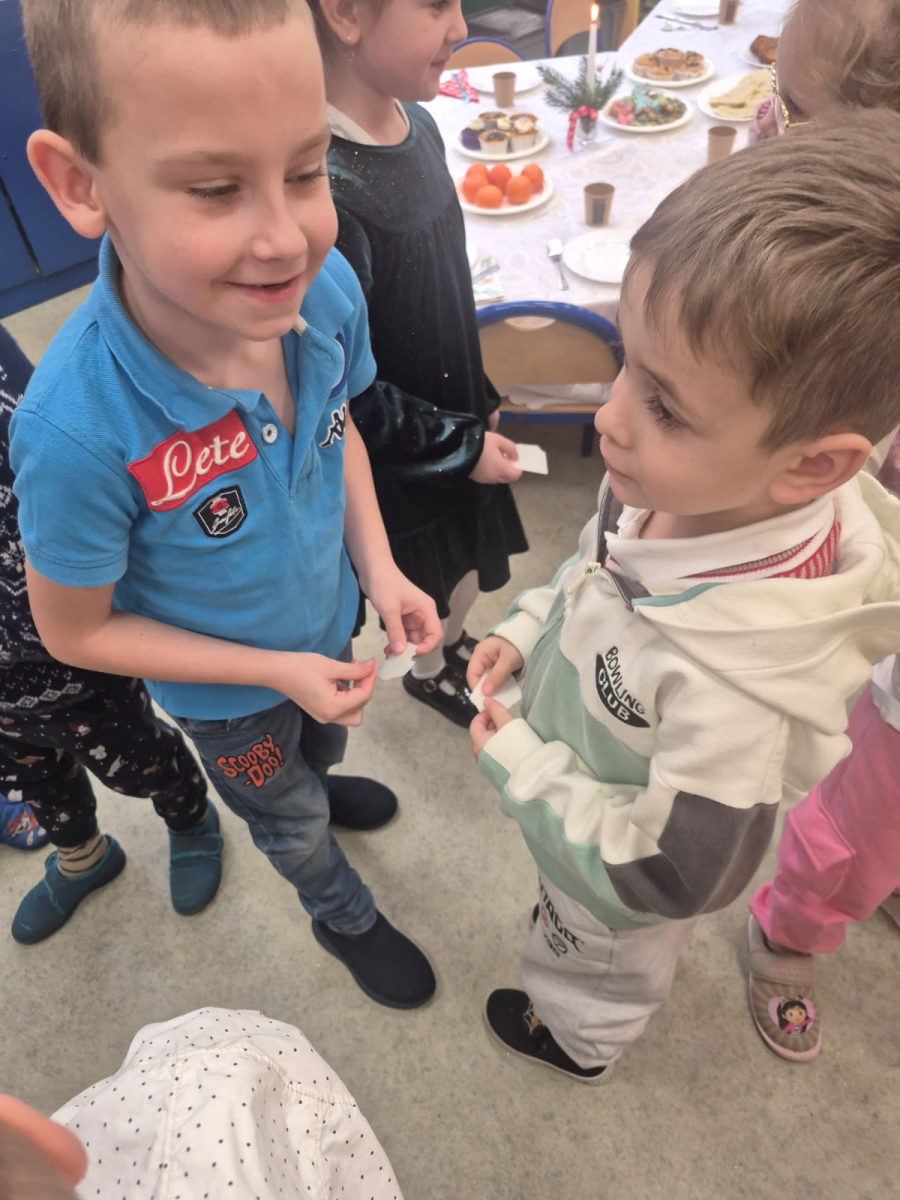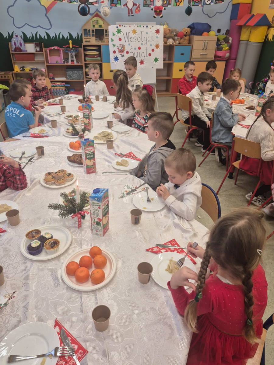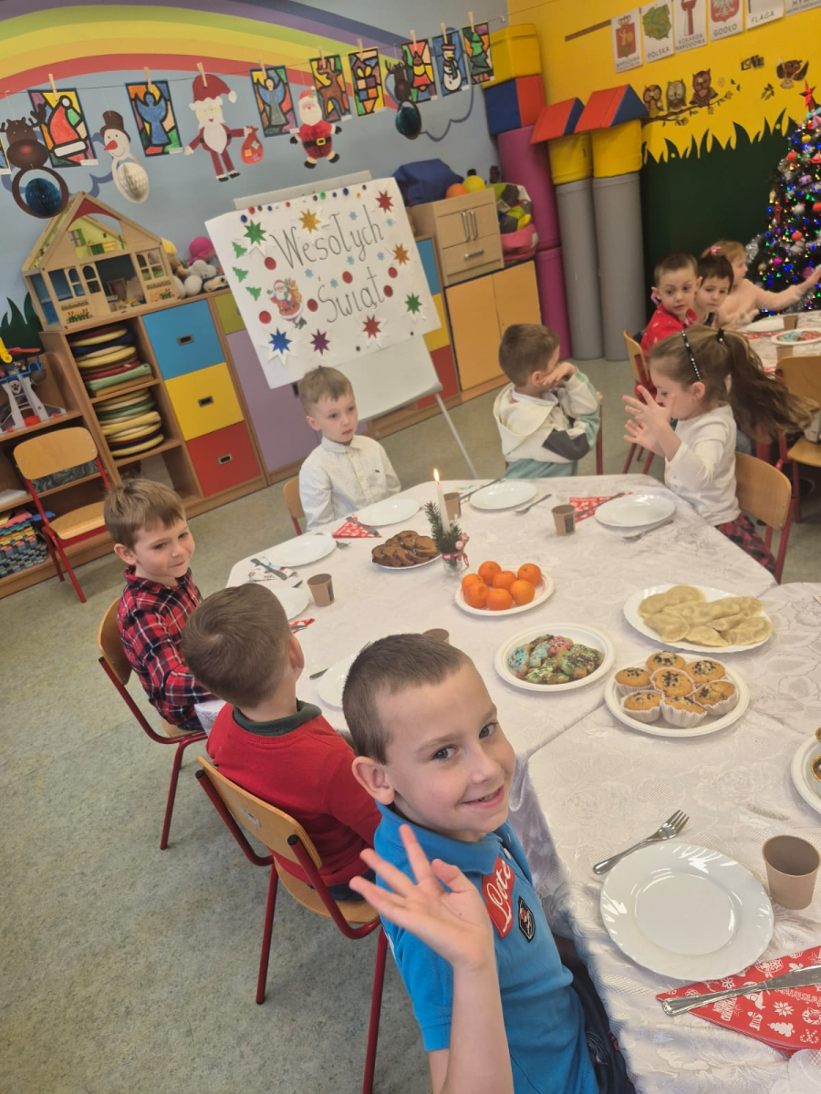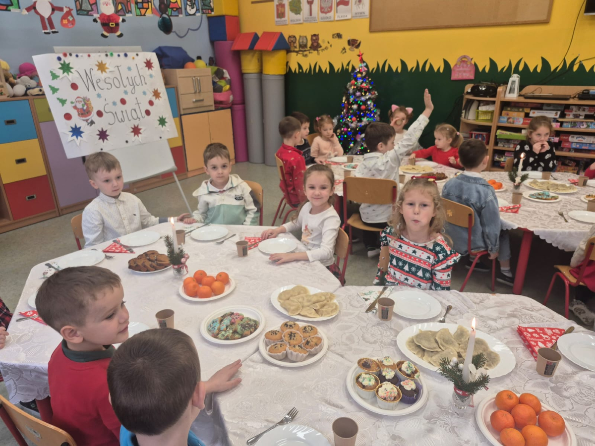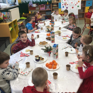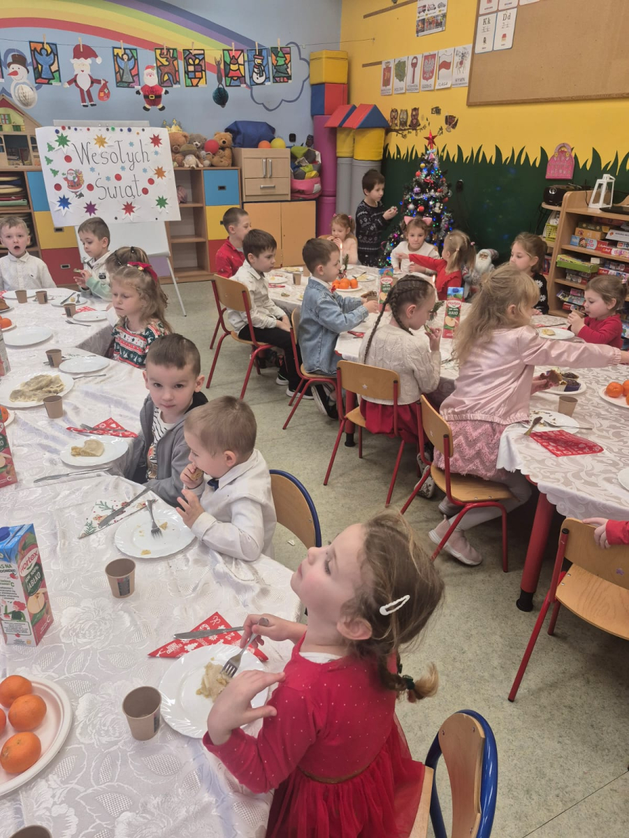 18 grudnia 2025 r. w naszym przedszkolu odbyła się wigilia. Był to wyjątkowy, świąteczny czas pełen radości i ciepłej atmosfery. Dzieci wspólnie wykonywały piękne bombki, słuchały świątecznej bajki, a także dzieliły się opłatkiem, składając sobie serdeczne życzenia. Całemu spotkaniu towarzyszyły kolędy, uśmiechy oraz radość ze wspólnie spędzonego czasu.