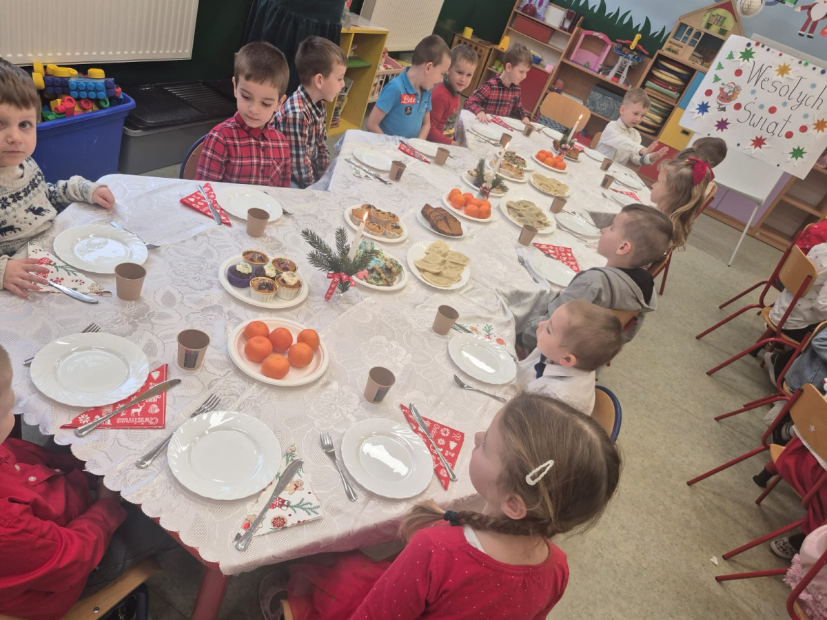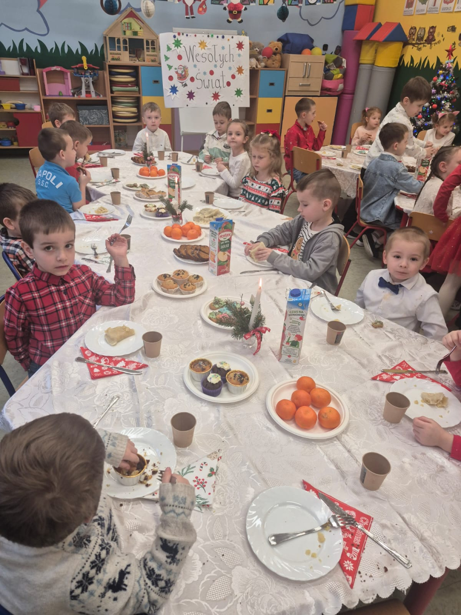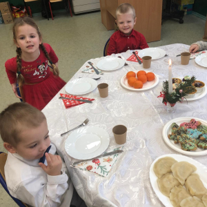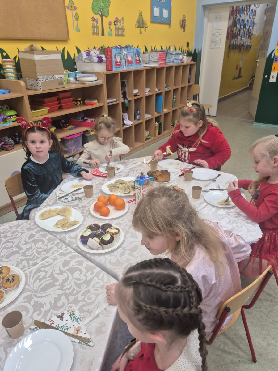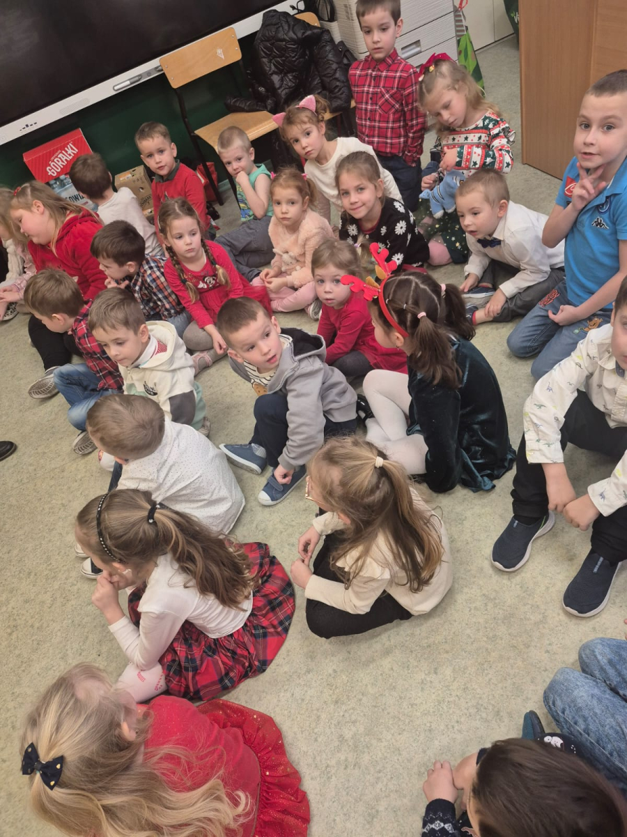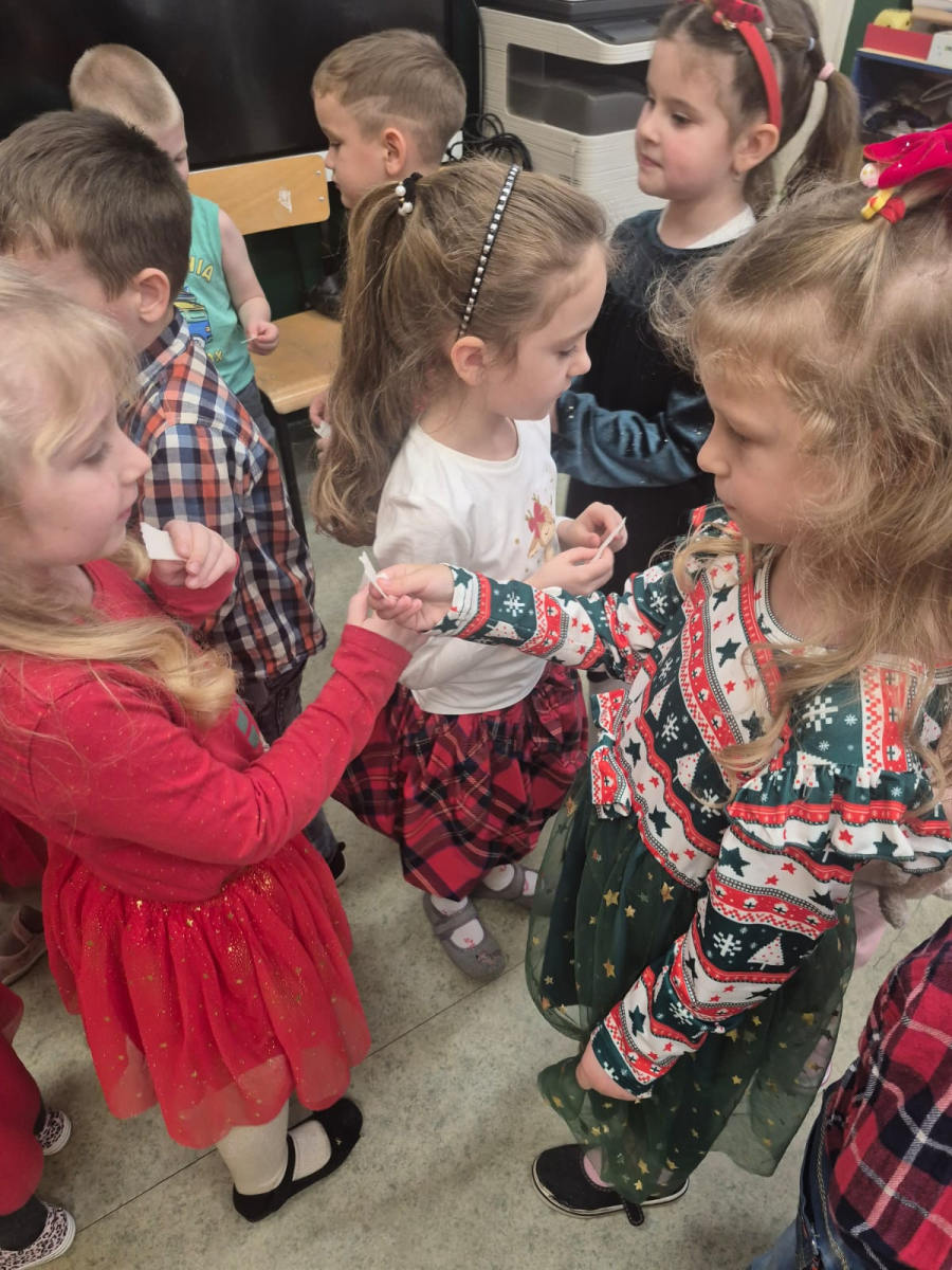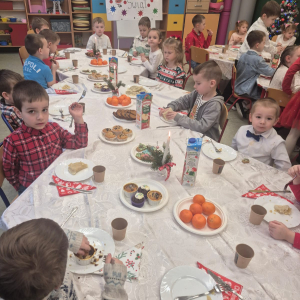 18 grudnia 2025 r. w naszym przedszkolu odbyła się wigilia. Był to wyjątkowy, świąteczny czas pełen radości i ciepłej atmosfery. Dzieci wspólnie wykonywały piękne bombki, słuchały świątecznej bajki, a także dzieliły się opłatkiem, składając sobie serdeczne życzenia. Całemu spotkaniu towarzyszyły kolędy, uśmiechy oraz radość ze wspólnie spędzonego czasu.