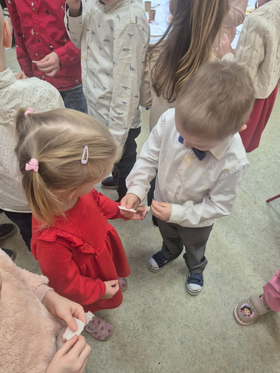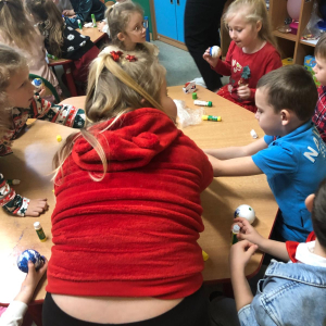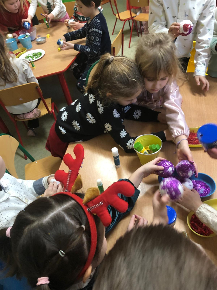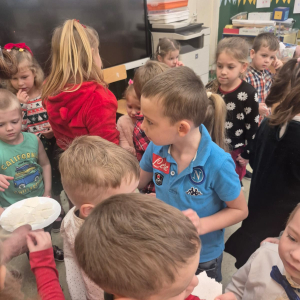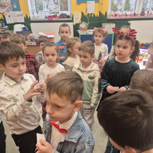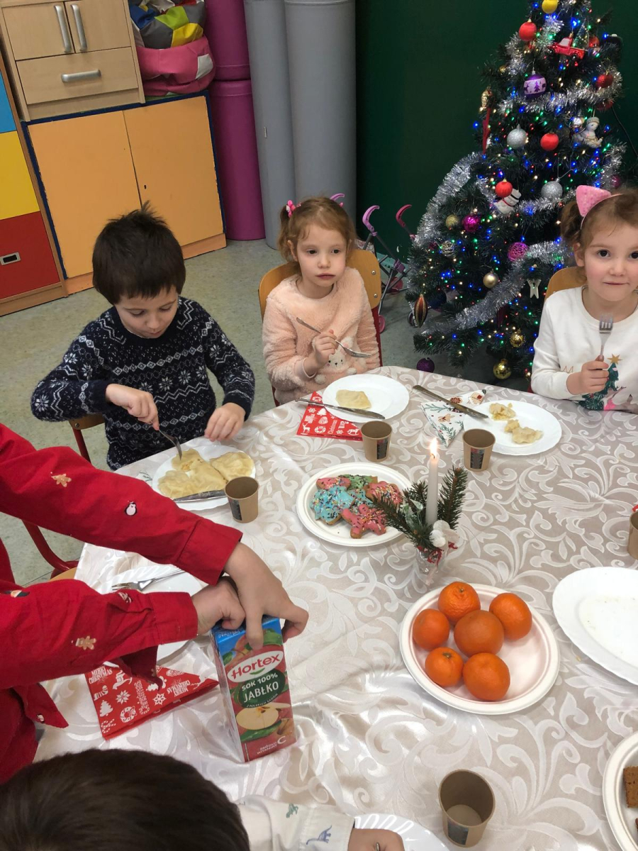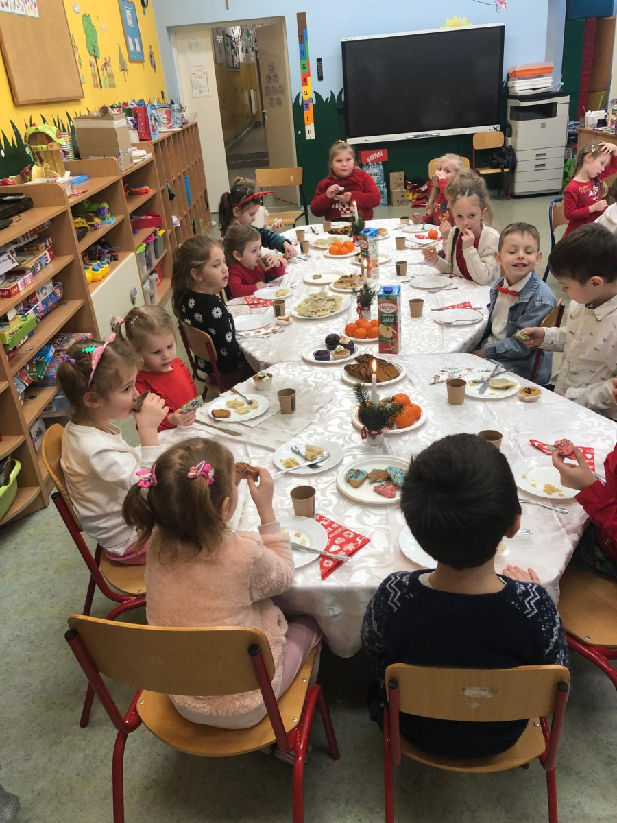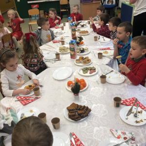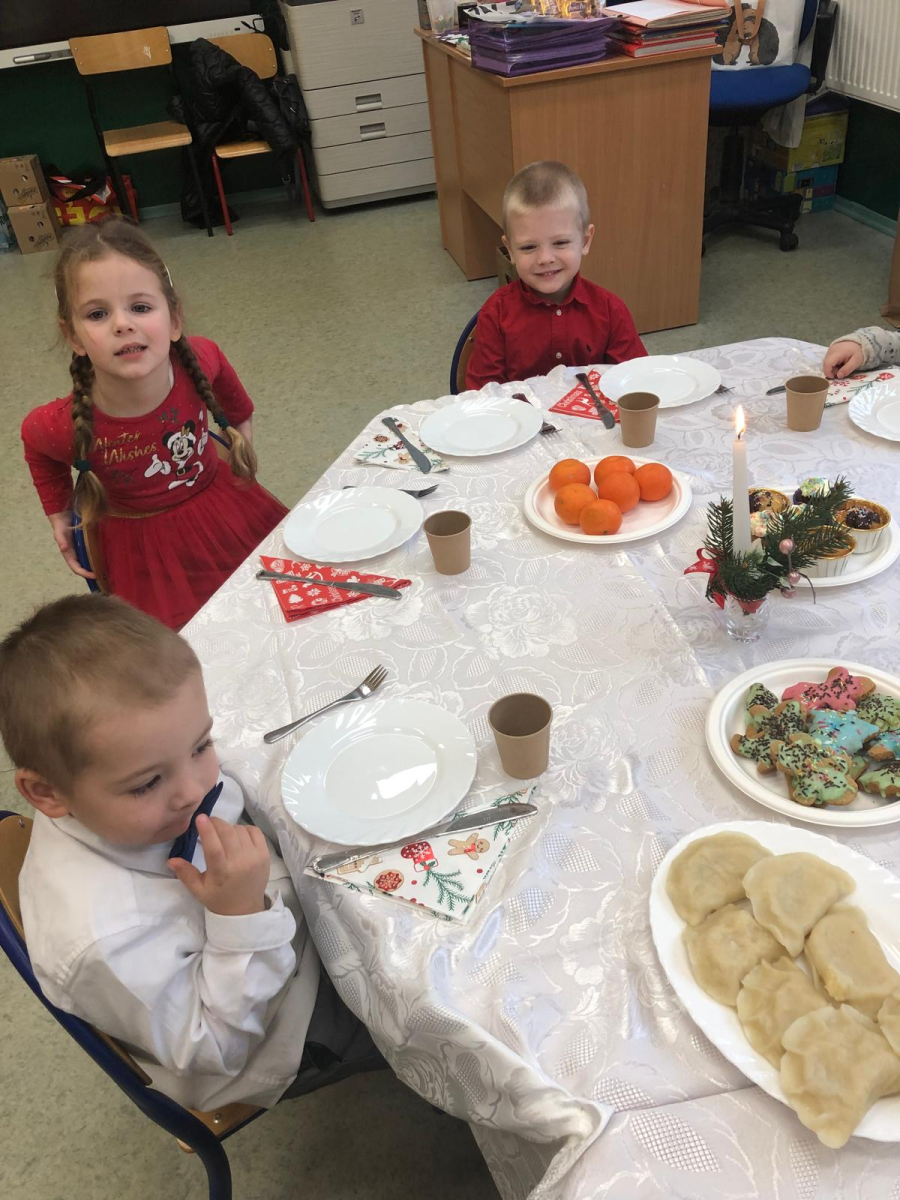 18 grudnia 2025 r. w naszym przedszkolu odbyła się wigilia. Był to wyjątkowy, świąteczny czas pełen radości i ciepłej atmosfery. Dzieci wspólnie wykonywały piękne bombki, słuchały świątecznej bajki, a także dzieliły się opłatkiem, składając sobie serdeczne życzenia. Całemu spotkaniu towarzyszyły kolędy, uśmiechy oraz radość ze wspólnie spędzonego czasu.