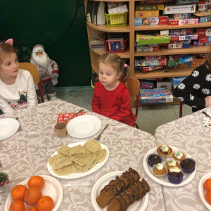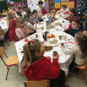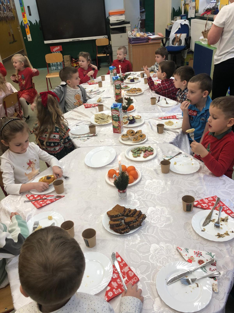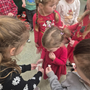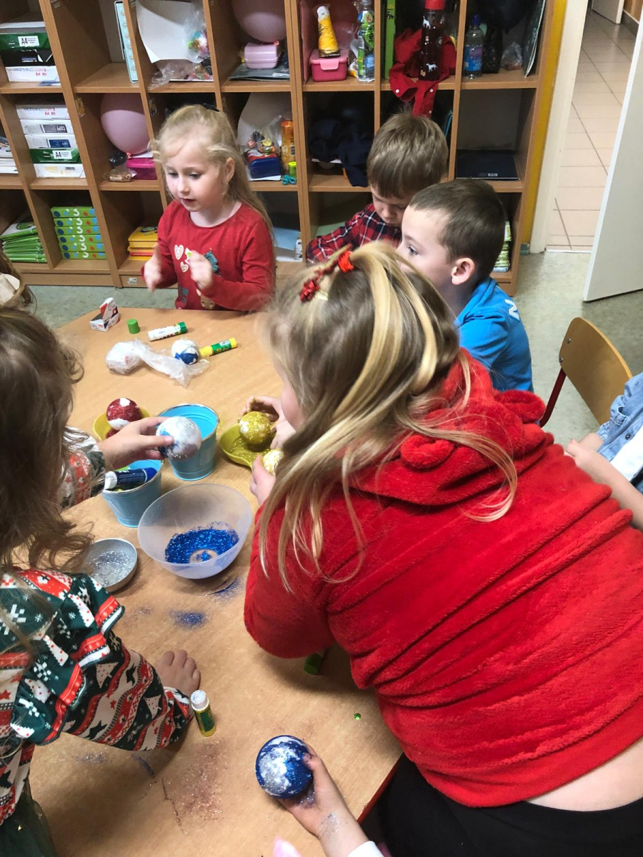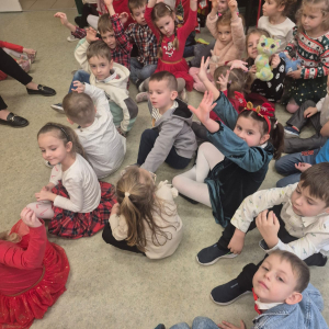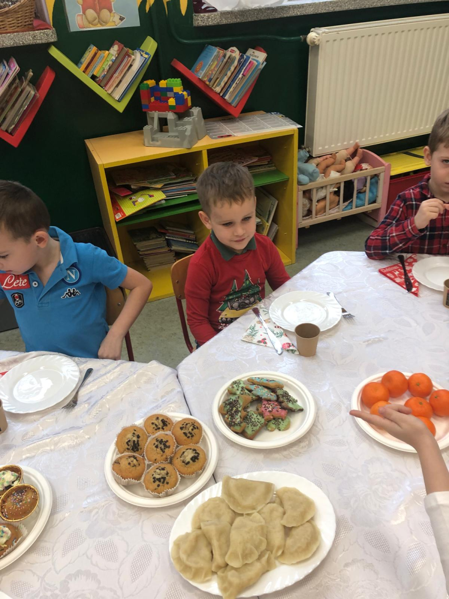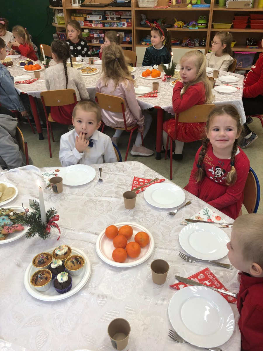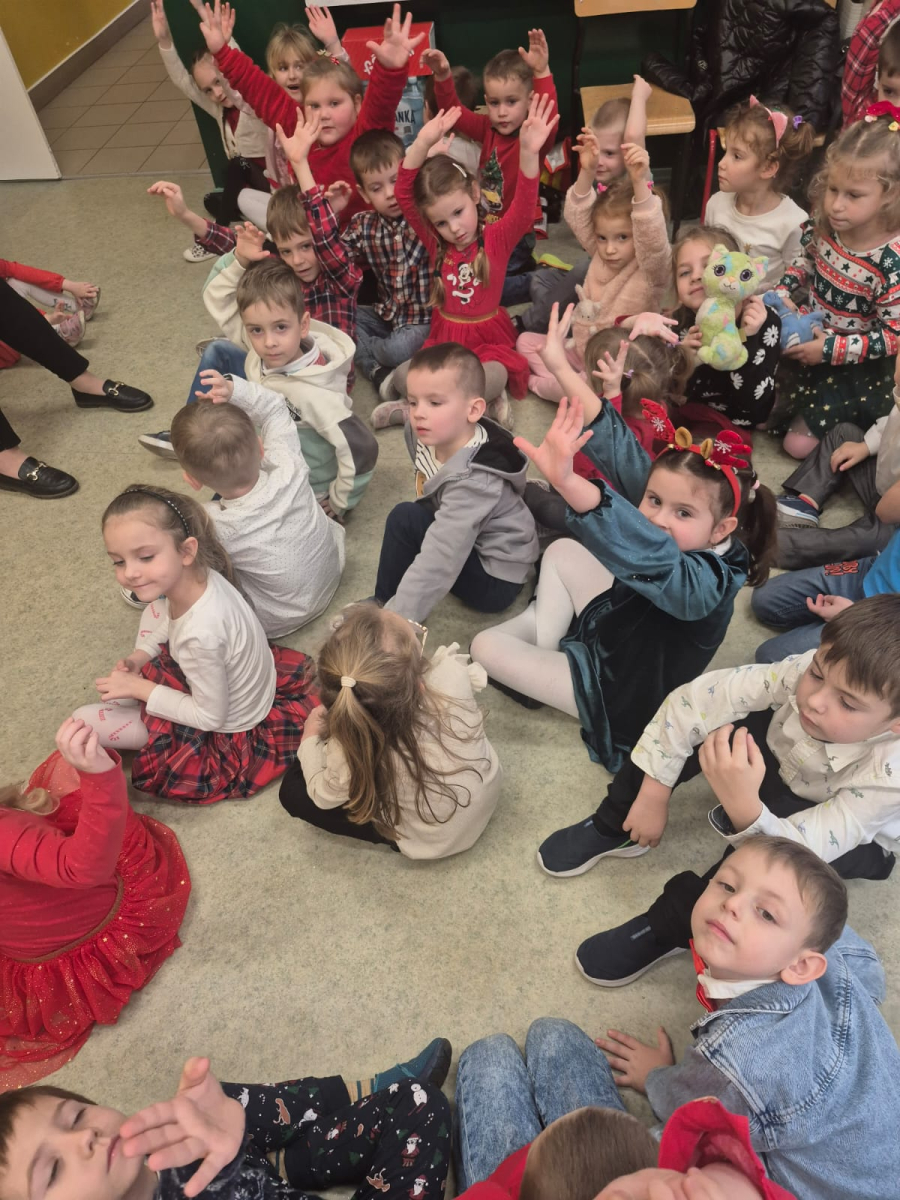 18 grudnia 2025 r. w naszym przedszkolu odbyła się wigilia. Był to wyjątkowy, świąteczny czas pełen radości i ciepłej atmosfery. Dzieci wspólnie wykonywały piękne bombki, słuchały świątecznej bajki, a także dzieliły się opłatkiem, składając sobie serdeczne życzenia. Całemu spotkaniu towarzyszyły kolędy, uśmiechy oraz radość ze wspólnie spędzonego czasu.