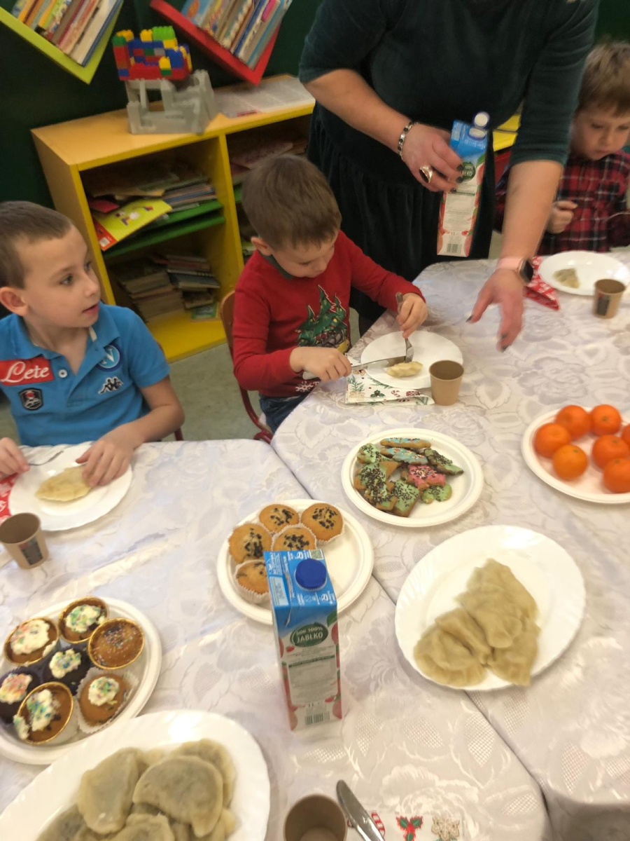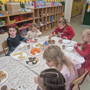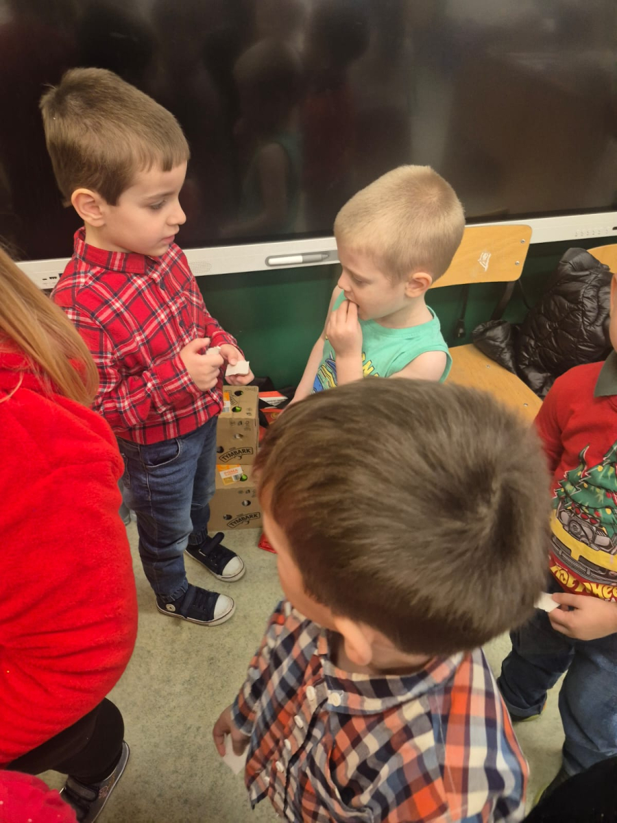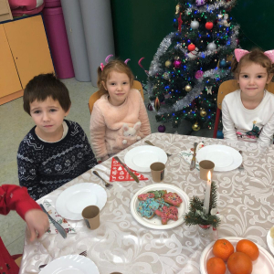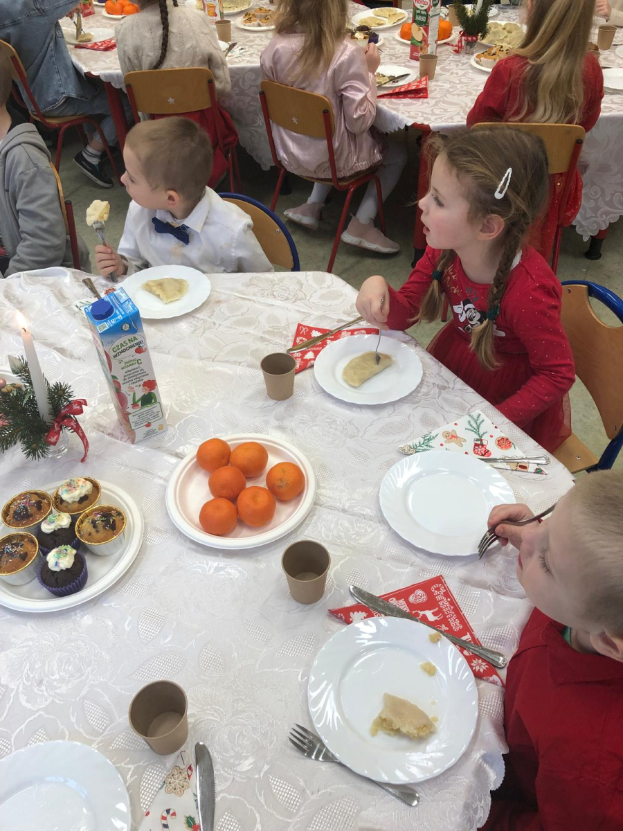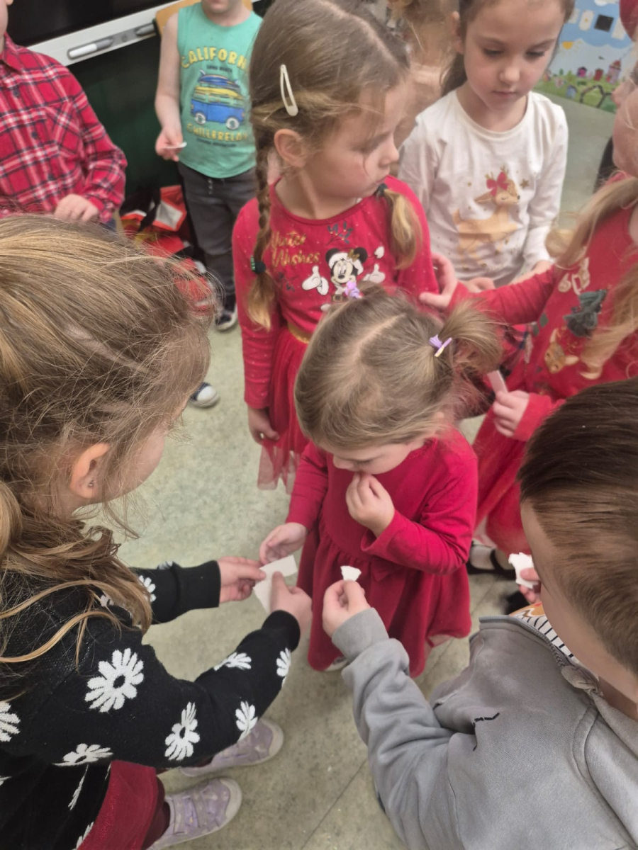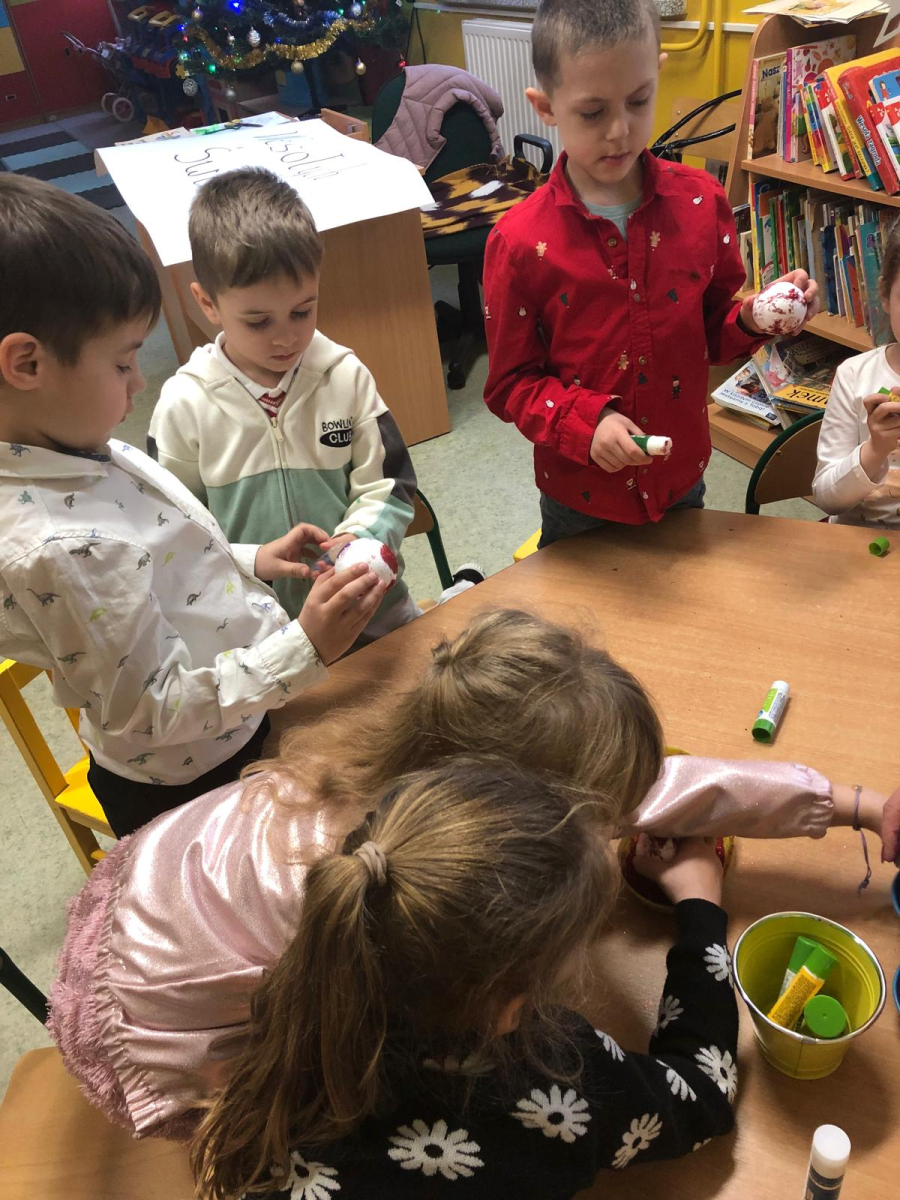 18 grudnia 2025 r. w naszym przedszkolu odbyła się wigilia. Był to wyjątkowy, świąteczny czas pełen radości i ciepłej atmosfery. Dzieci wspólnie wykonywały piękne bombki, słuchały świątecznej bajki, a także dzieliły się opłatkiem, składając sobie serdeczne życzenia. Całemu spotkaniu towarzyszyły kolędy, uśmiechy oraz radość ze wspólnie spędzonego czasu.