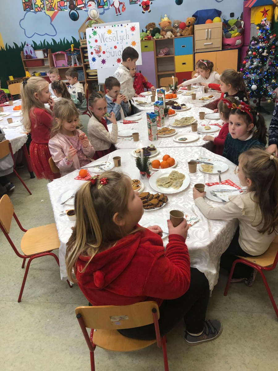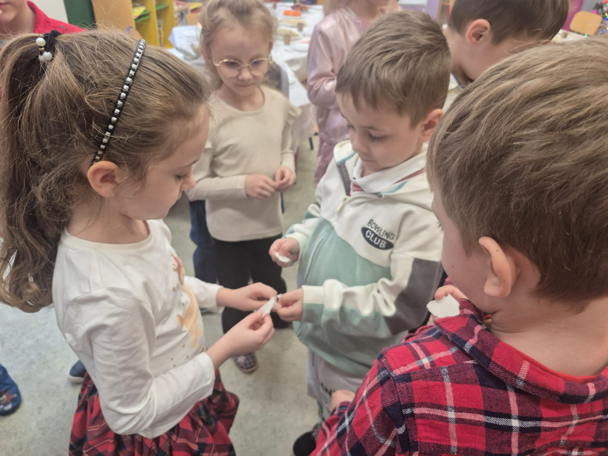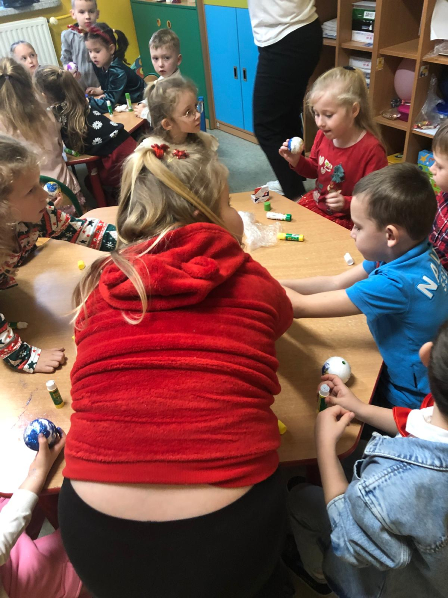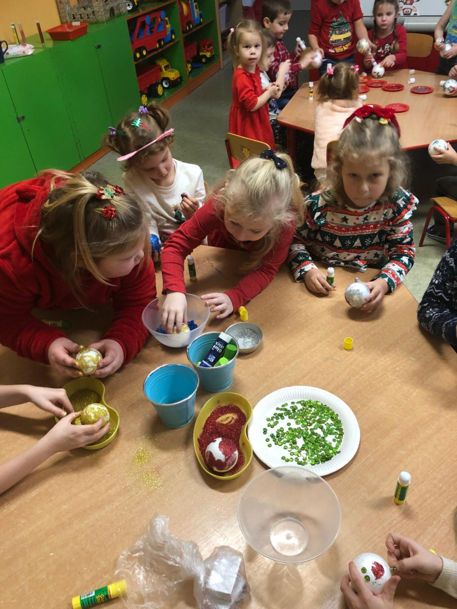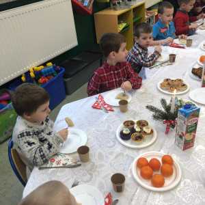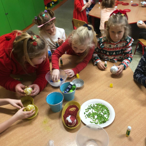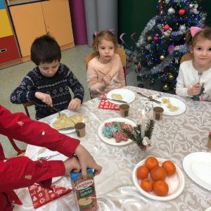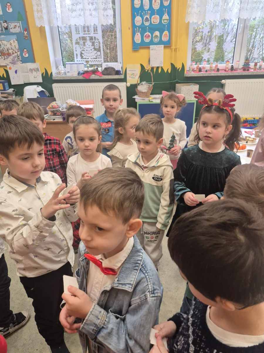 18 grudnia 2025 r. w naszym przedszkolu odbyła się wigilia. Był to wyjątkowy, świąteczny czas pełen radości i ciepłej atmosfery. Dzieci wspólnie wykonywały piękne bombki, słuchały świątecznej bajki, a także dzieliły się opłatkiem, składając sobie serdeczne życzenia. Całemu spotkaniu towarzyszyły kolędy, uśmiechy oraz radość ze wspólnie spędzonego czasu.