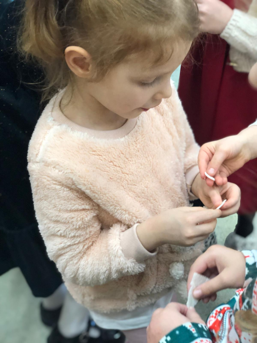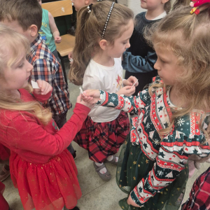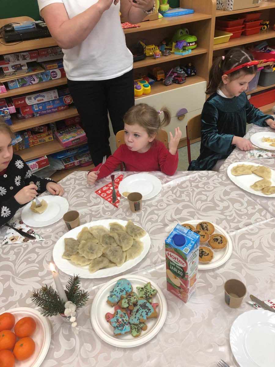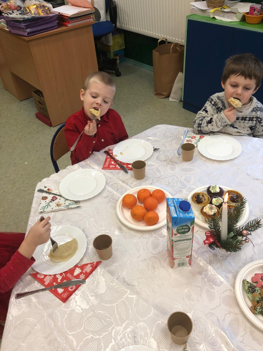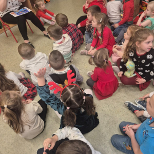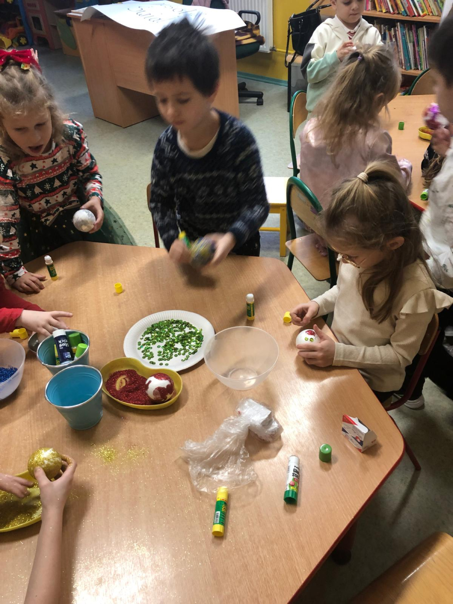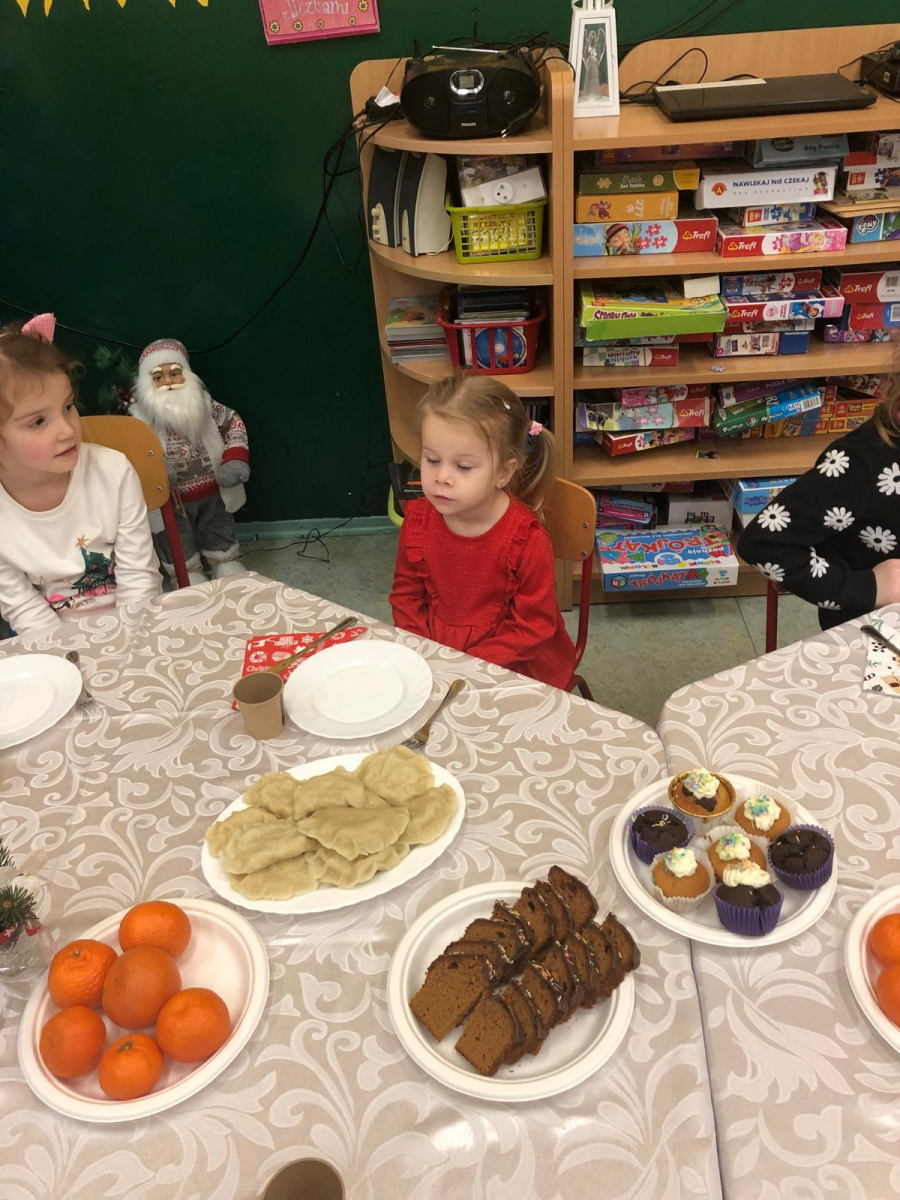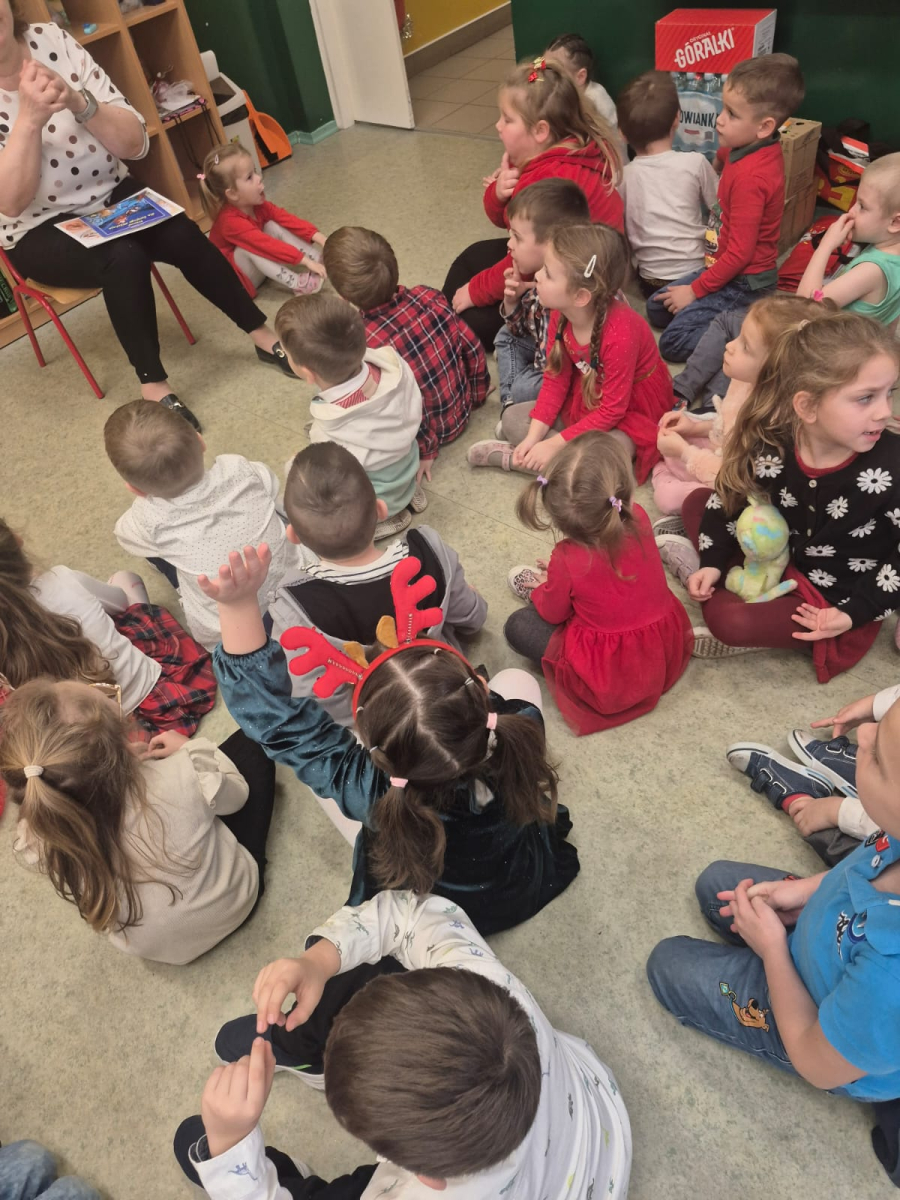 18 grudnia 2025 r. w naszym przedszkolu odbyła się wigilia. Był to wyjątkowy, świąteczny czas pełen radości i ciepłej atmosfery. Dzieci wspólnie wykonywały piękne bombki, słuchały świątecznej bajki, a także dzieliły się opłatkiem, składając sobie serdeczne życzenia. Całemu spotkaniu towarzyszyły kolędy, uśmiechy oraz radość ze wspólnie spędzonego czasu.