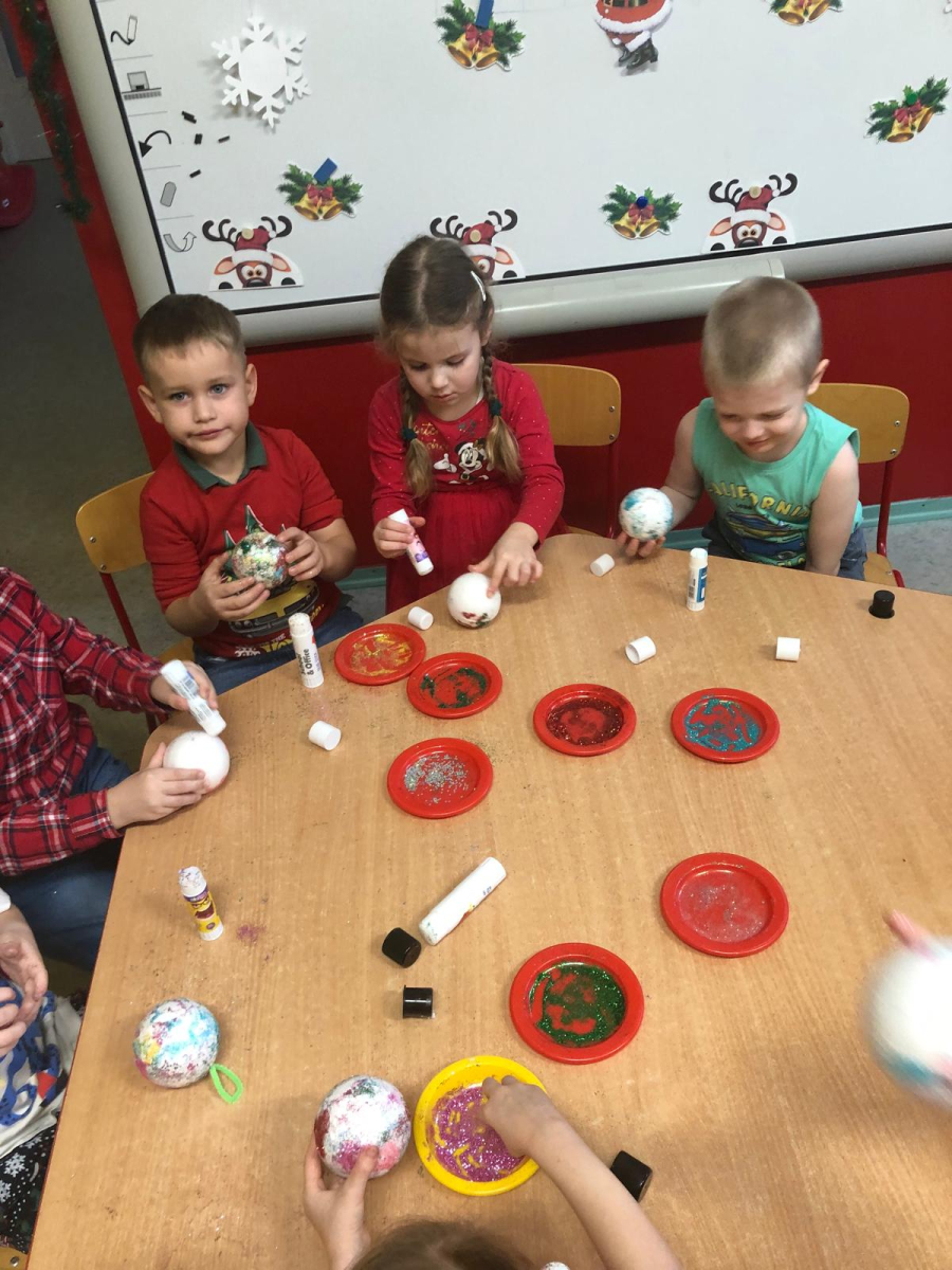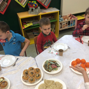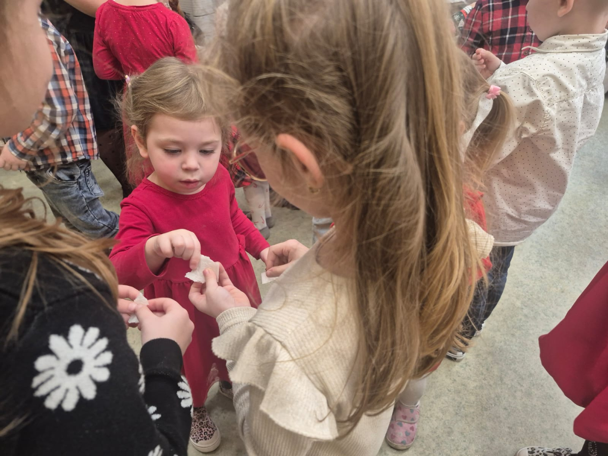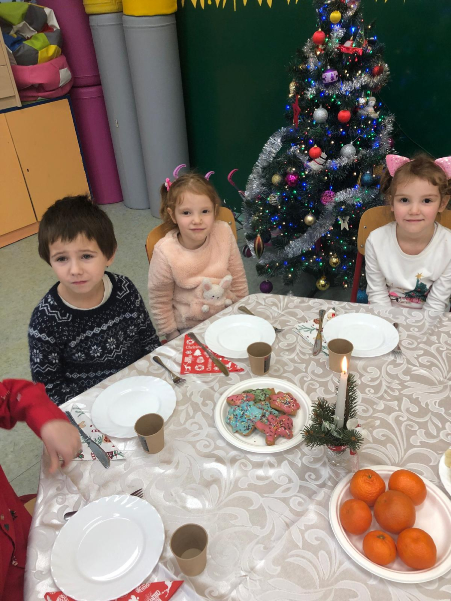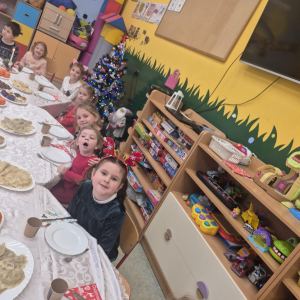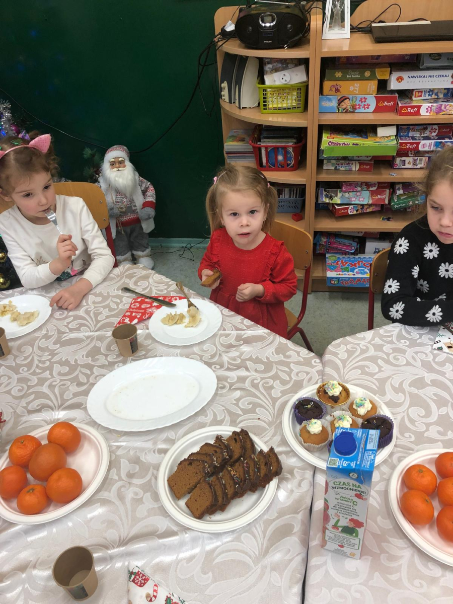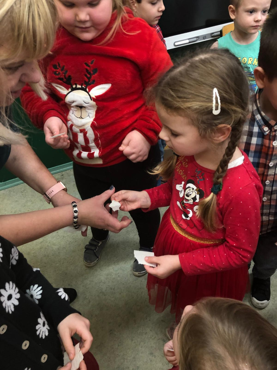 18 grudnia 2025 r. w naszym przedszkolu odbyła się wigilia. Był to wyjątkowy, świąteczny czas pełen radości i ciepłej atmosfery. Dzieci wspólnie wykonywały piękne bombki, słuchały świątecznej bajki, a także dzieliły się opłatkiem, składając sobie serdeczne życzenia. Całemu spotkaniu towarzyszyły kolędy, uśmiechy oraz radość ze wspólnie spędzonego czasu.