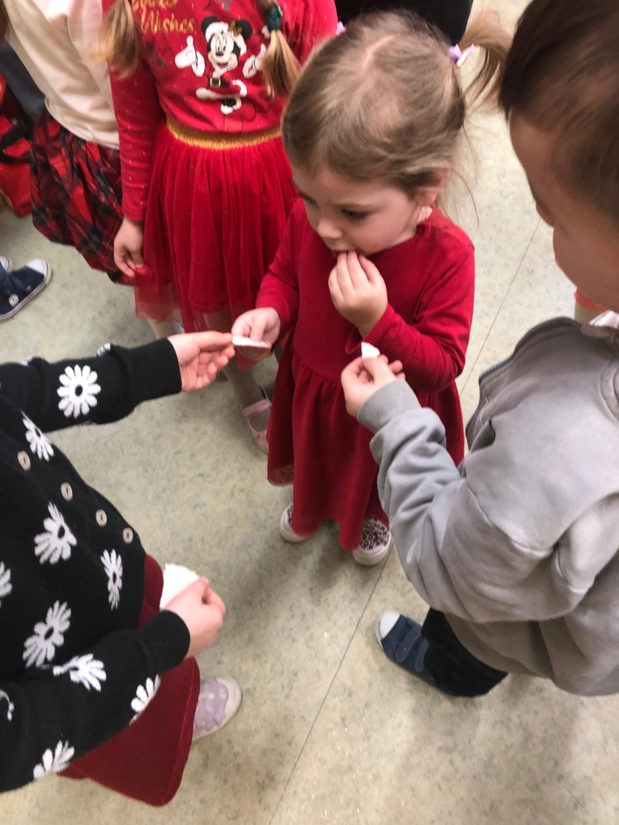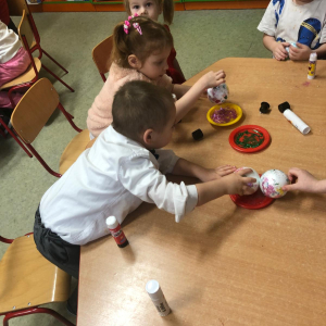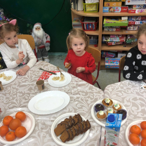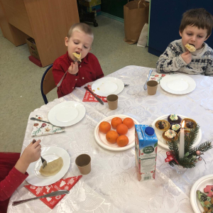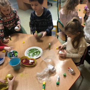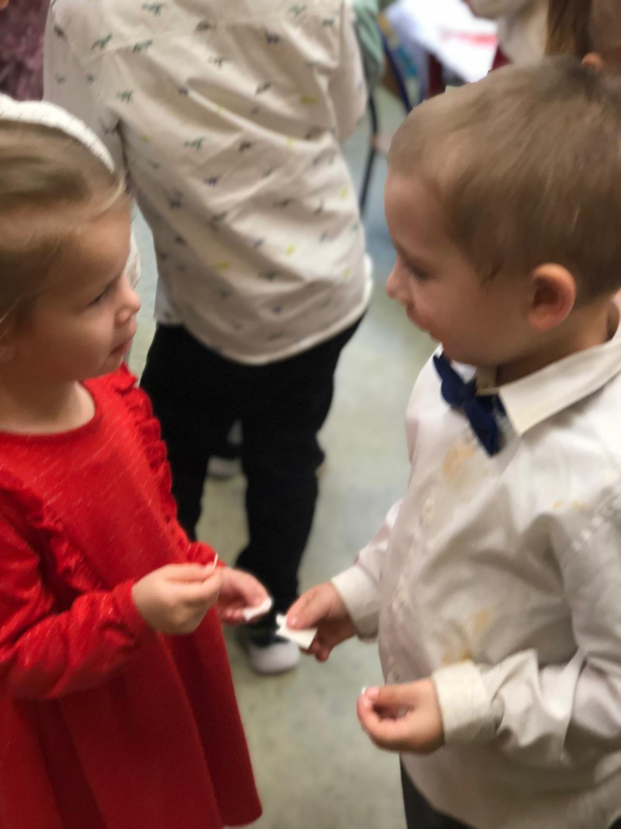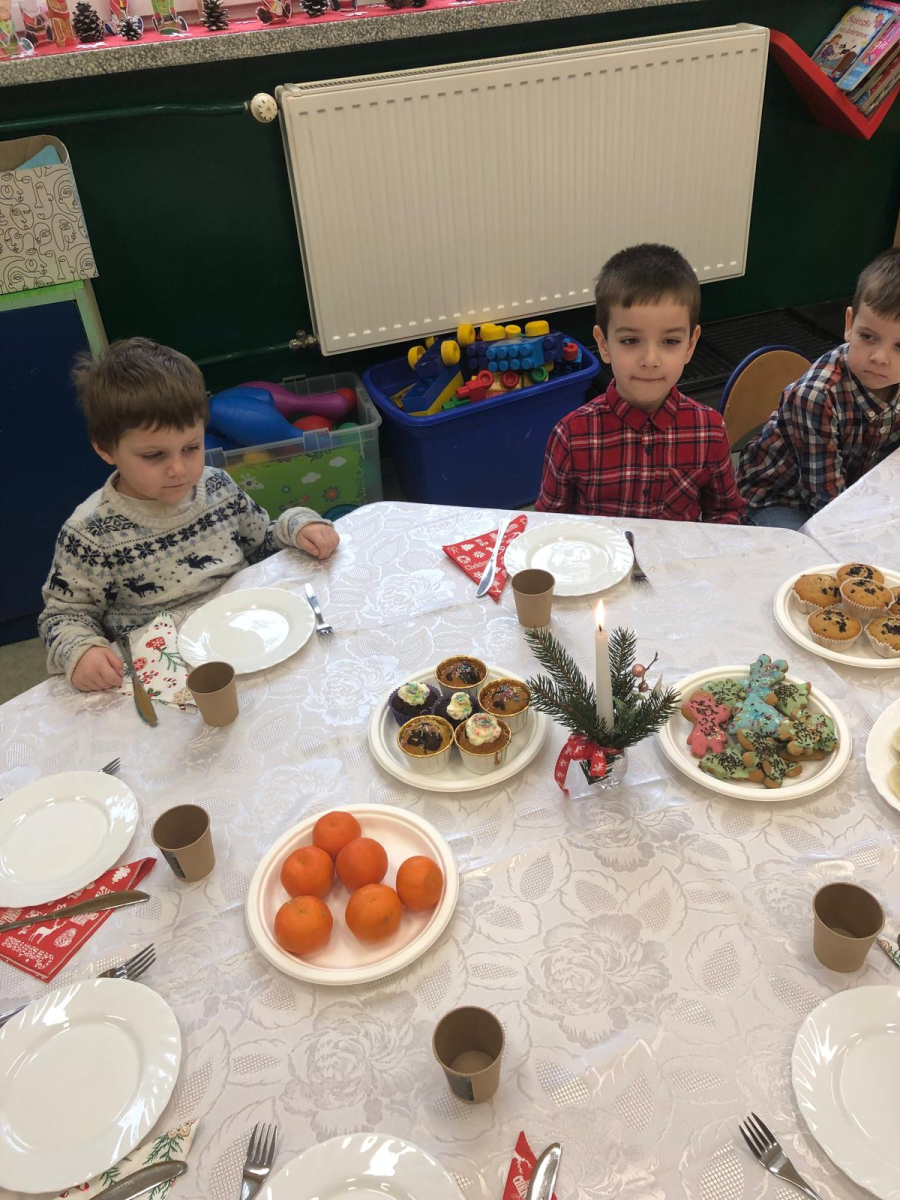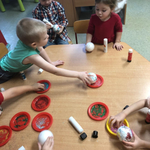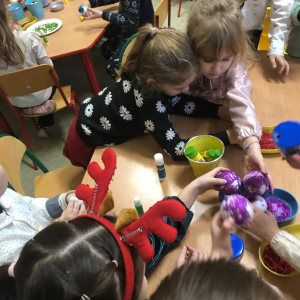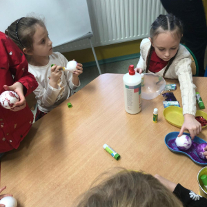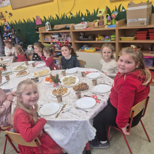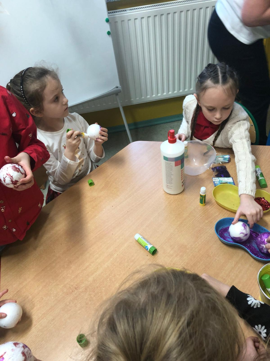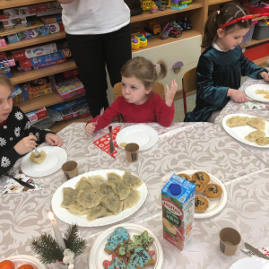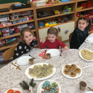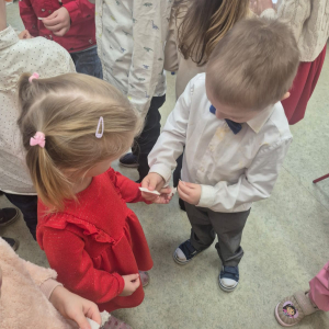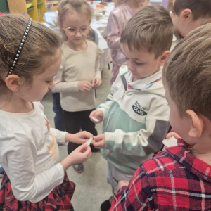 18 grudnia 2025 r. w naszym przedszkolu odbyła się wigilia. Był to wyjątkowy, świąteczny czas pełen radości i ciepłej atmosfery. Dzieci wspólnie wykonywały piękne bombki, słuchały świątecznej bajki, a także dzieliły się opłatkiem, składając sobie serdeczne życzenia. Całemu spotkaniu towarzyszyły kolędy, uśmiechy oraz radość ze wspólnie spędzonego czasu.
