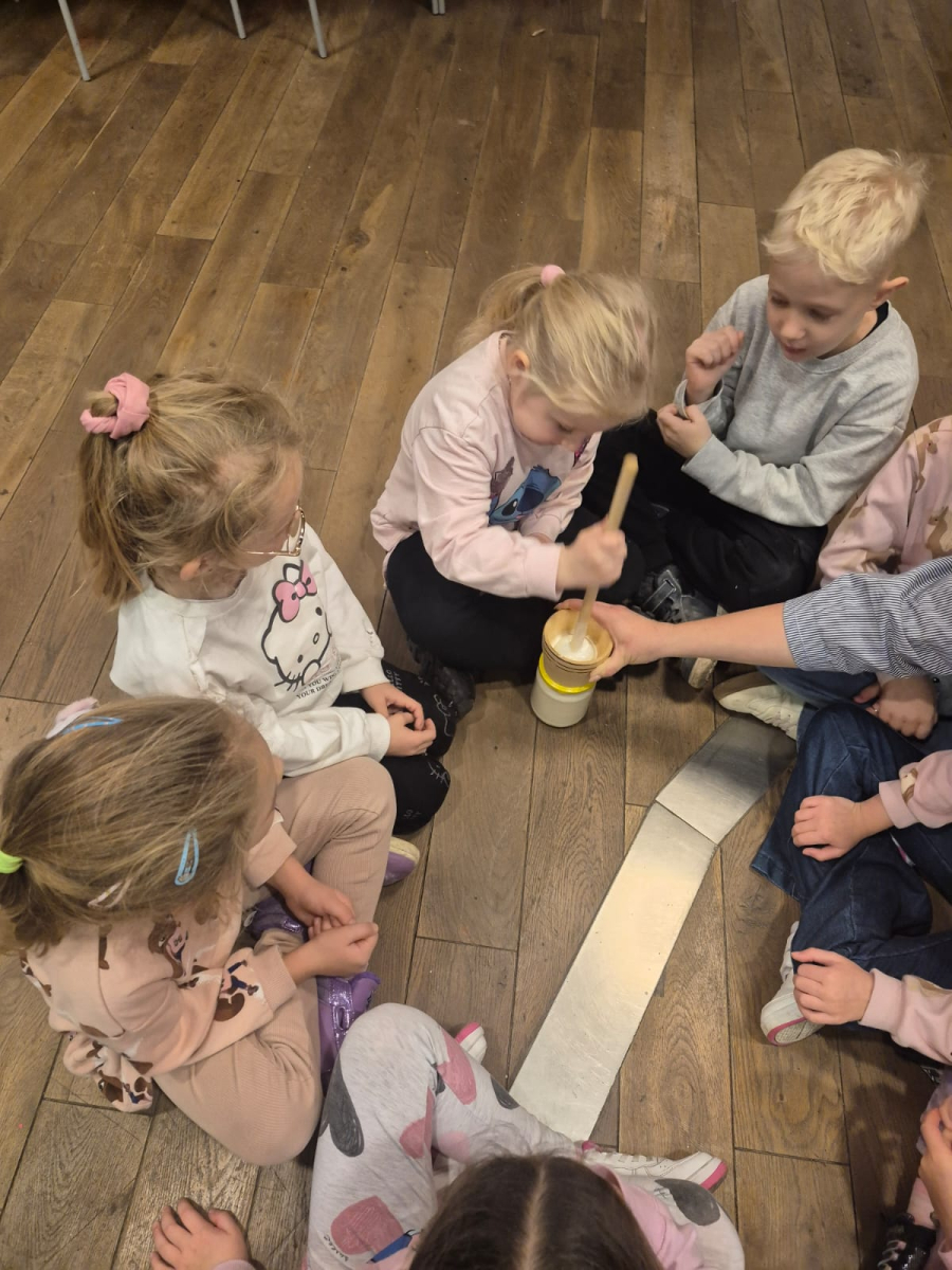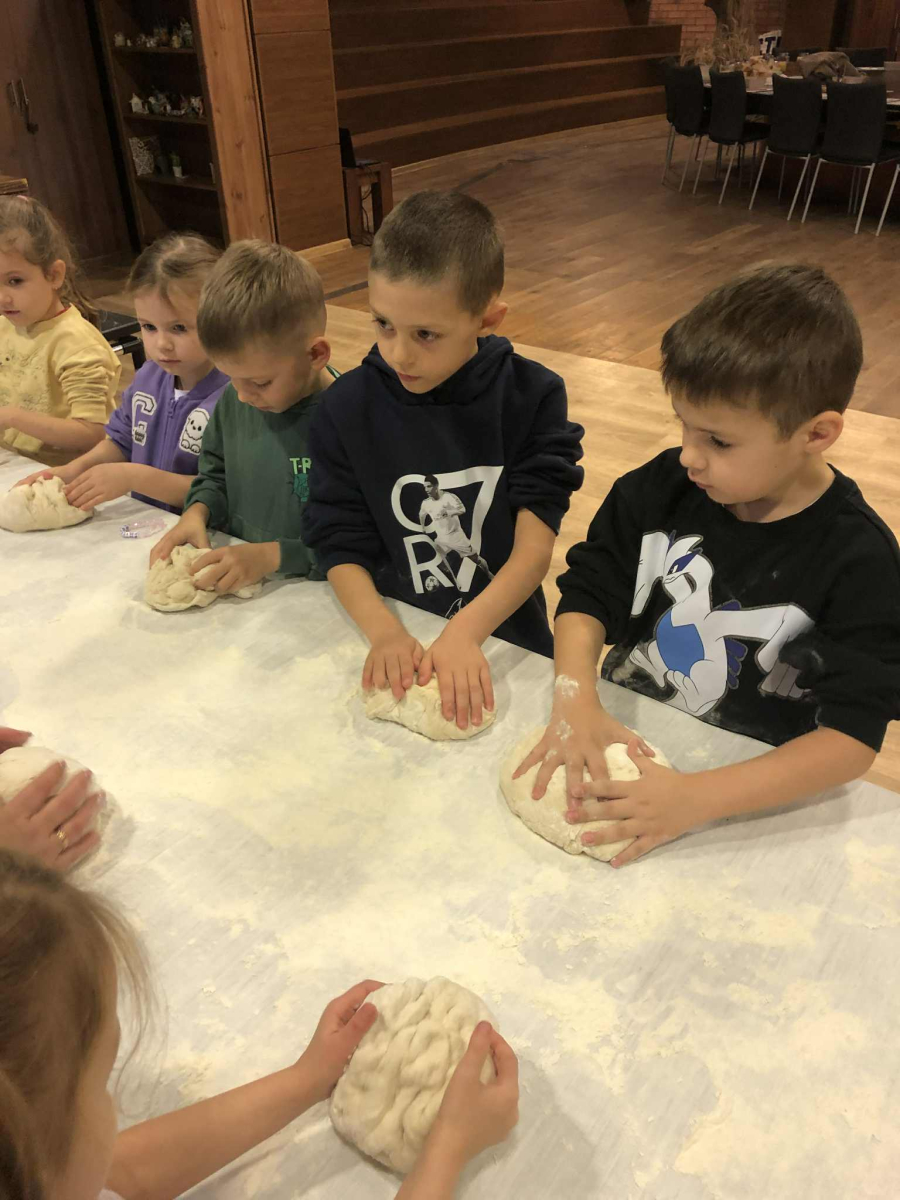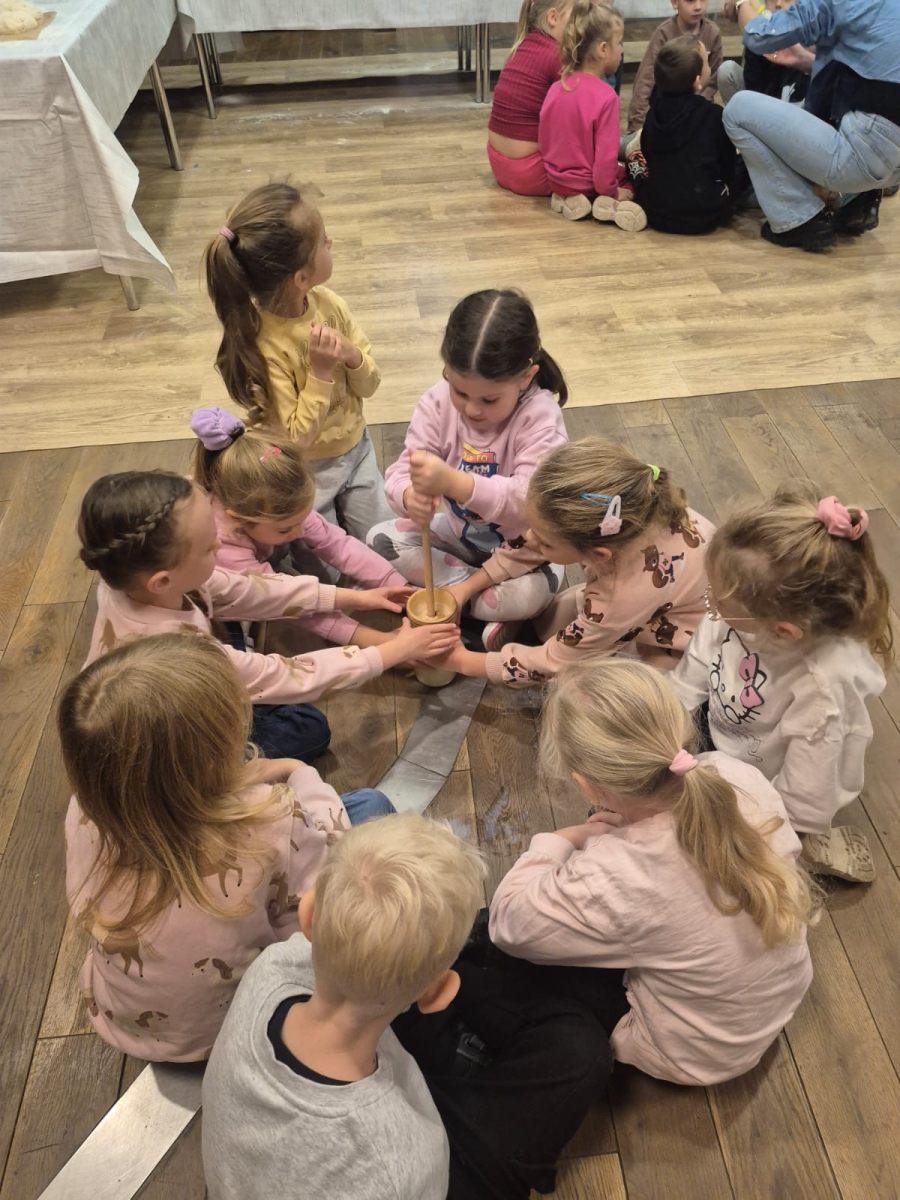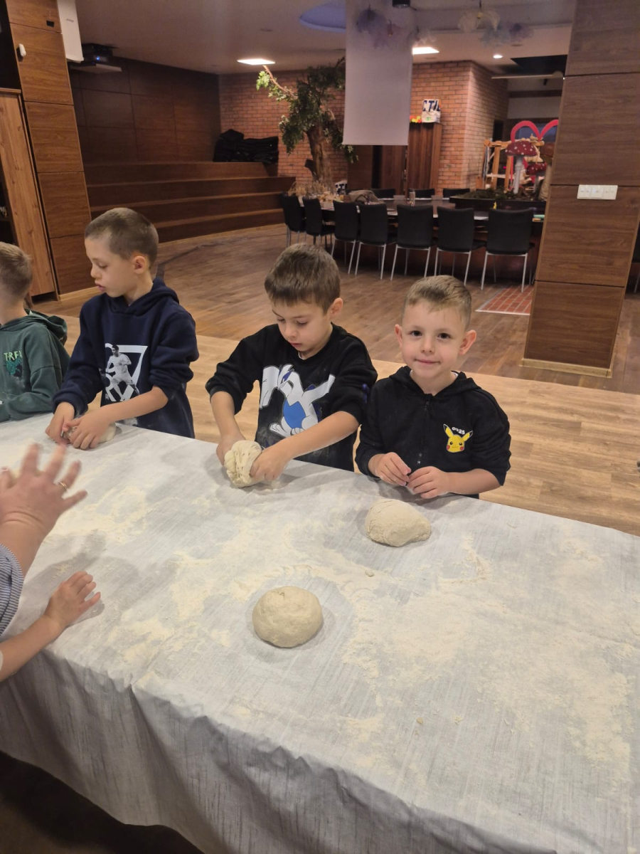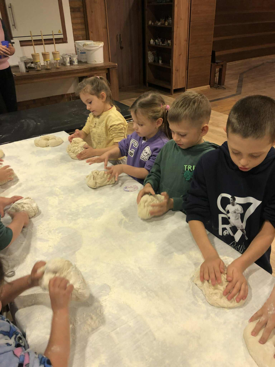 Najmłodsi z zaciekawieniem poznawali różne rodzaje zbóż – pszenicę, żyto, jęczmień i owies. Dowiedzieli się, jak wygląda droga ziarna od pola aż do stołu – od siewu, przez mielenie zboża, aż po wypiek pachnącego chleba. Dzieci mogły wszystkiego dotknąć, powąchać i spróbować swoich sił w wyrabianiu ciasta, a także ubijały śmietanę, by zrobić prawdziwe masło, co sprawiło im ogromną radość.
