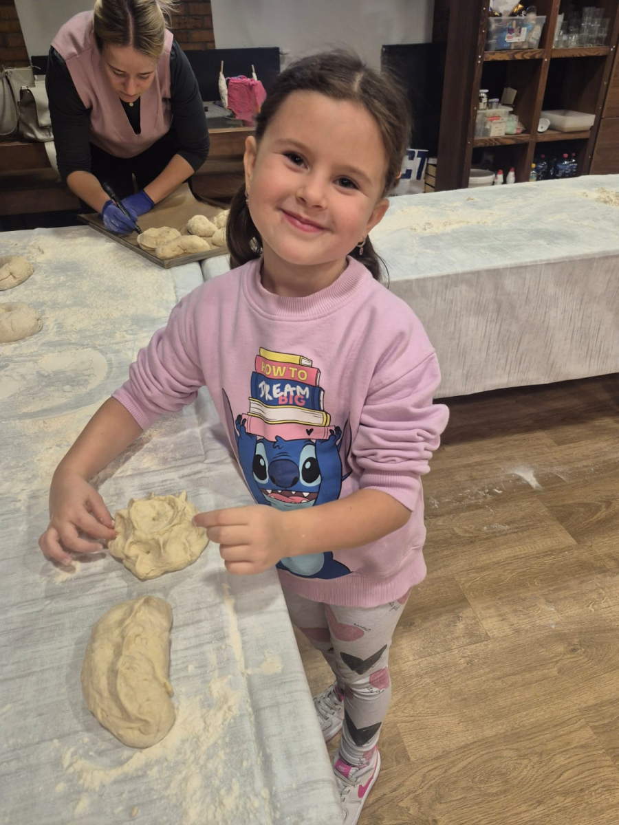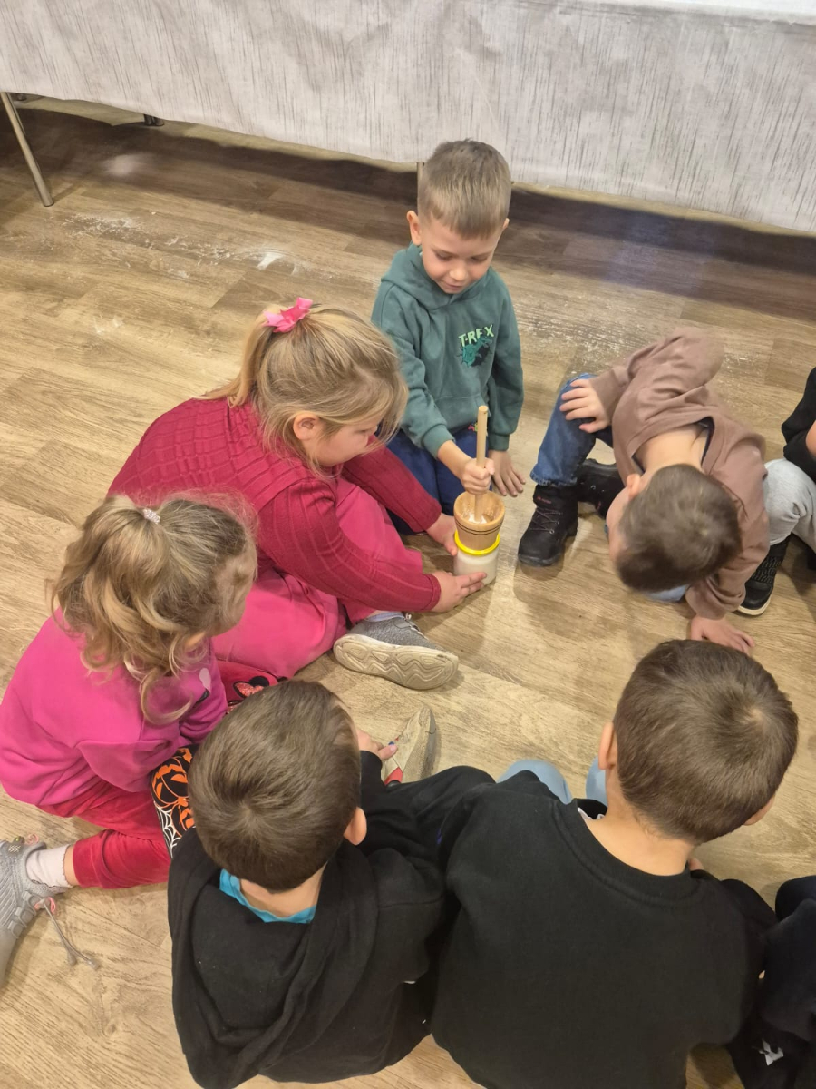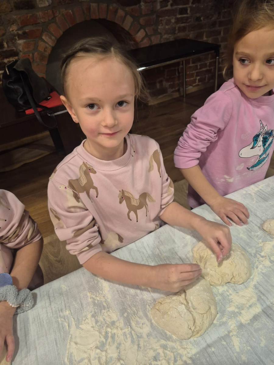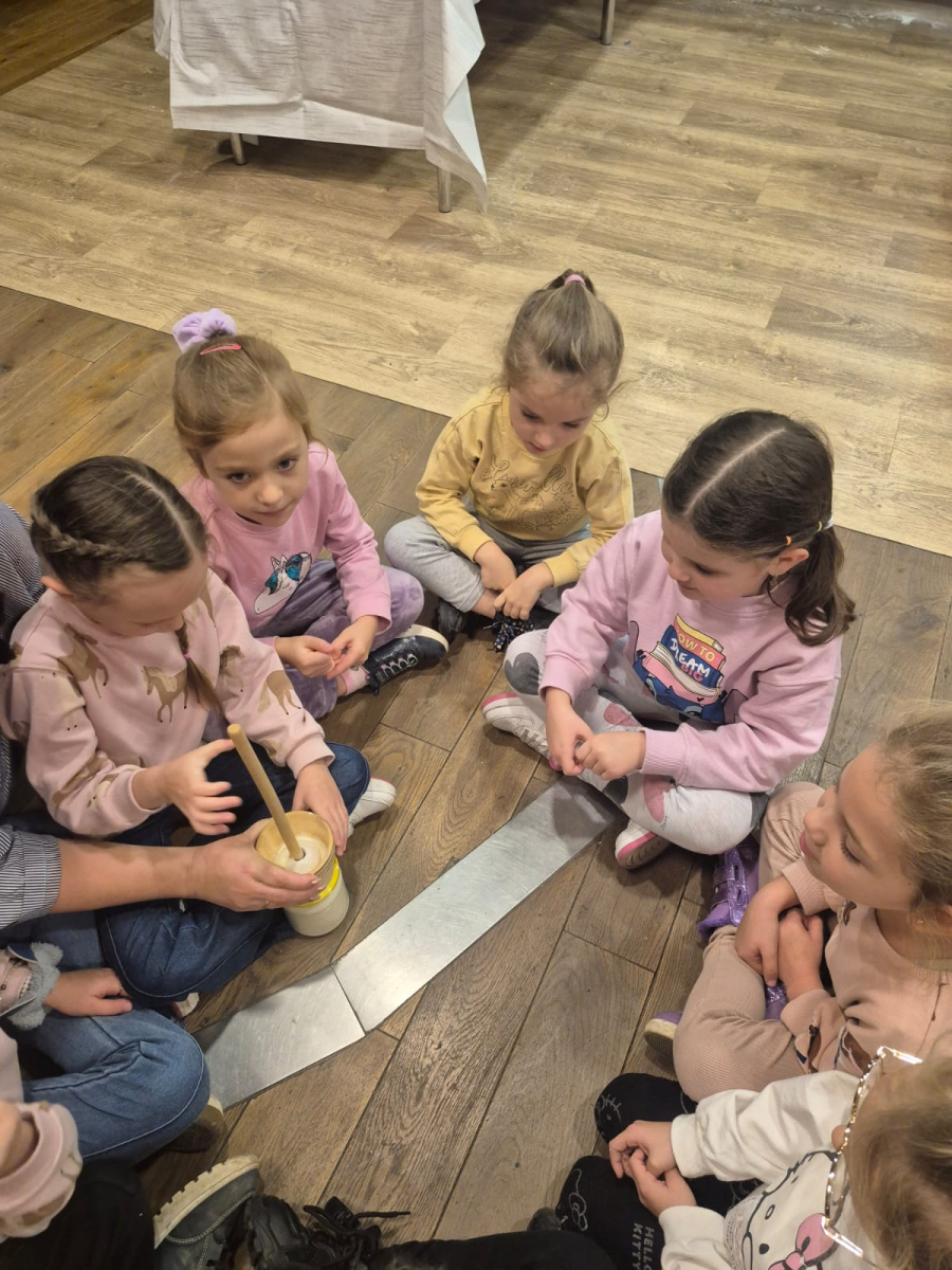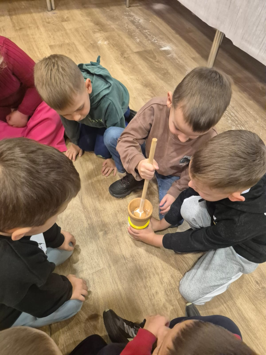 Najmłodsi z zaciekawieniem poznawali różne rodzaje zbóż – pszenicę, żyto, jęczmień i owies. Dowiedzieli się, jak wygląda droga ziarna od pola aż do stołu – od siewu, przez mielenie zboża, aż po wypiek pachnącego chleba. Dzieci mogły wszystkiego dotknąć, powąchać i spróbować swoich sił w wyrabianiu ciasta, a także ubijały śmietanę, by zrobić prawdziwe masło, co sprawiło im ogromną radość.